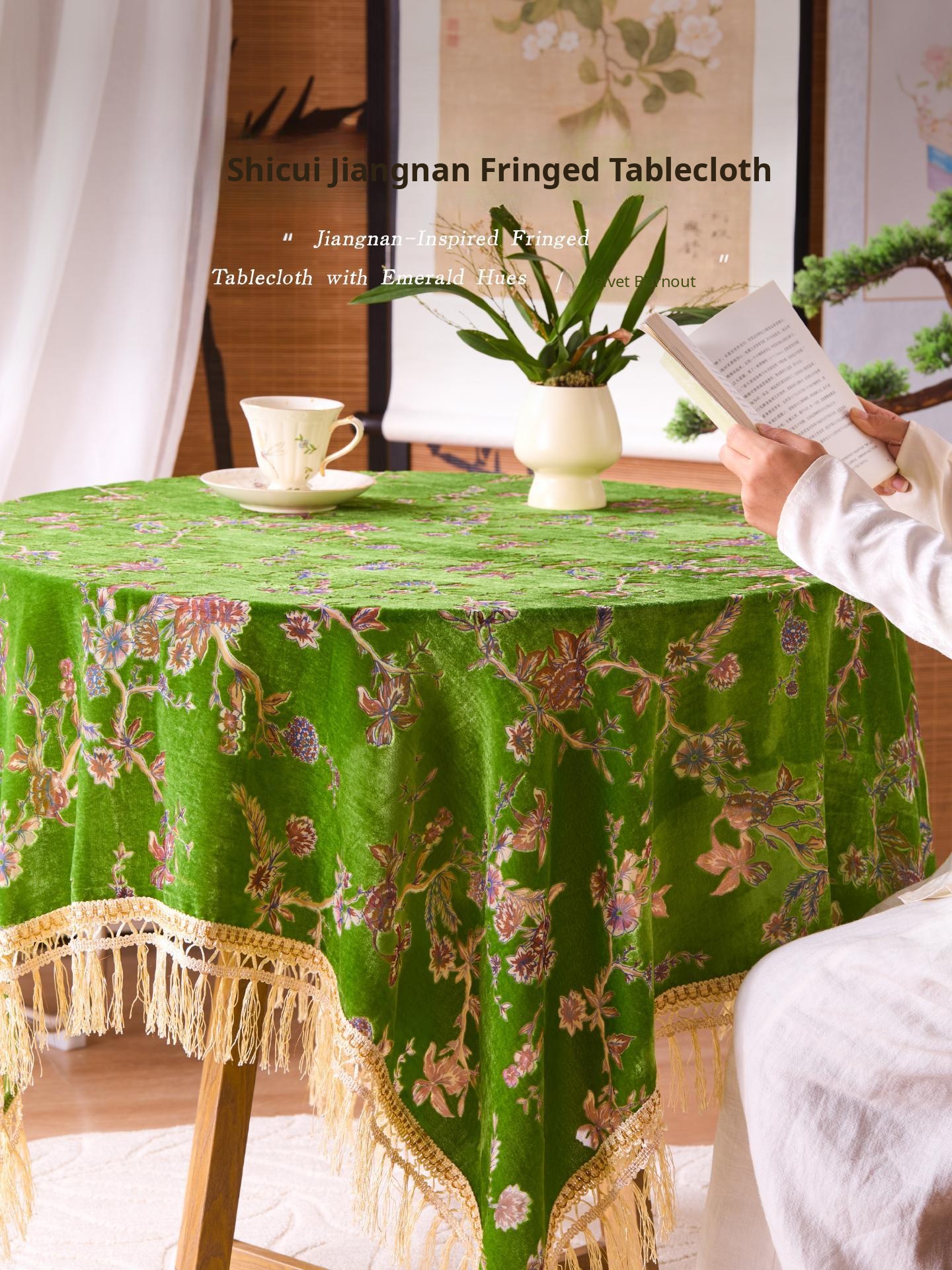 Caviosen Green Forest Style Tassel Tablecloth - Waterproof, Oil-Resistant, and Luxurious Round Dining Table Cover for Elegant Dining Experience
