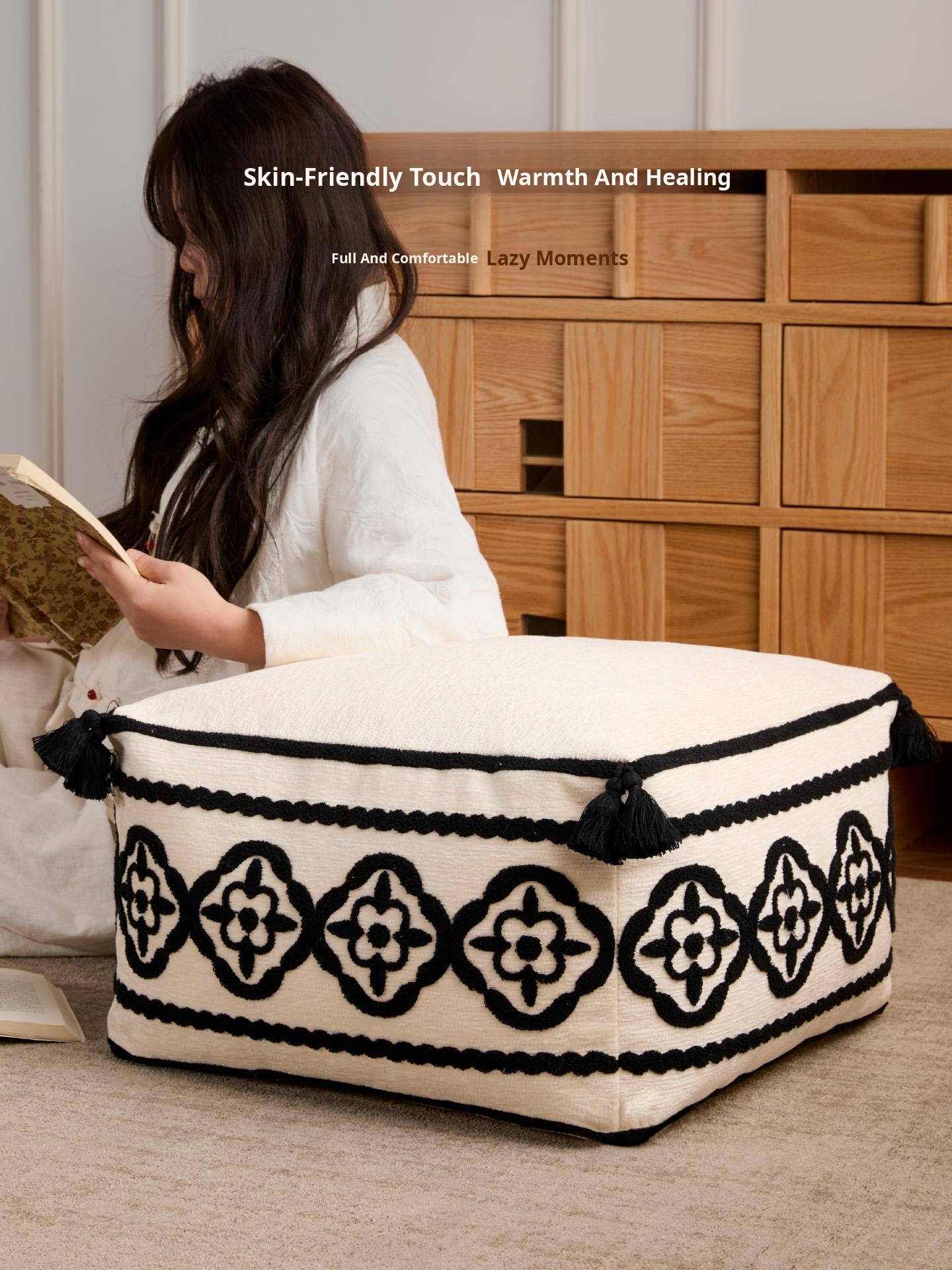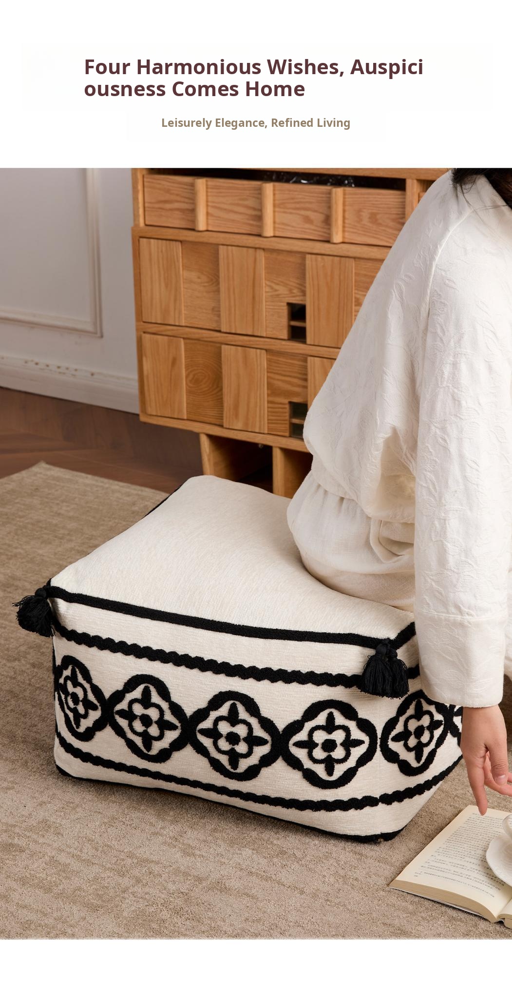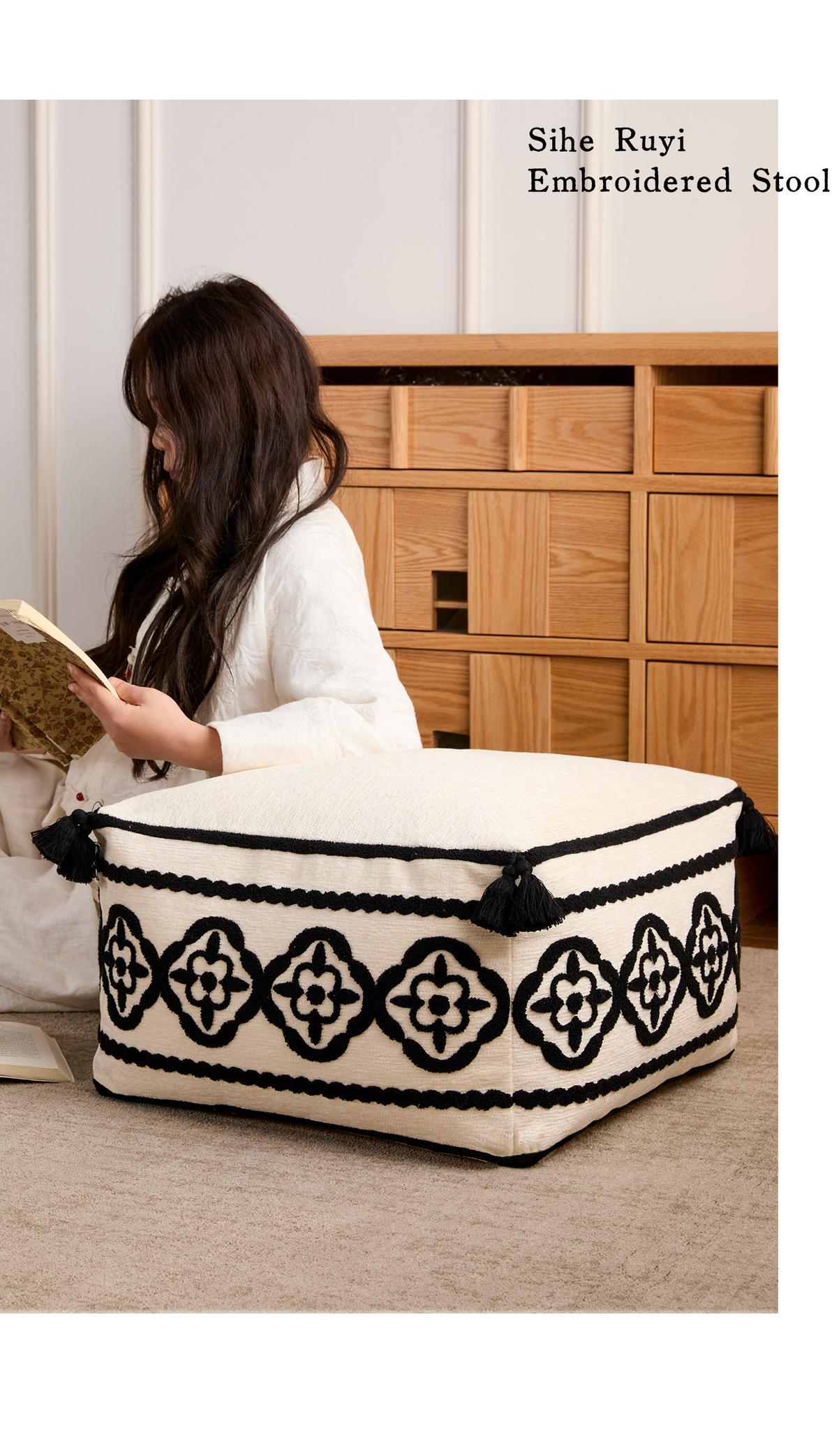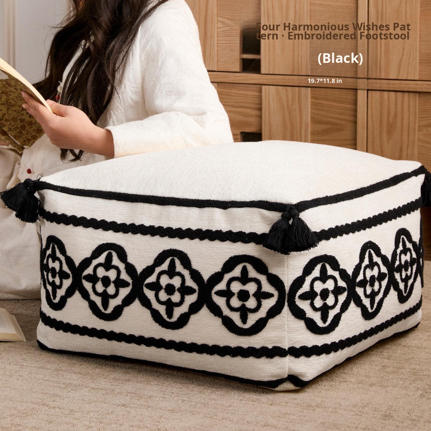 Four-Directional Auspicious Pattern Embroidered Pouf - Black