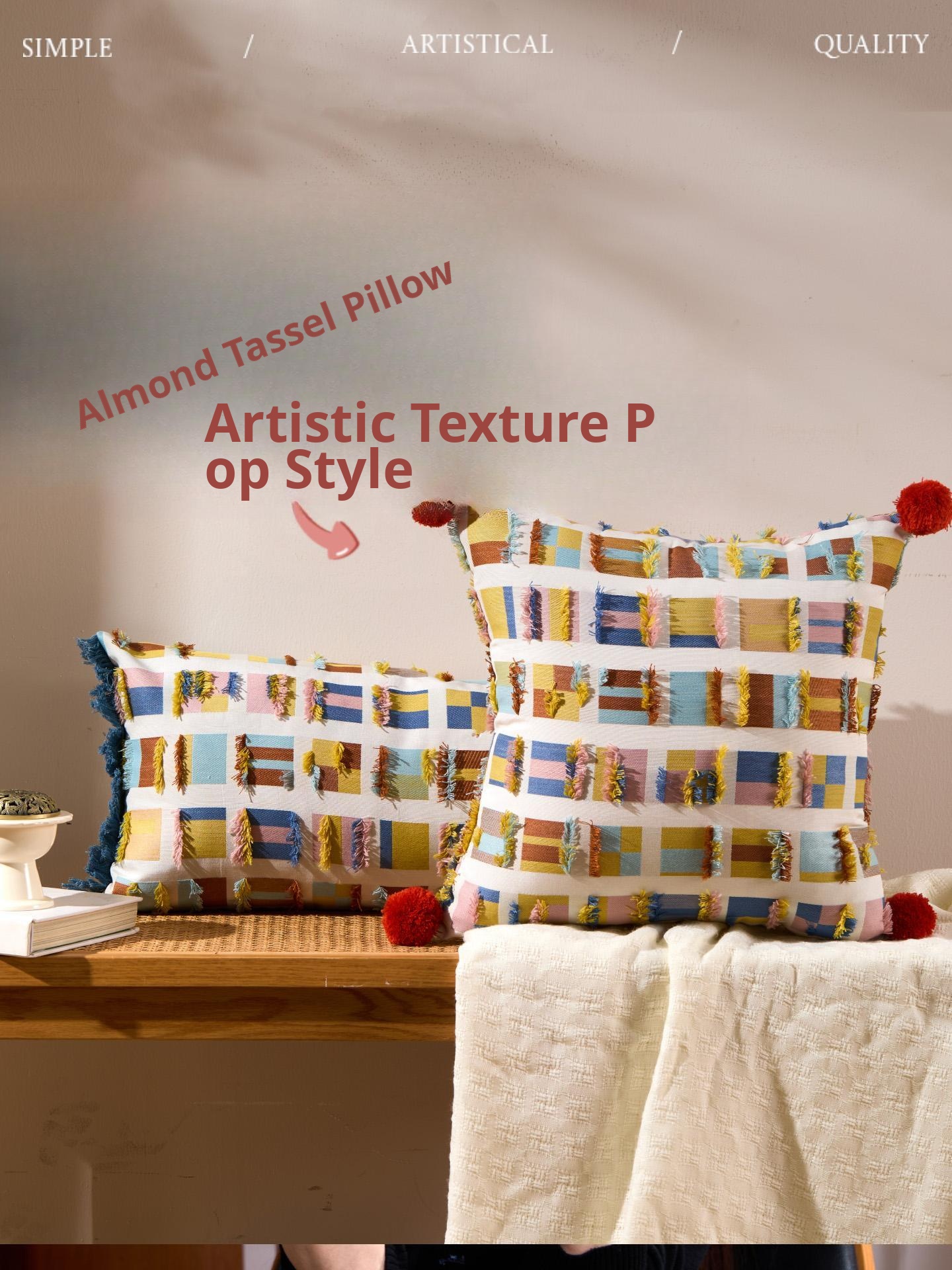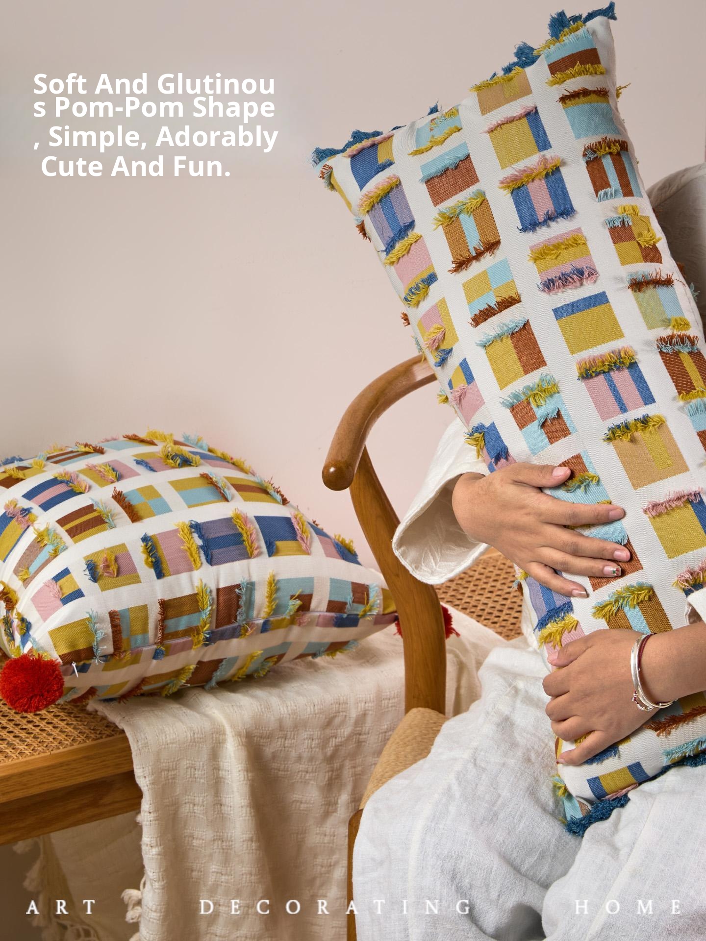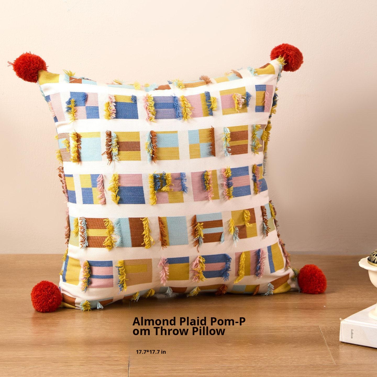 Almond plaid fur ball pillow