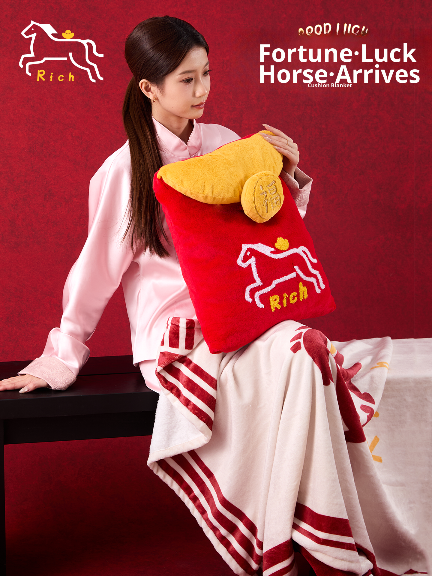 Caviosen Creative Year of the Horse Pillow Blanket - 2-in-1 Decorative Cushion for New Year, Perfect for Cozying Up and Using Your Phone in Bed!
