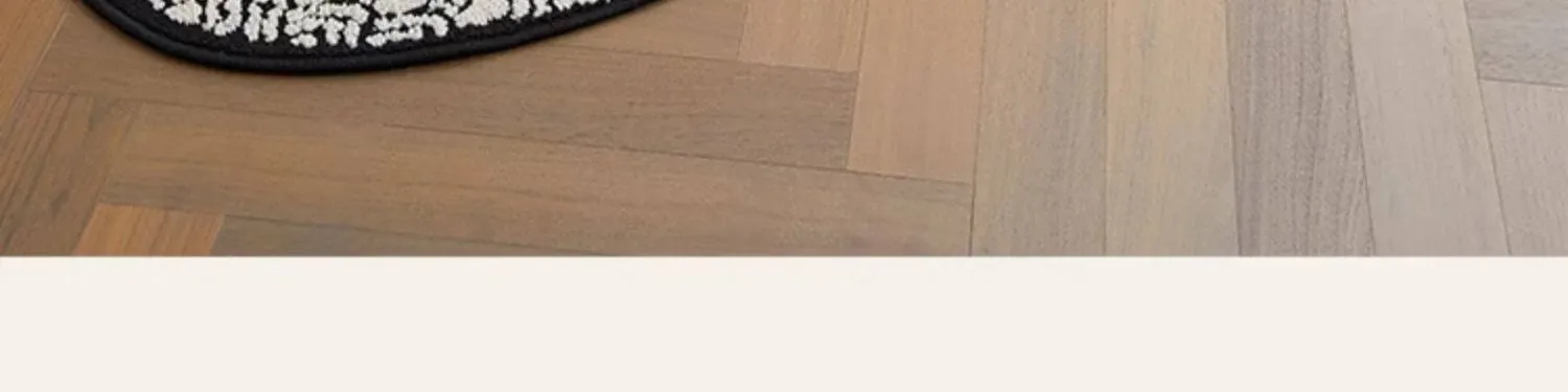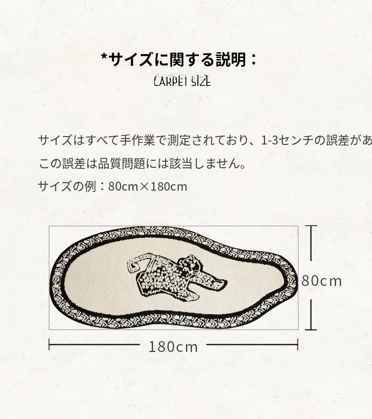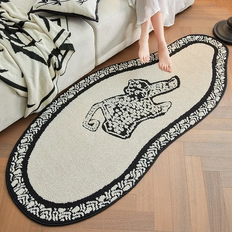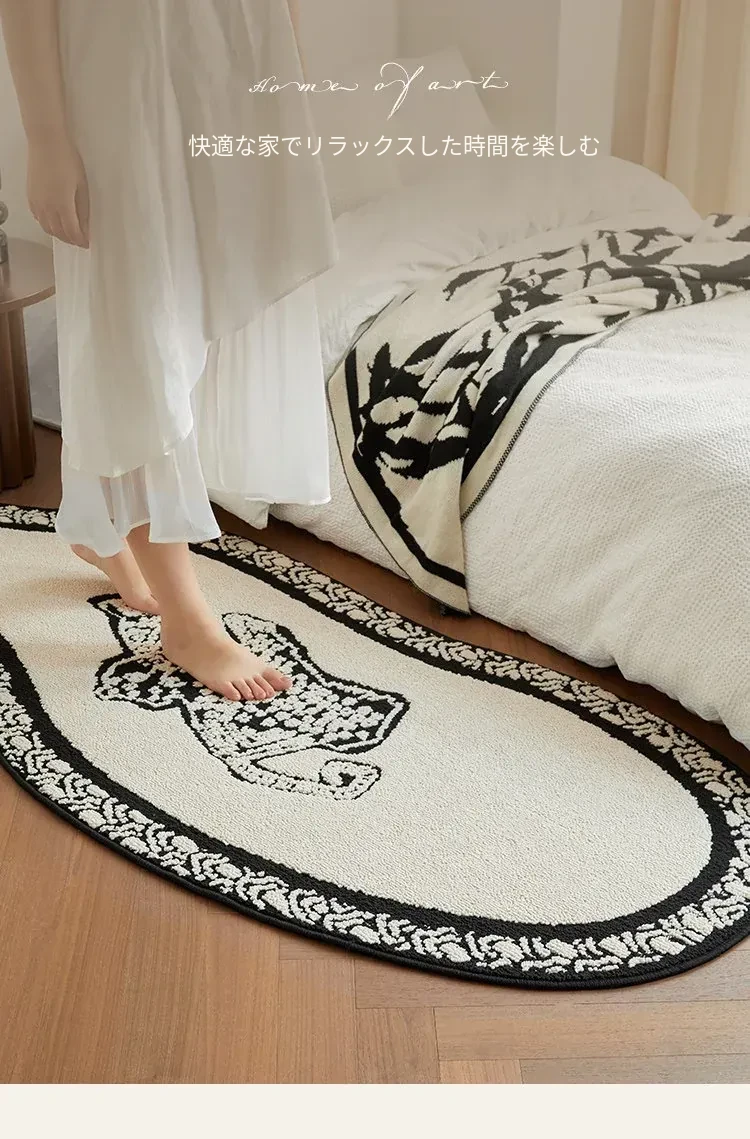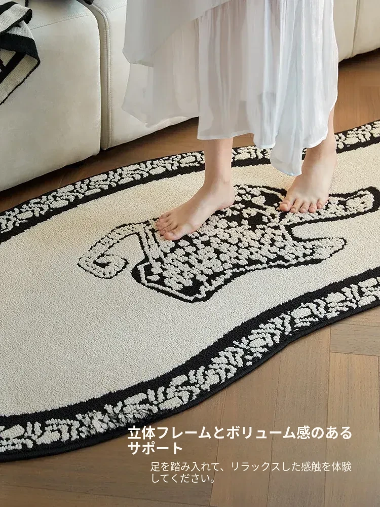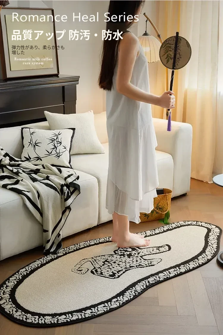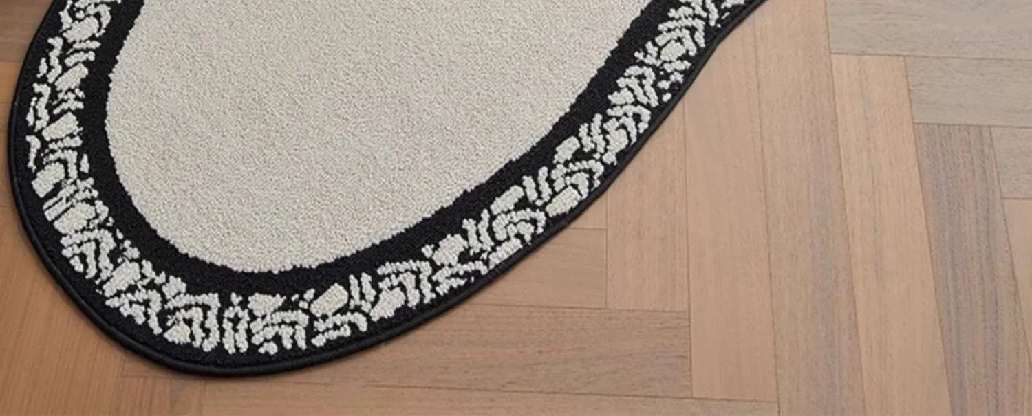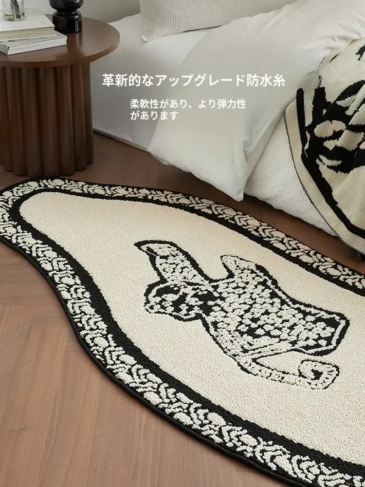 フレンチアンティーク風のブラック&ホワイト不規則形状の防水&防汚ベッドサイドマット!おしゃれで実用的、寝室やリビングにぴったりのソファやベッドのアクセントに最適です。