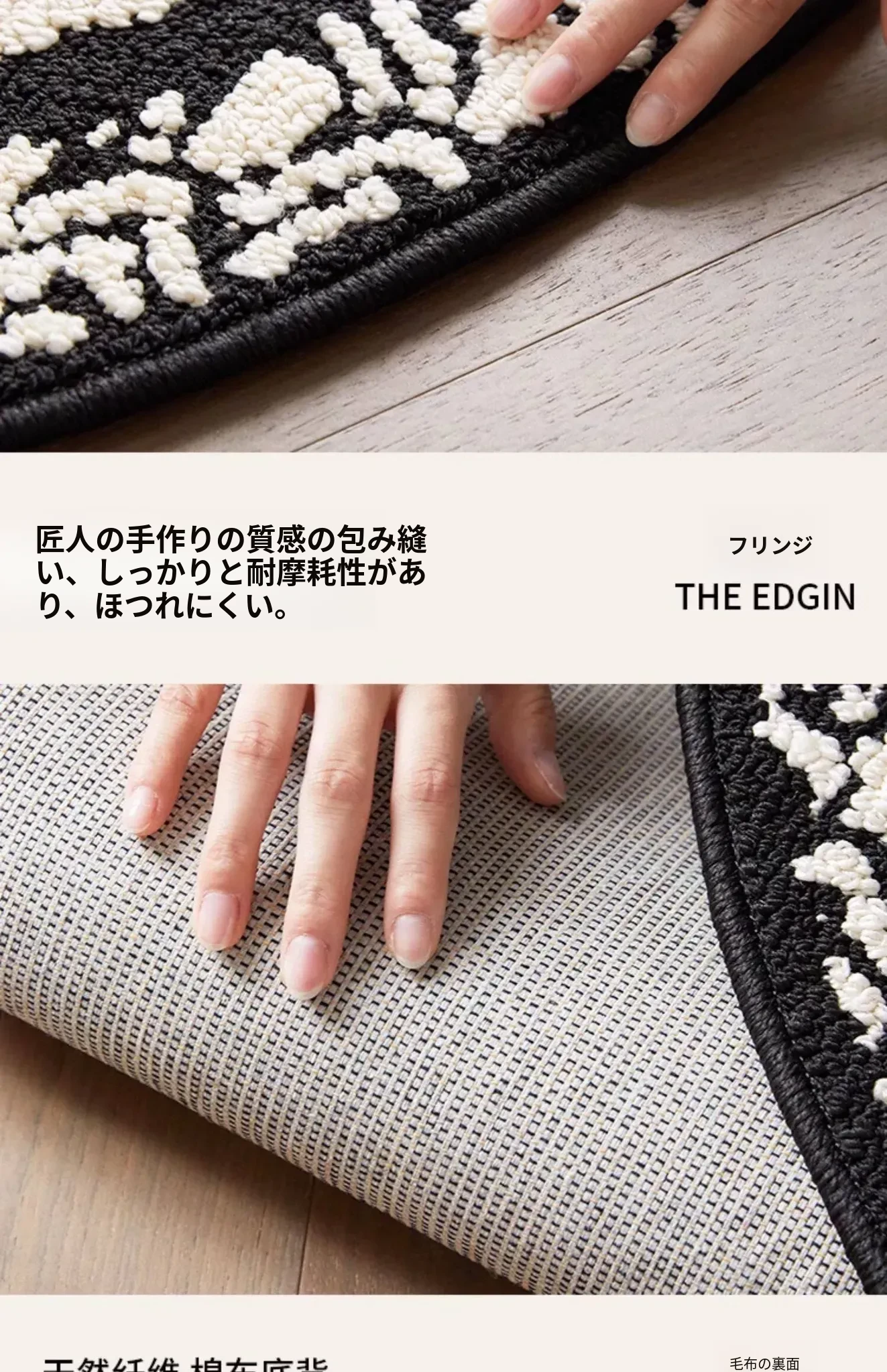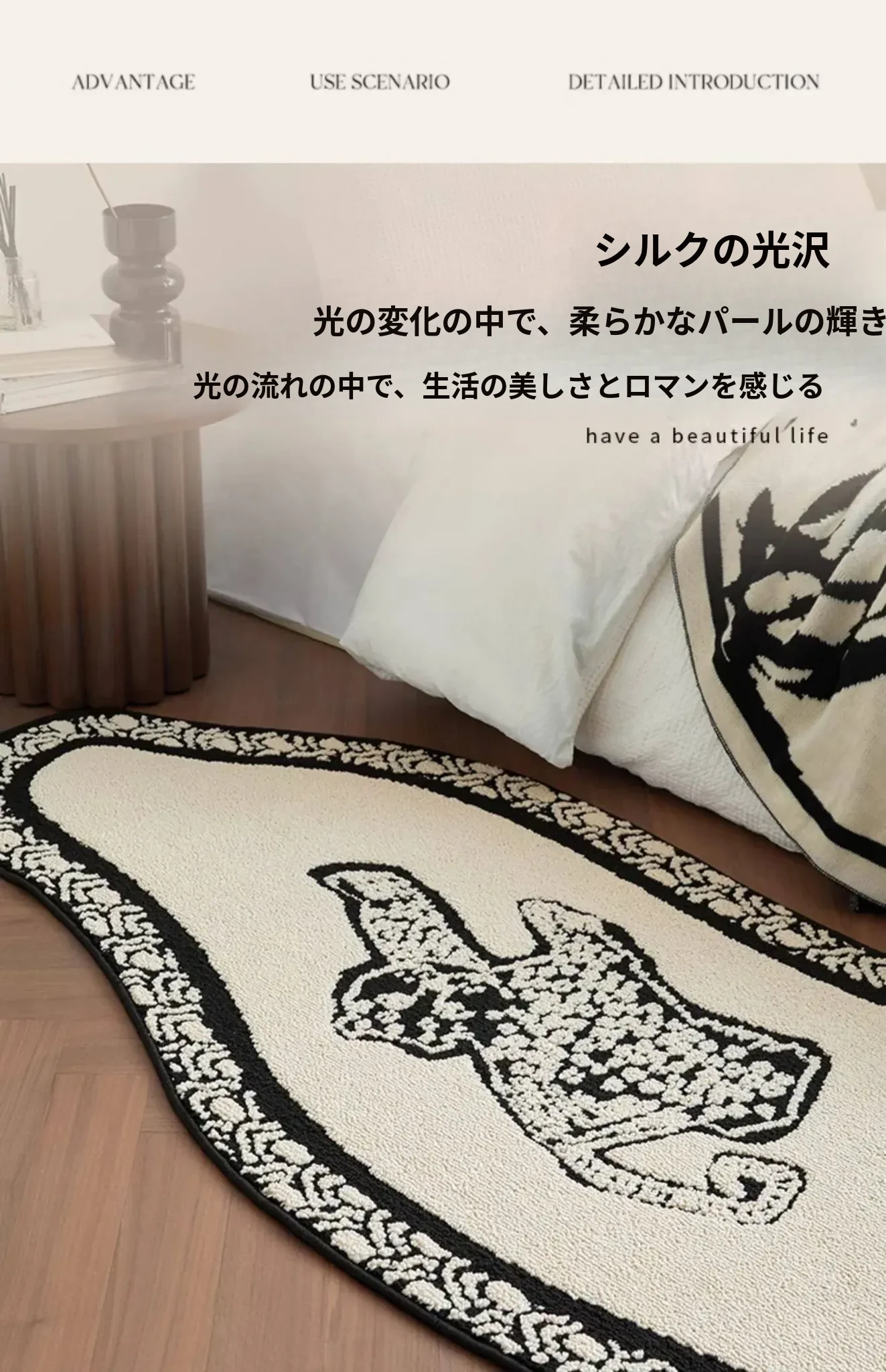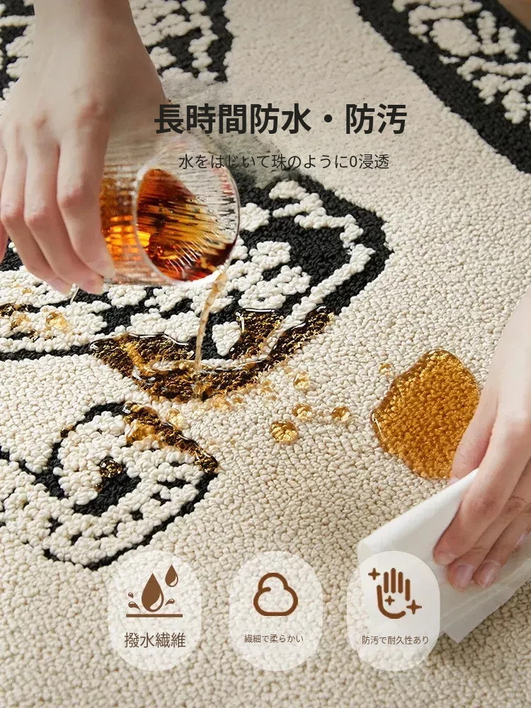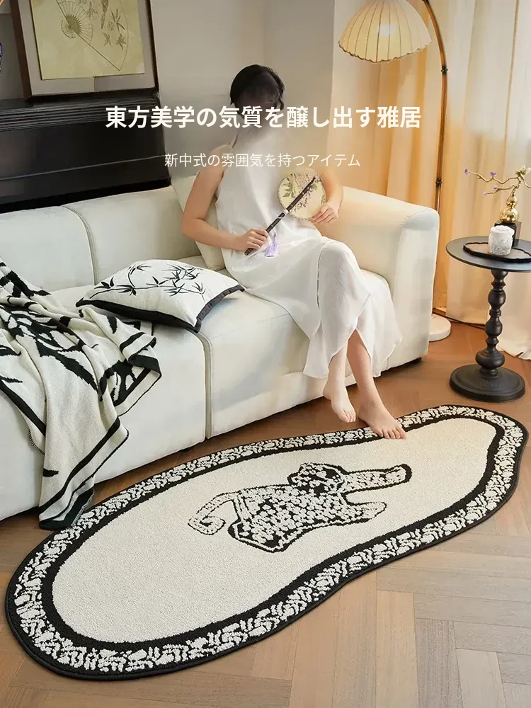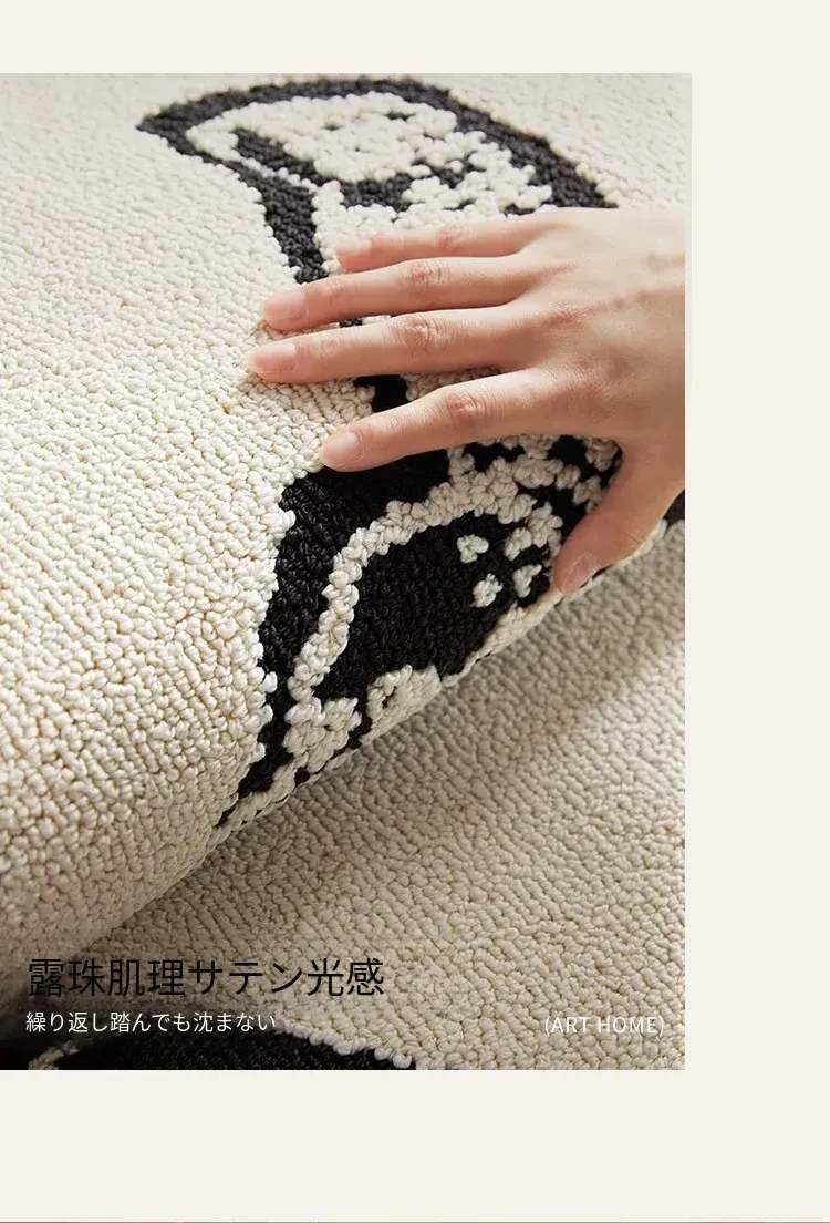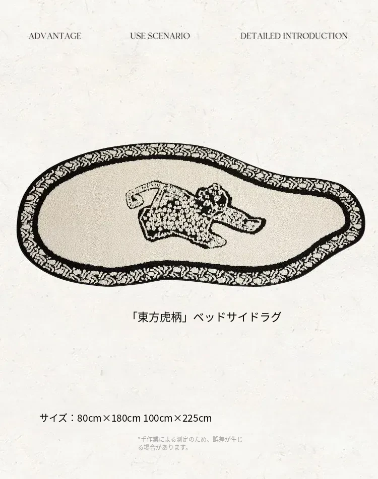 フレンチアンティーク風のブラック&ホワイト不規則形状の防水&防汚ベッドサイドマット!おしゃれで実用的、寝室やリビングにぴったりのソファやベッドのアクセントに最適です。