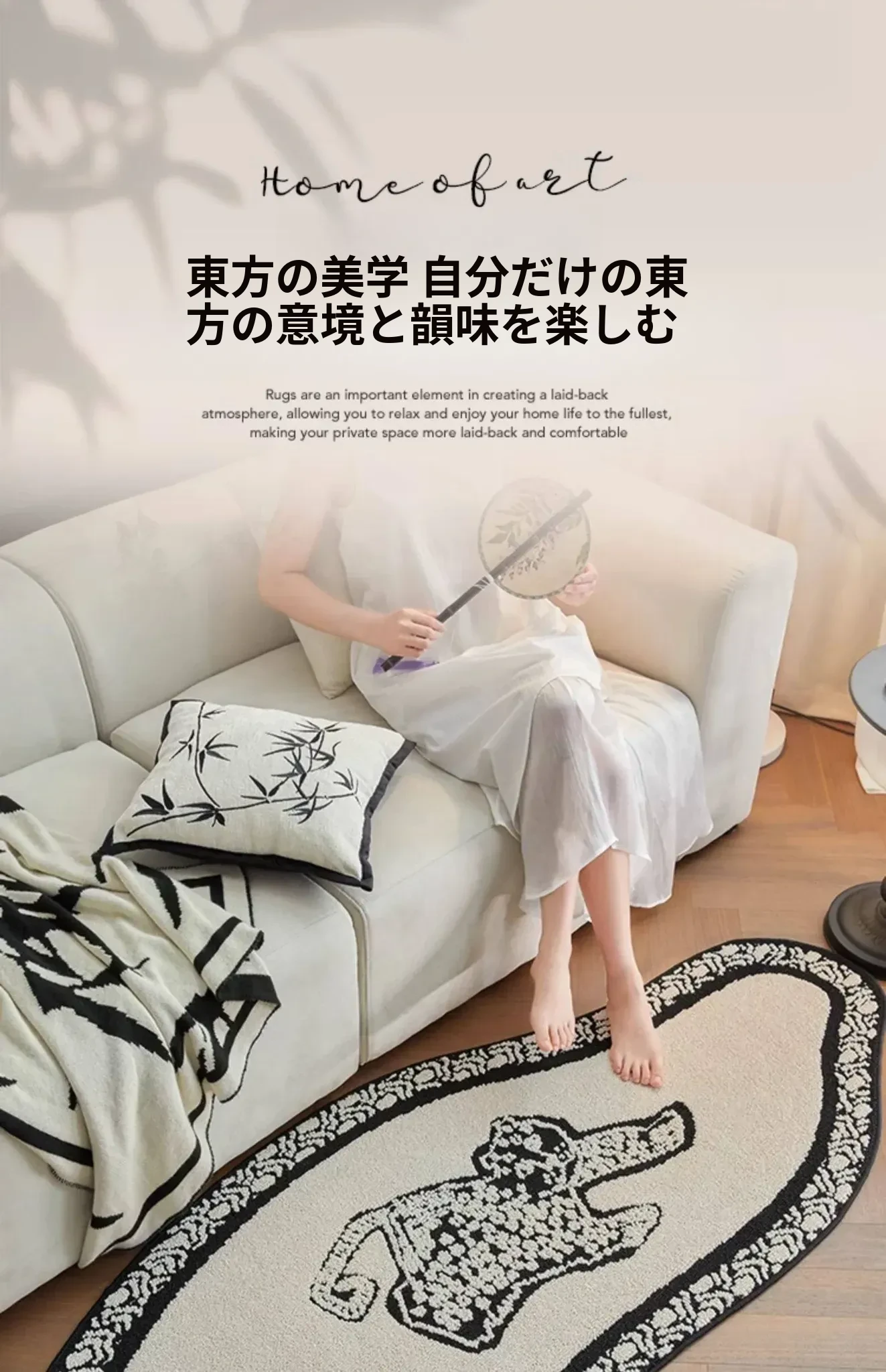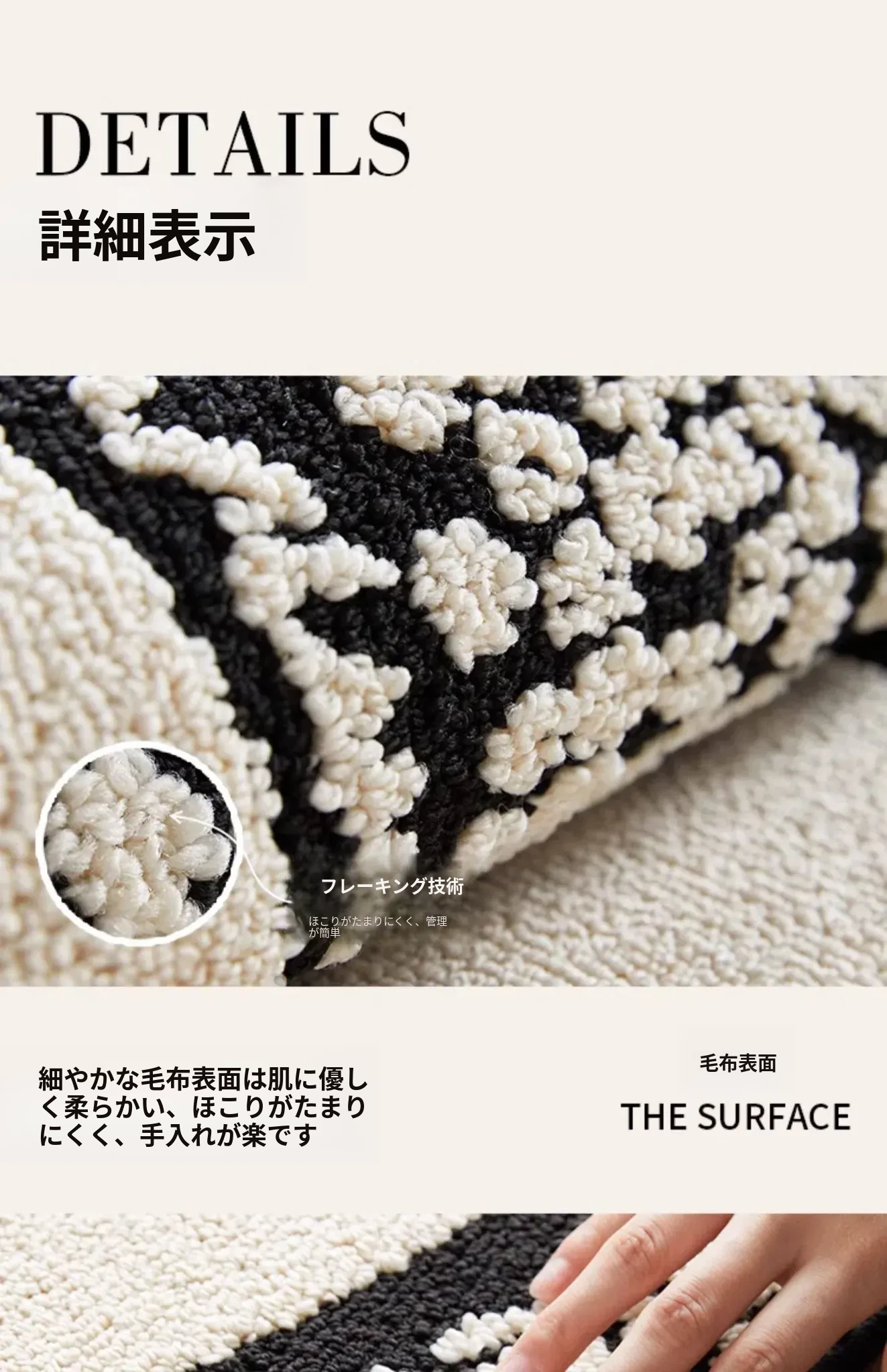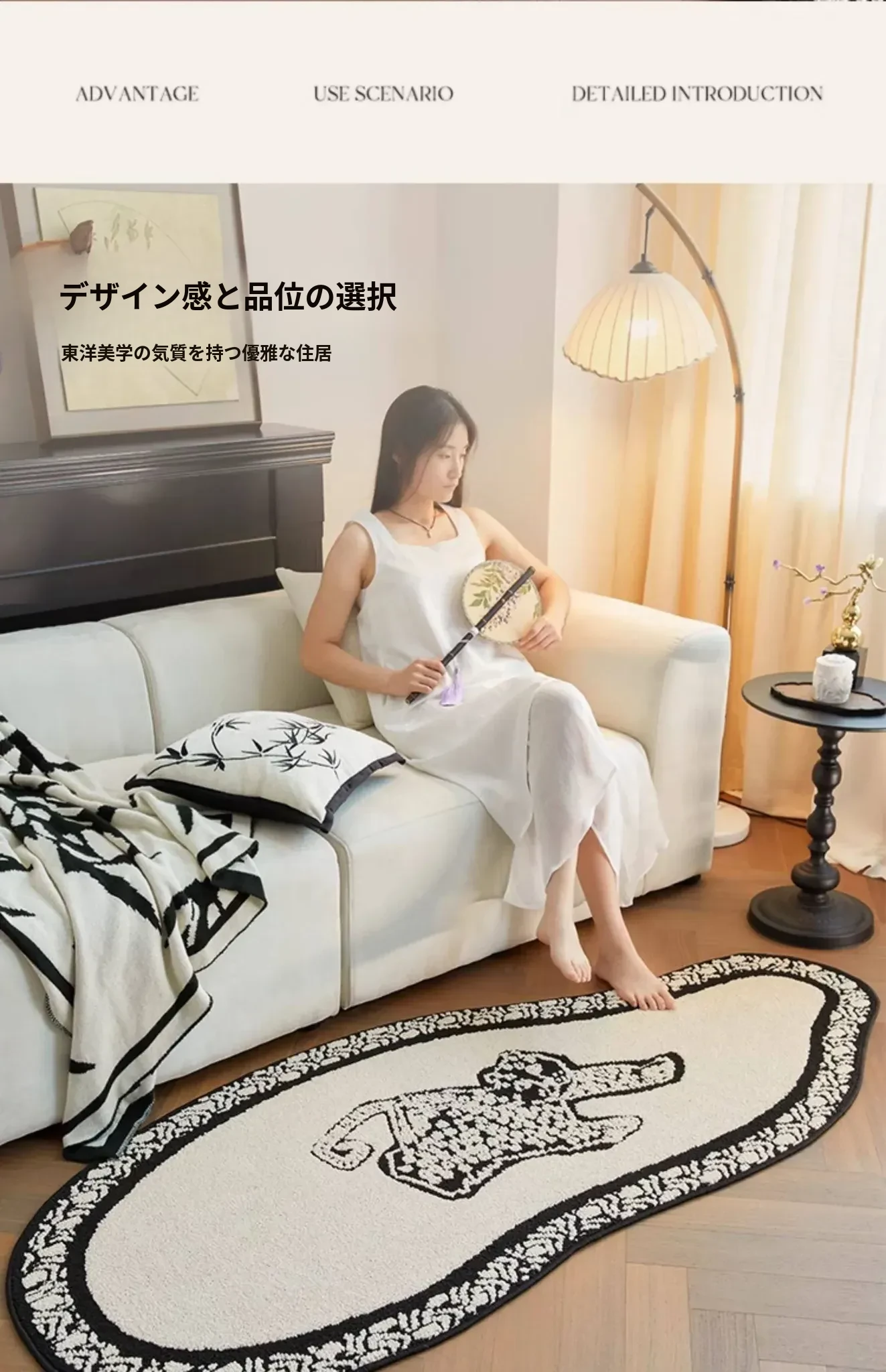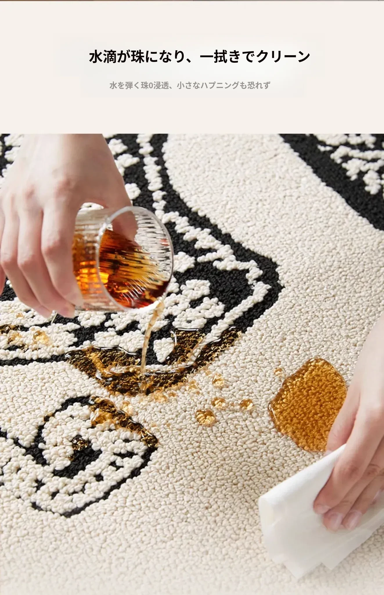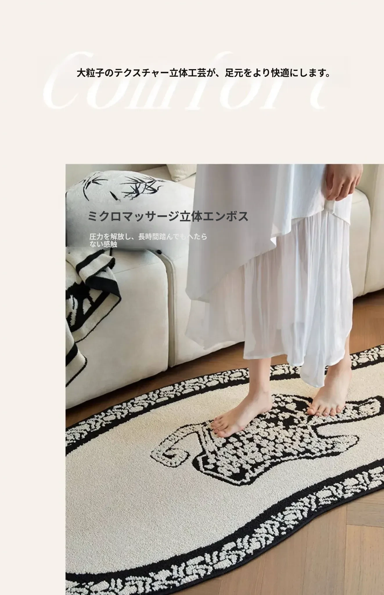 フレンチアンティーク風のブラック&ホワイト不規則形状の防水&防汚ベッドサイドマット!おしゃれで実用的、寝室やリビングにぴったりのソファやベッドのアクセントに最適です。
