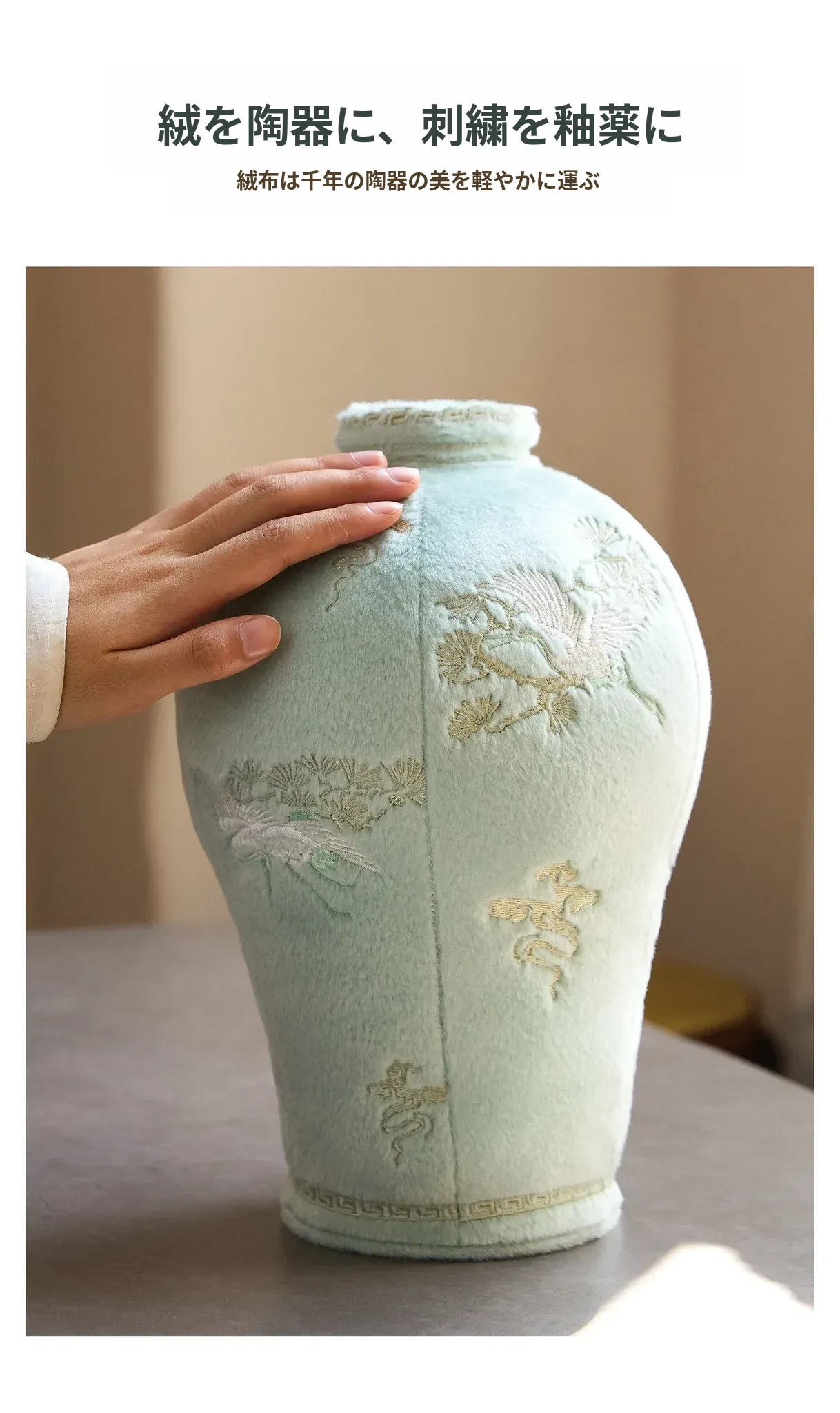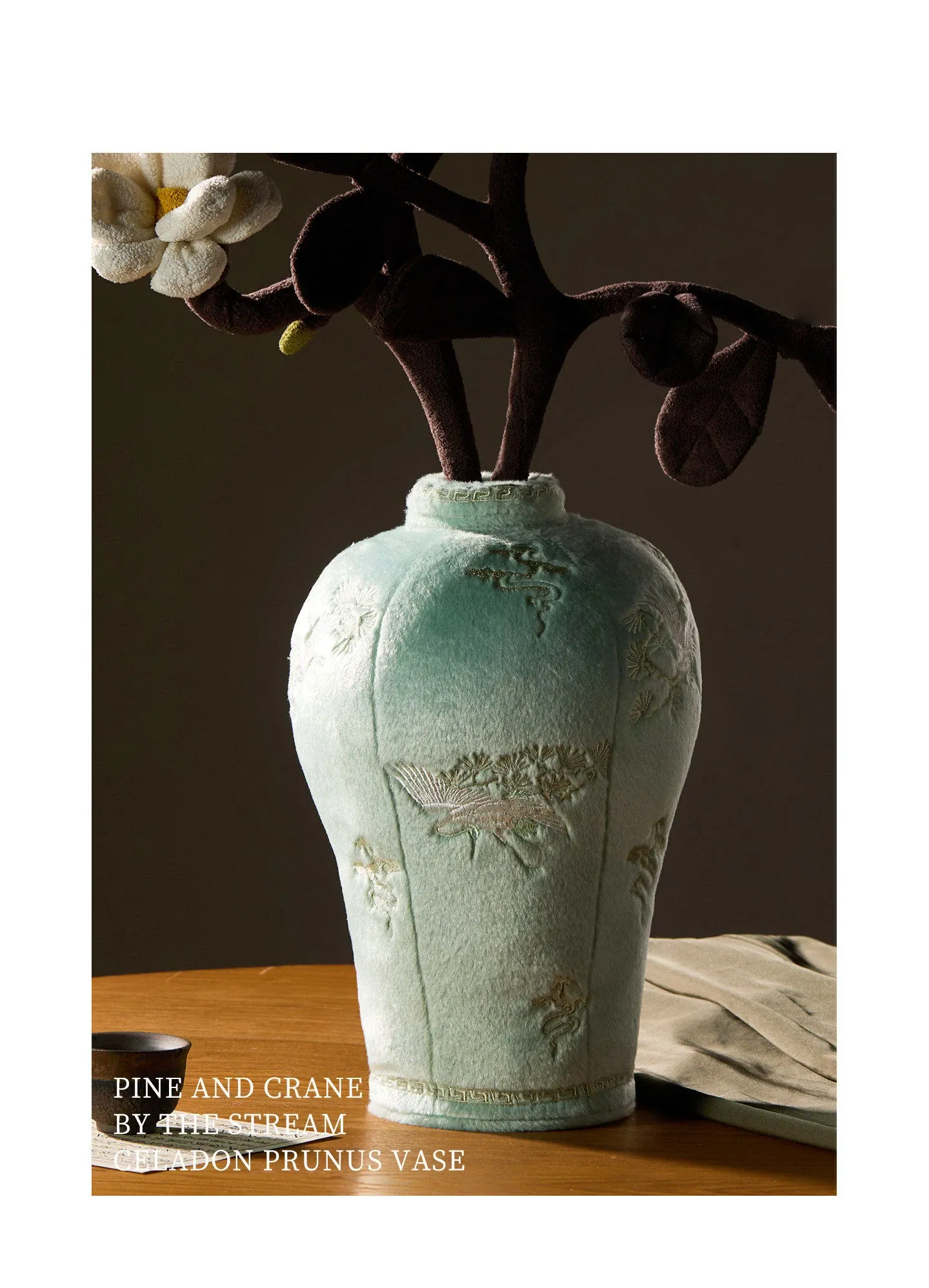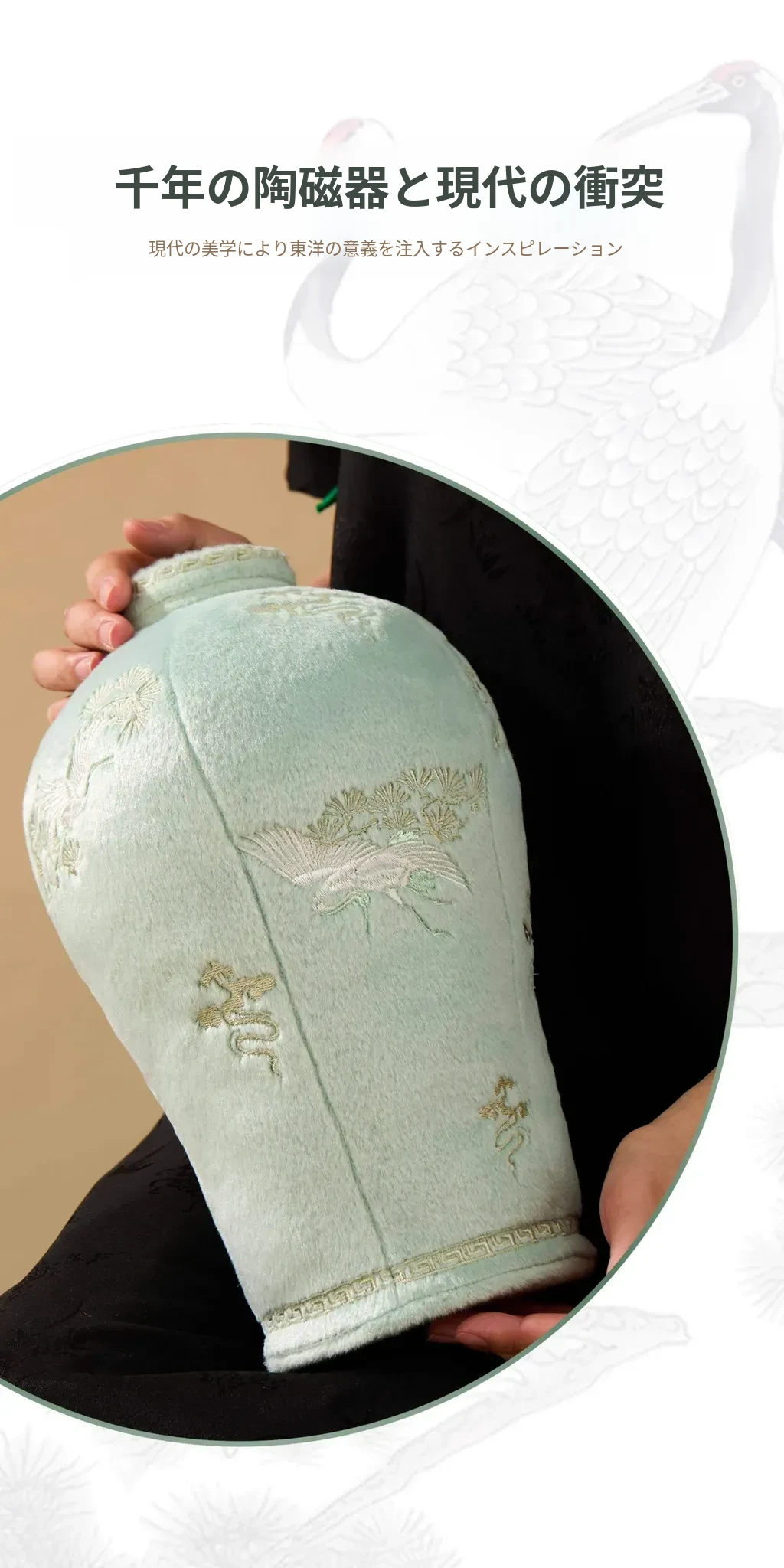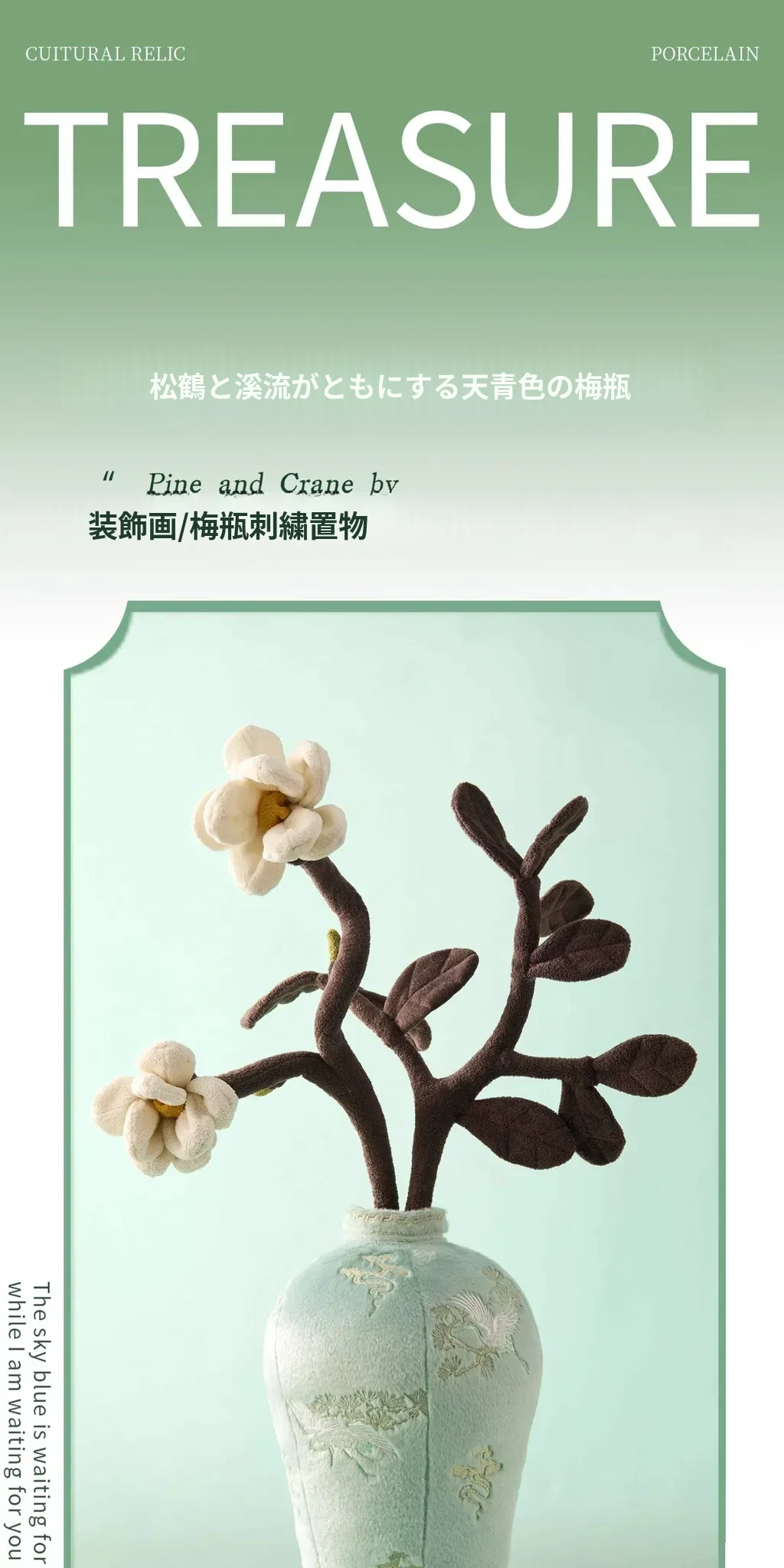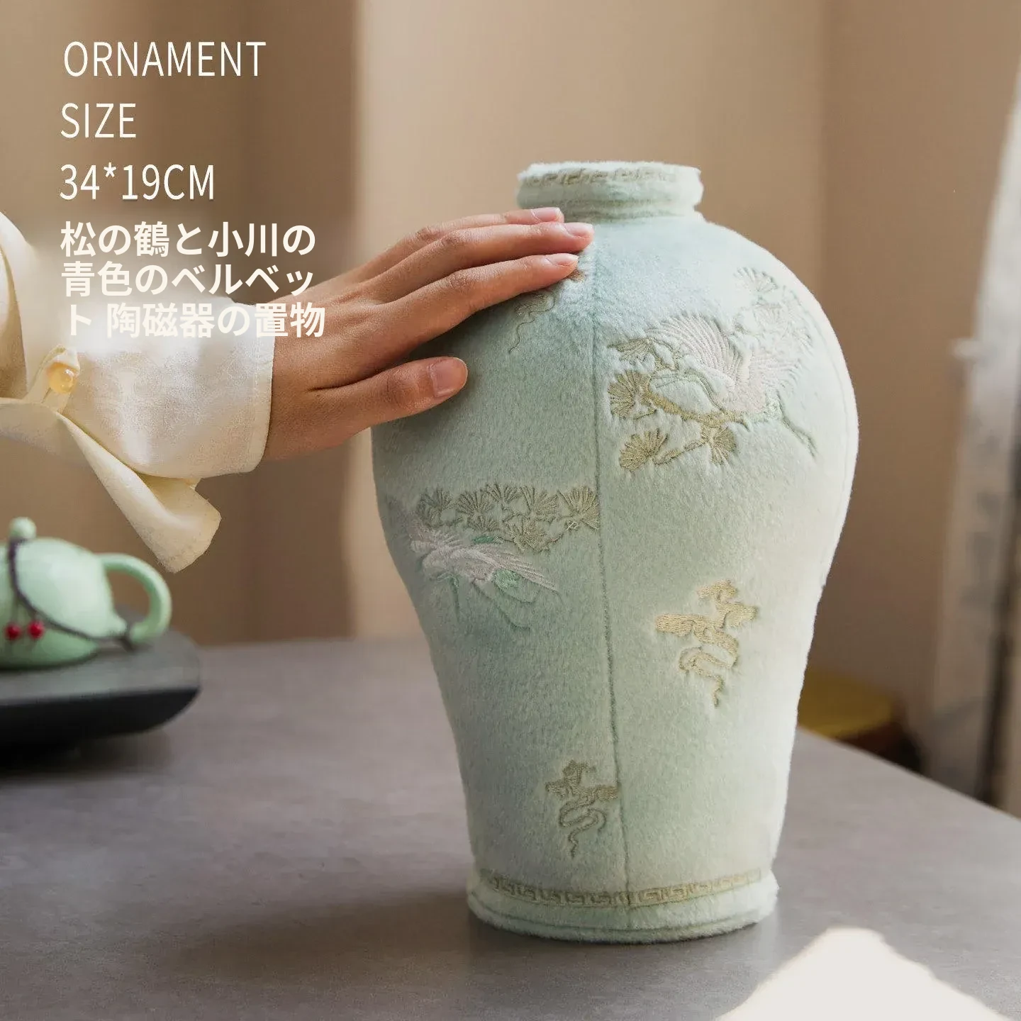 松鶴と渓流の天青色のビロード・ビロード陶器の置物