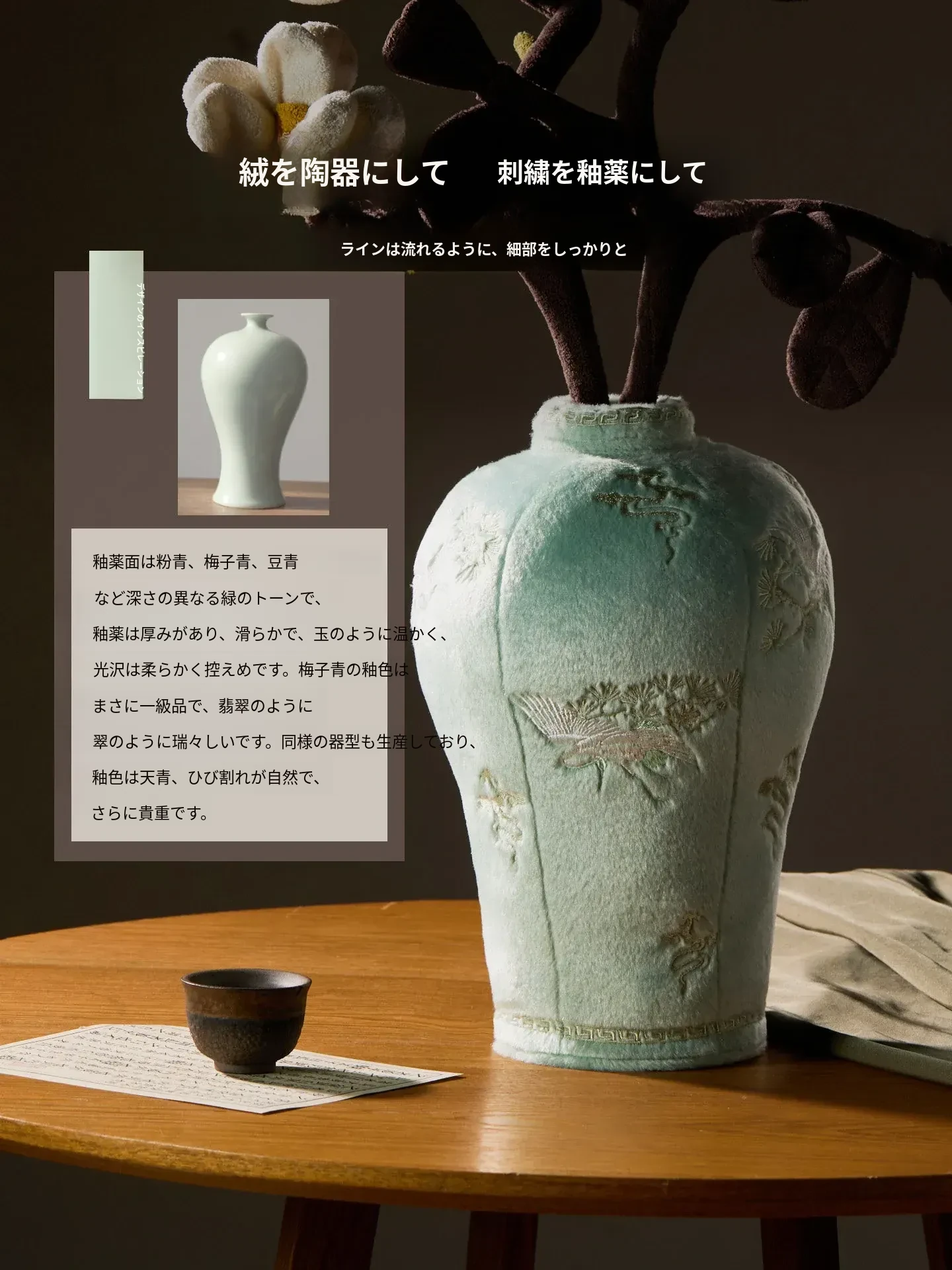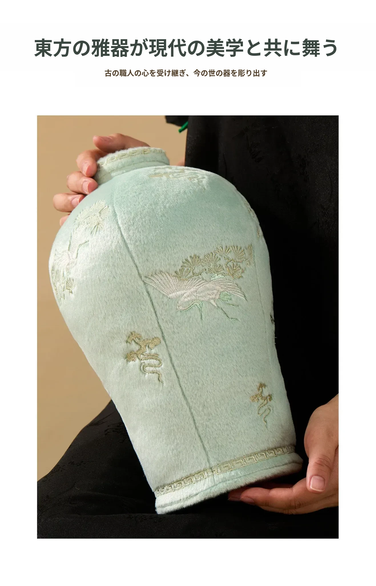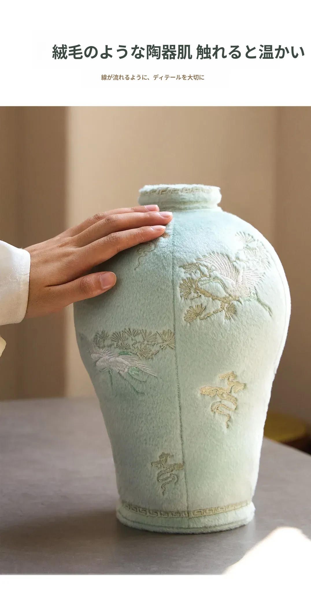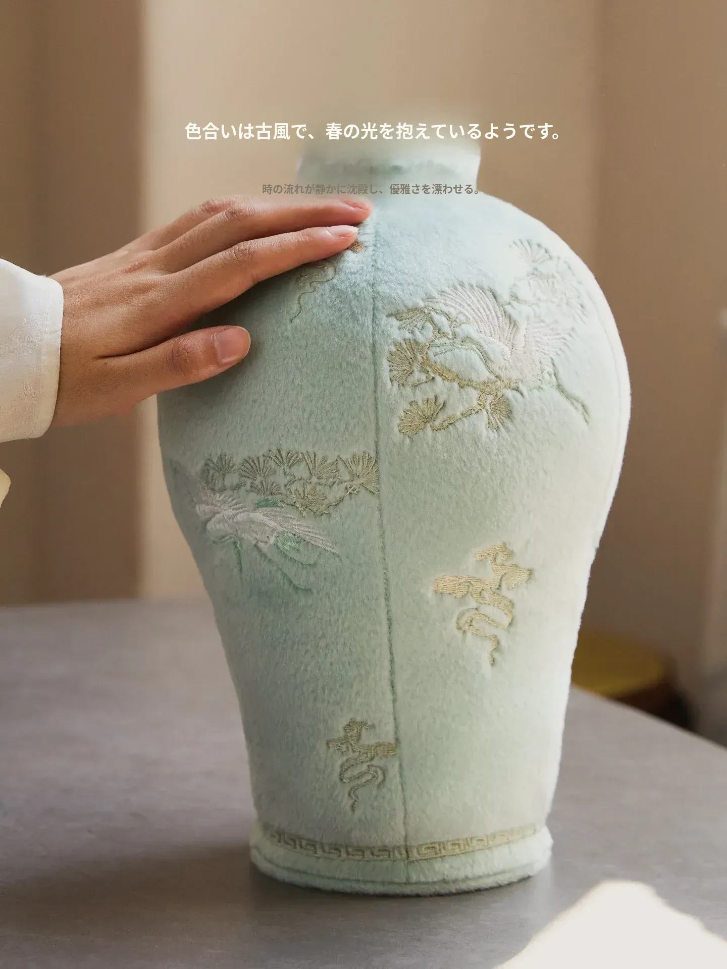 松鶴と渓流の天青色のビロード・ビロード陶器の置物