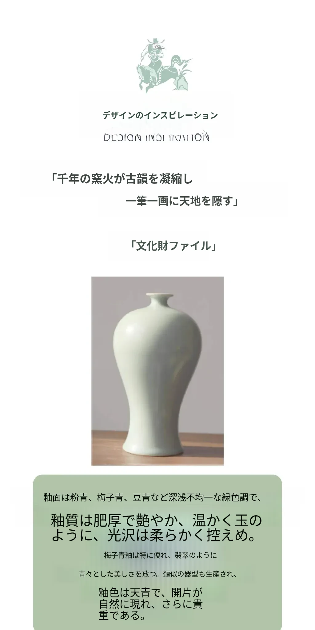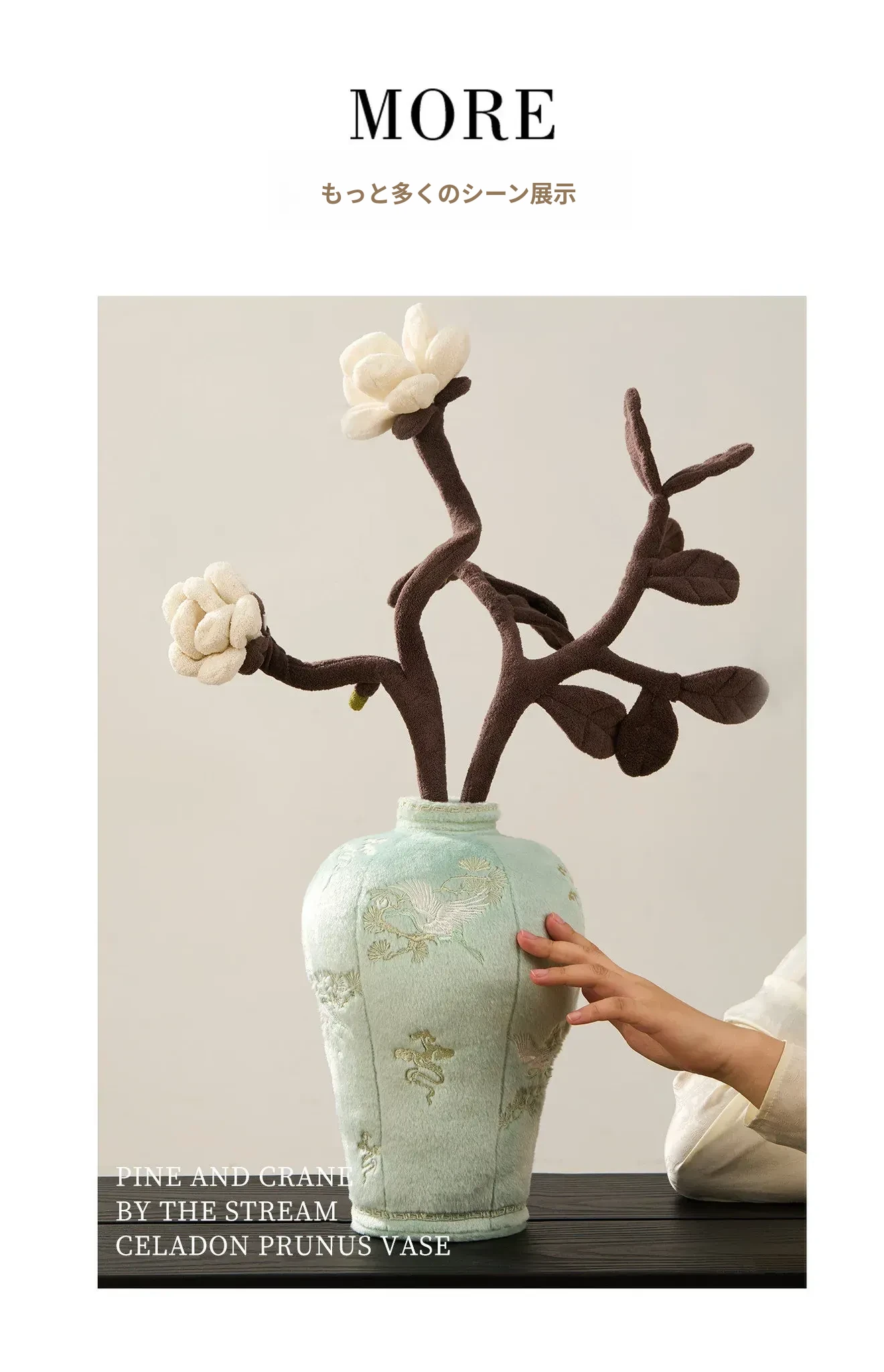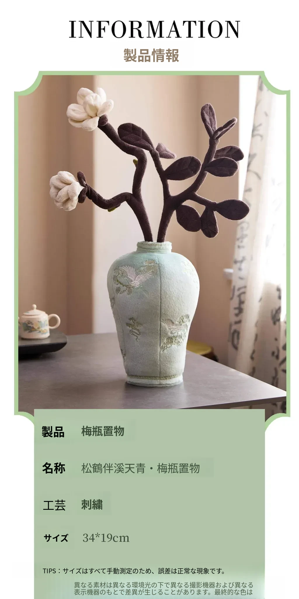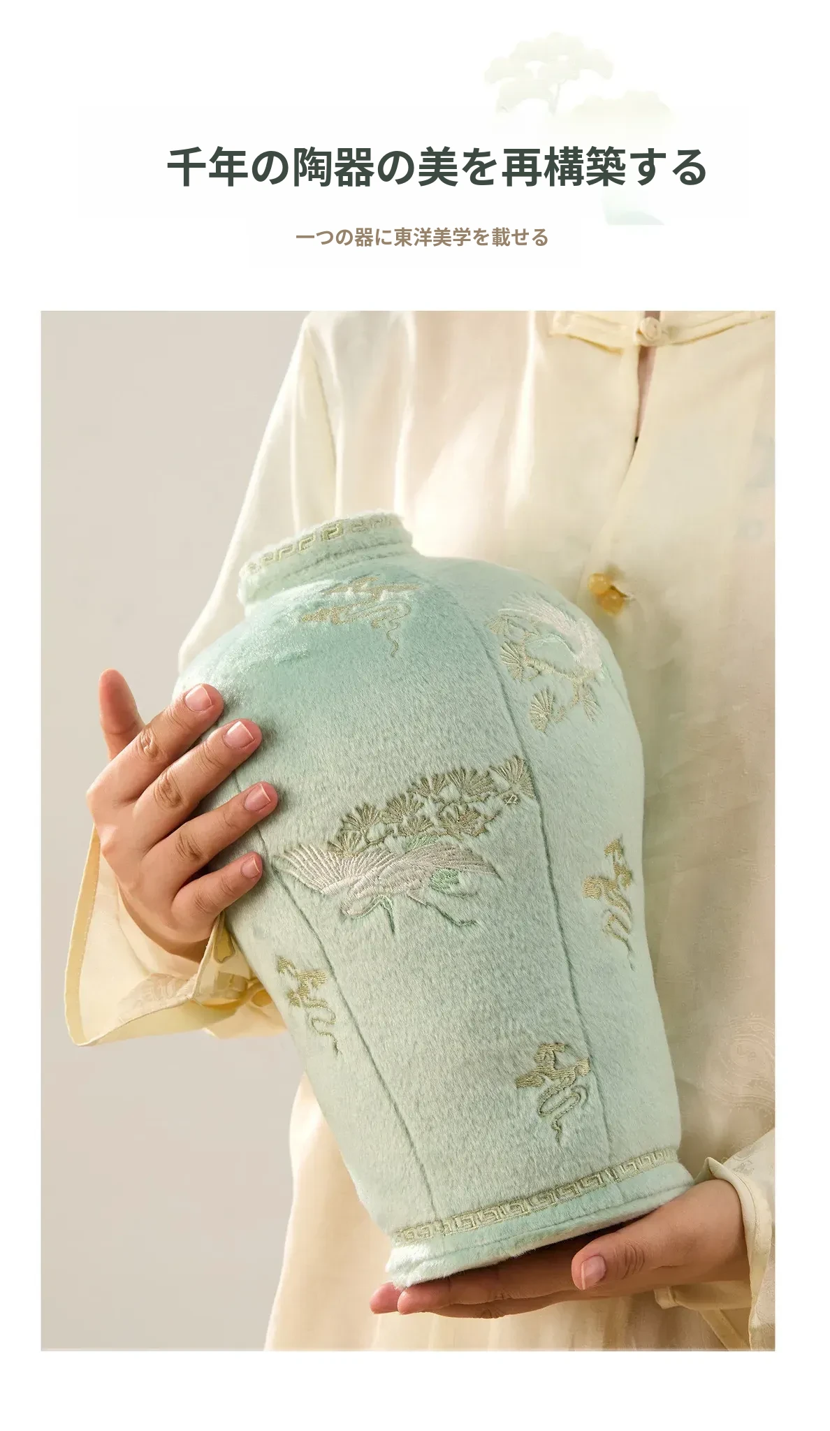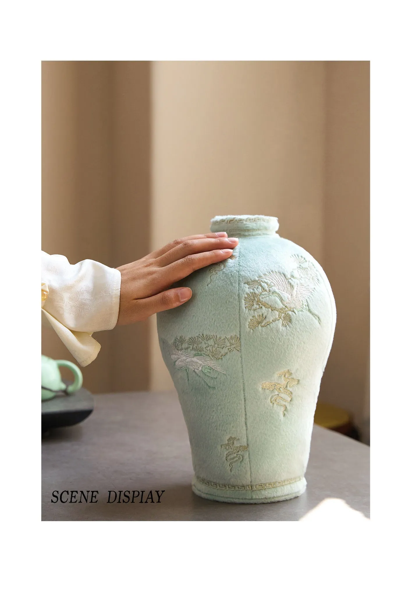松鶴と渓流の天青色のビロード・ビロード陶器の置物