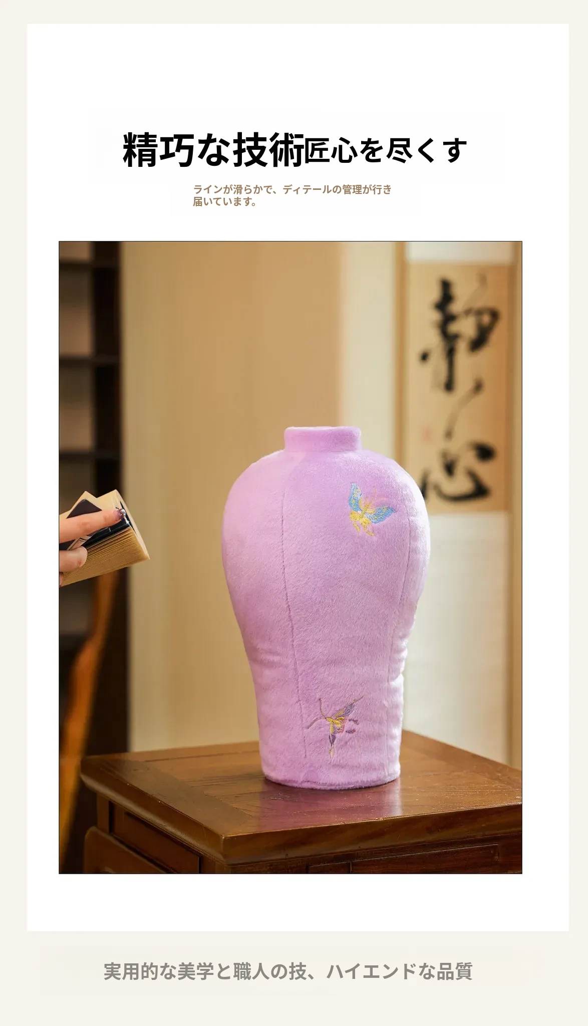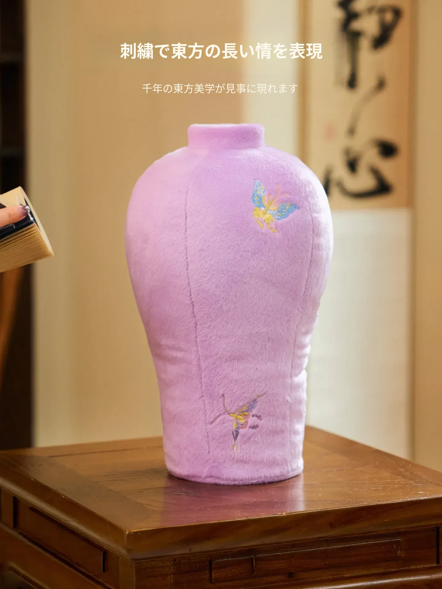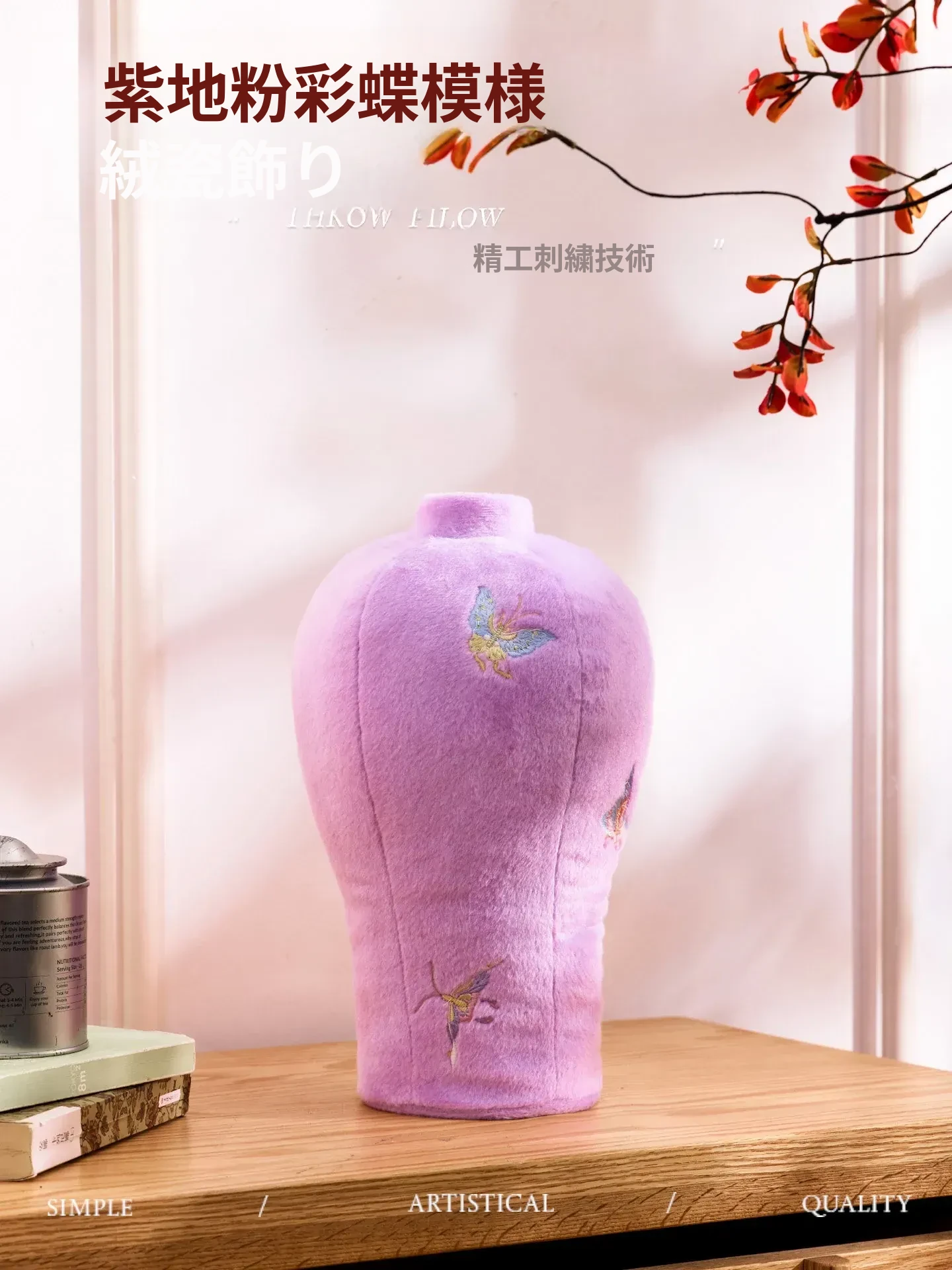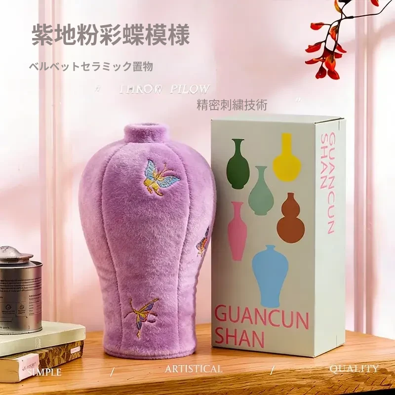 カビオセン刺繍フラワーベースクッション - 和風の紫色の蝶デザインで、リビングルームを華やかに彩るインテリアアイテム。おしゃれな花を活けて、心地よい空間を演出します!