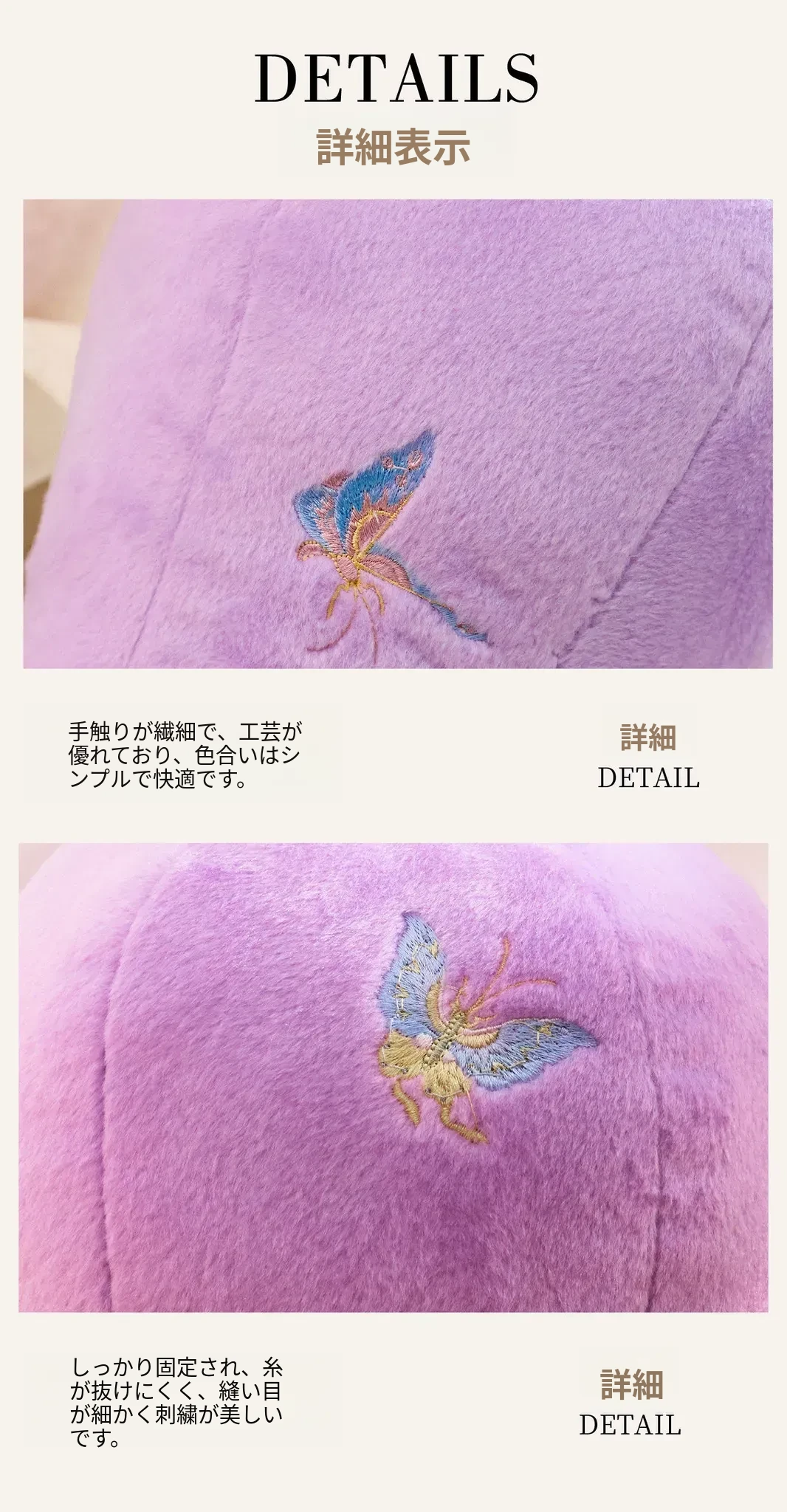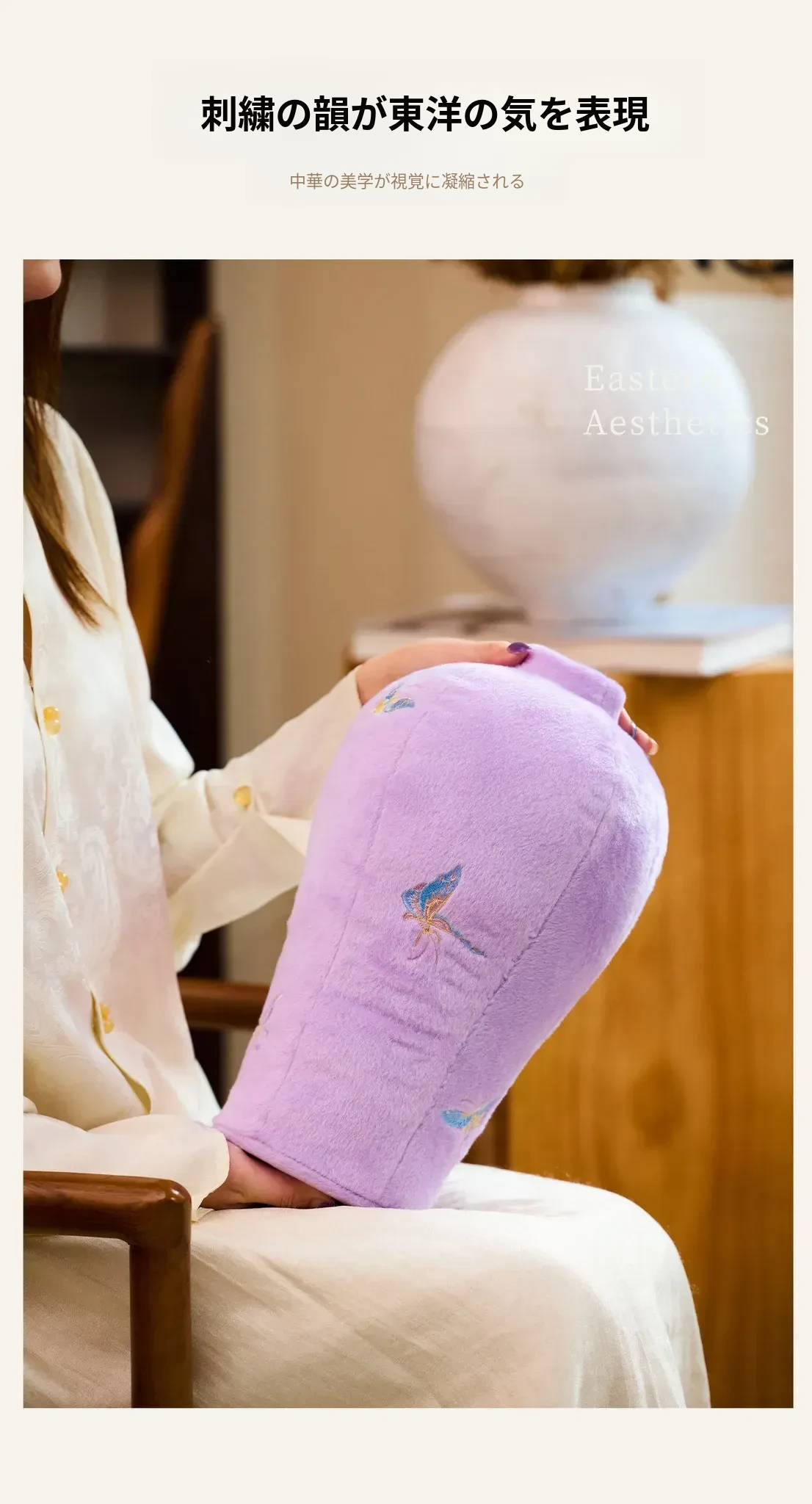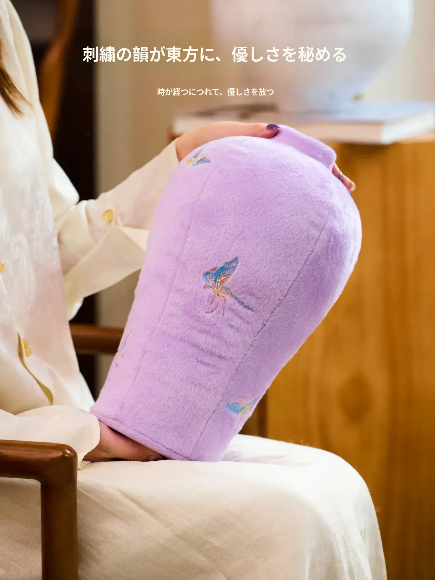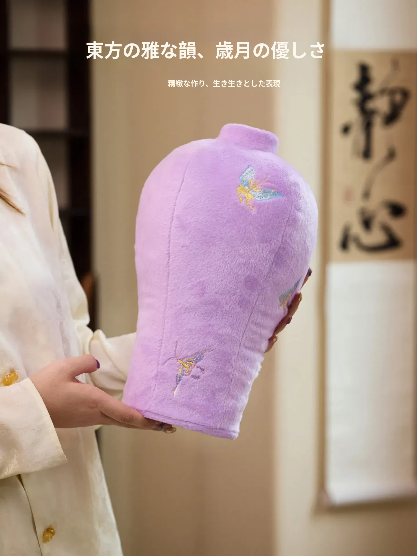 カビオセン刺繍フラワーベースクッション - 和風の紫色の蝶デザインで、リビングルームを華やかに彩るインテリアアイテム。おしゃれな花を活けて、心地よい空間を演出します!
