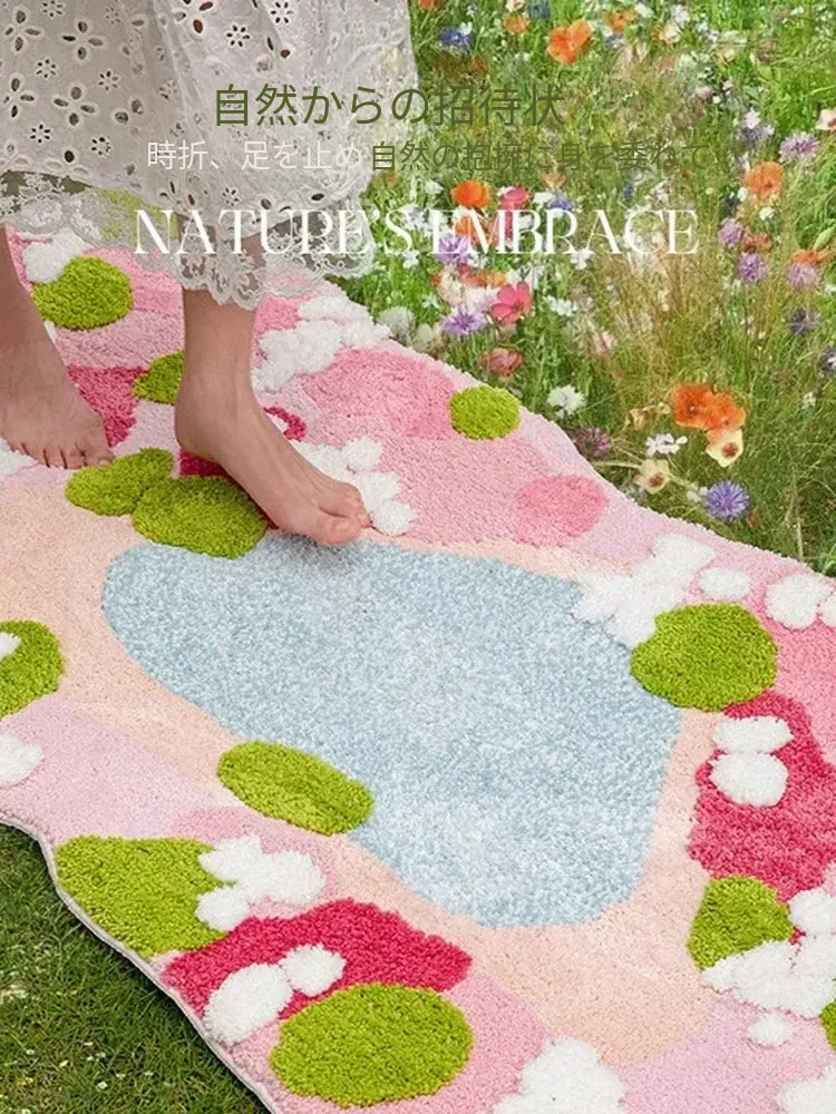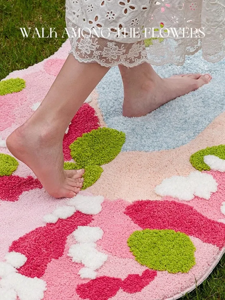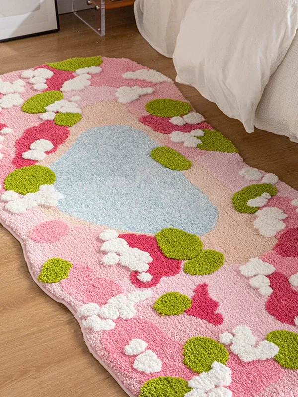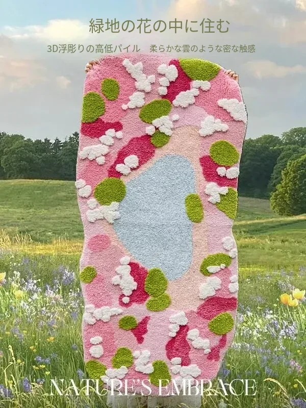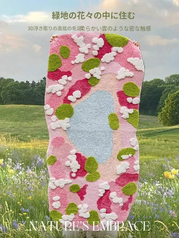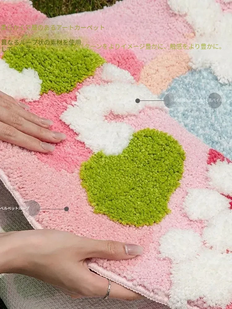 かわいいカートゥーンフラワーのベッドサイドマット、ピンク色のふわふわラグ!おしゃれな寝室のデコレーションにぴったり。滑り止め付きで安全安心、ユニークな形状でインテリアを華やかに演出します!