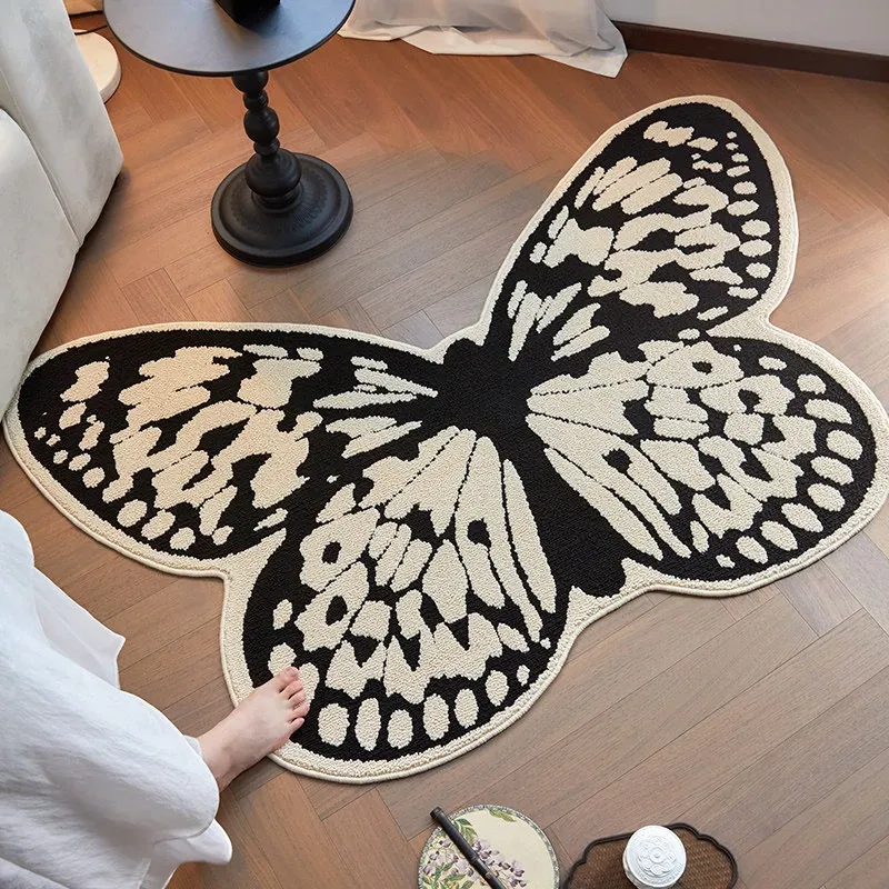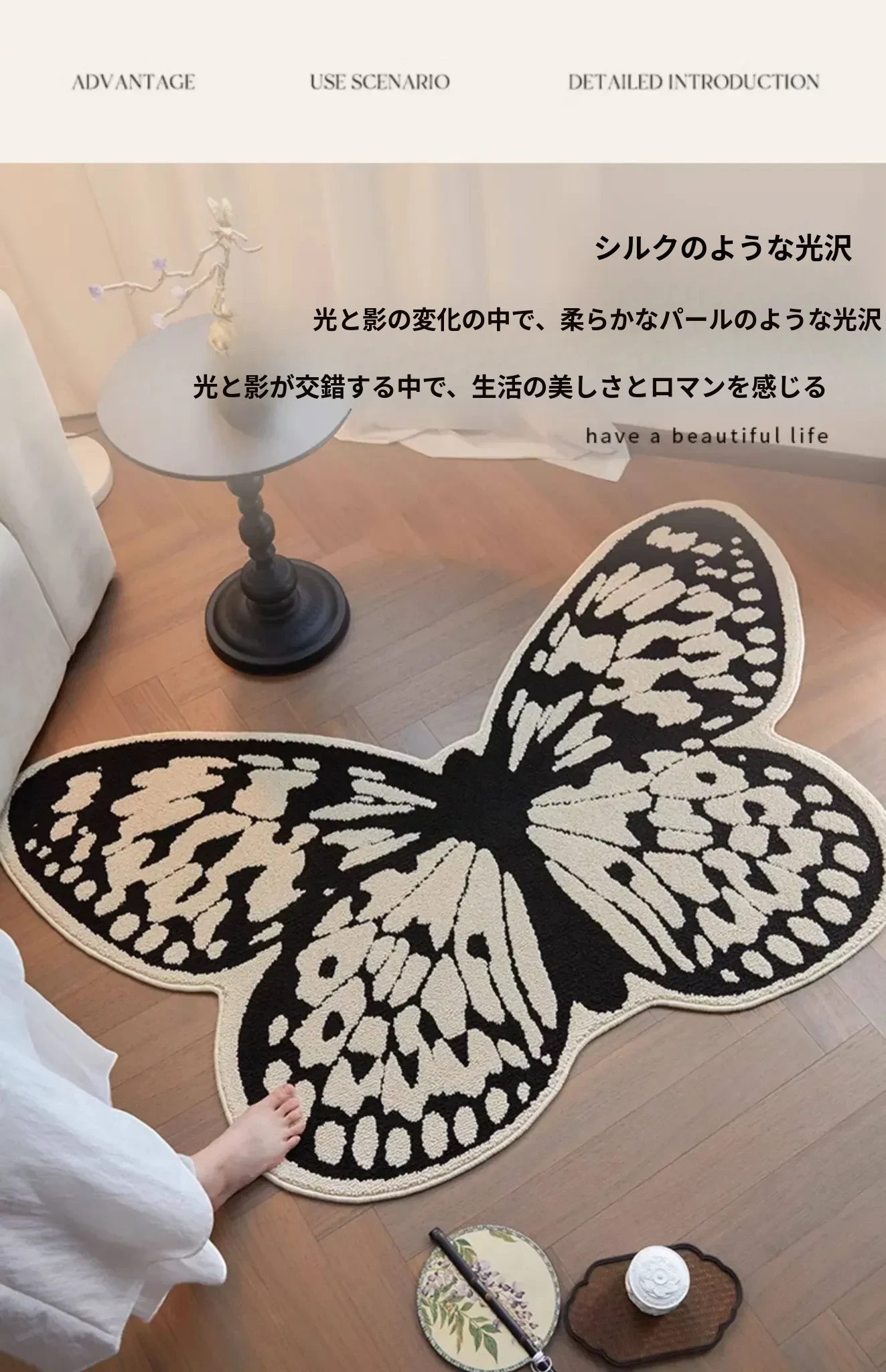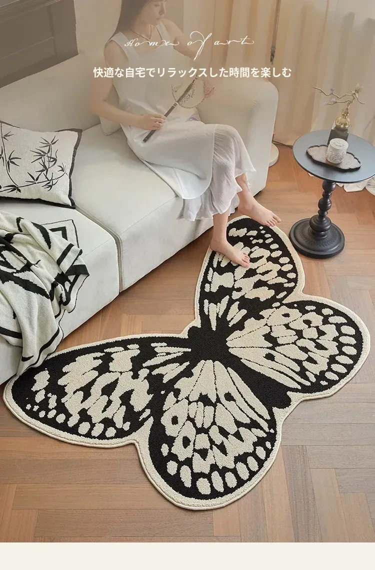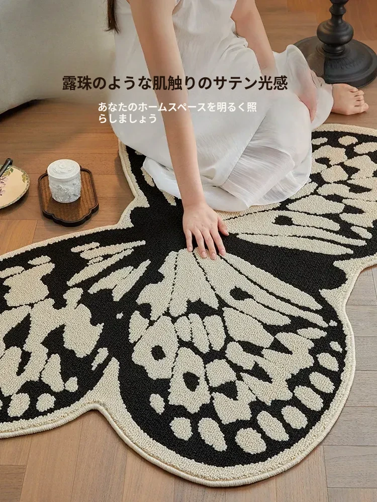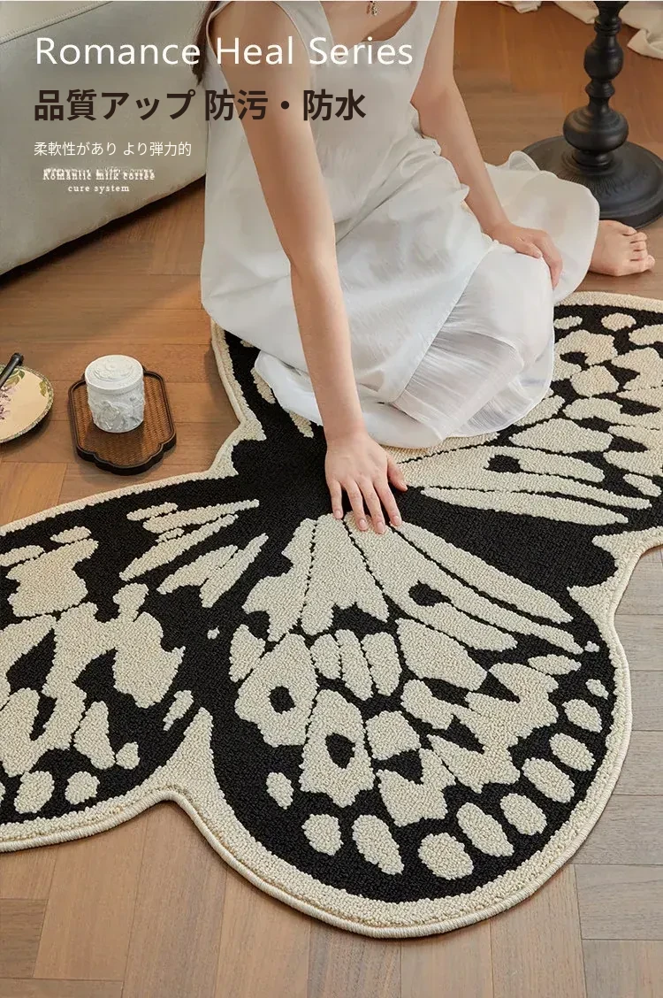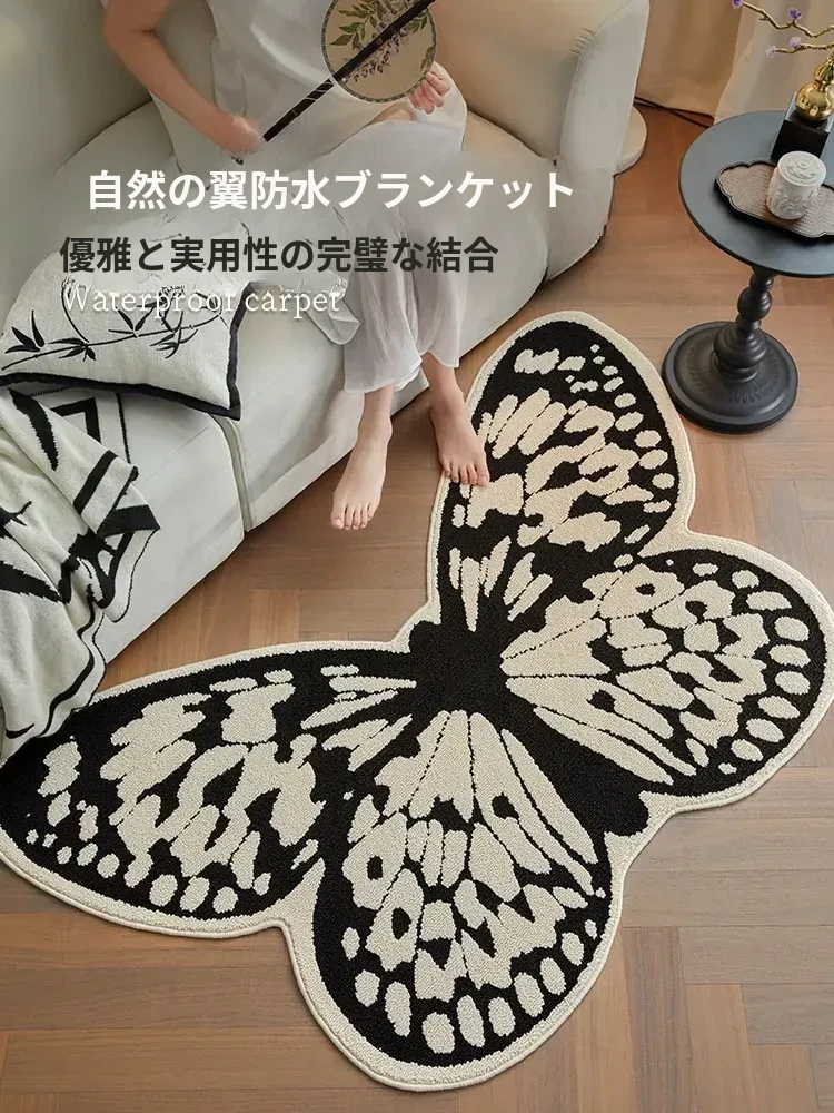 ブラック&ホワイト蝶型デザインベッドサイドマット - おしゃれなクリーム風リビング・寝室用高級感あふれる防水・防汚カーペット、チェアマットに最適!