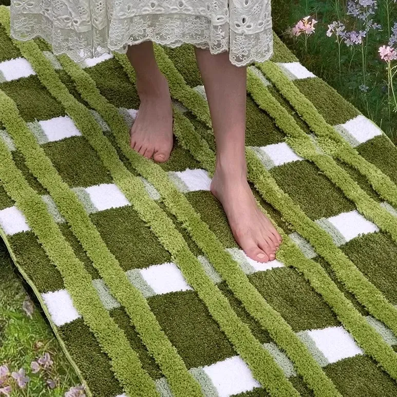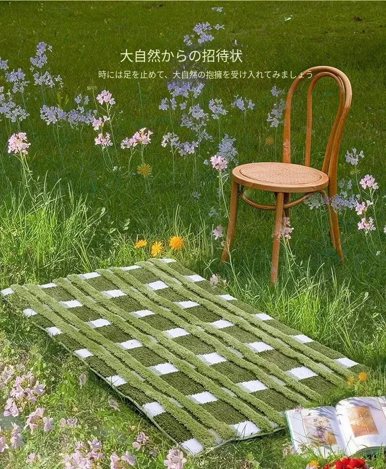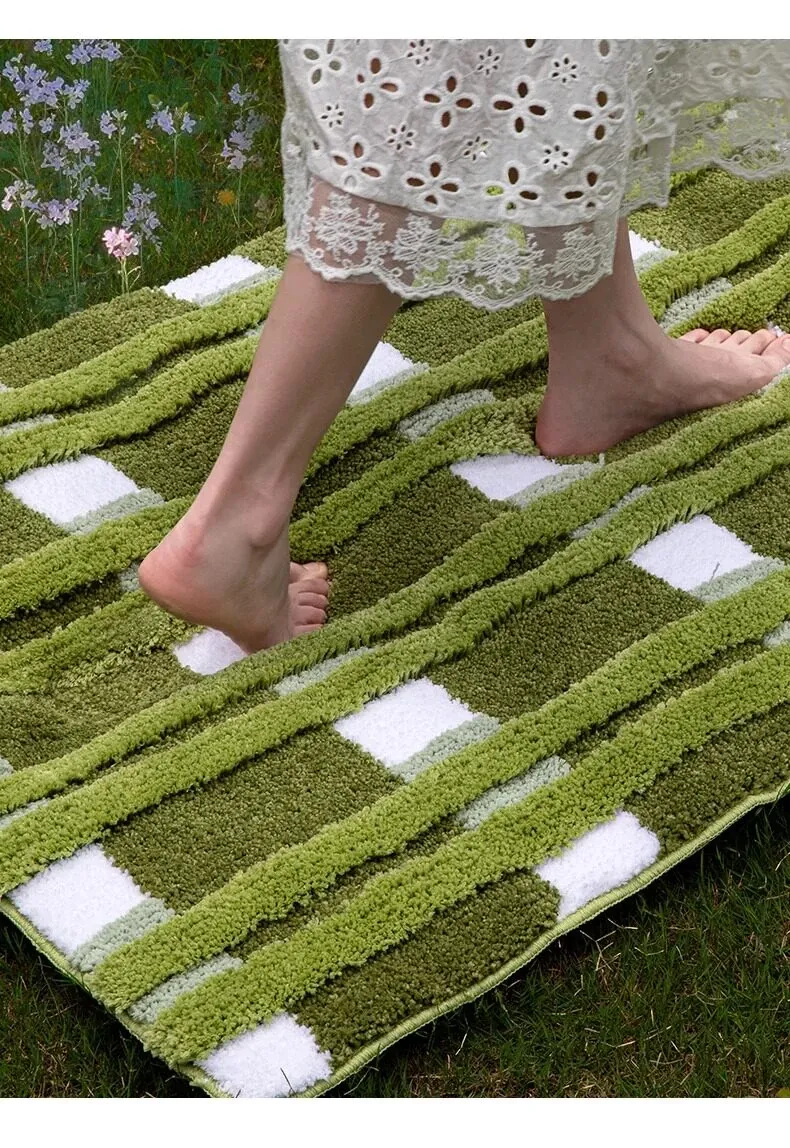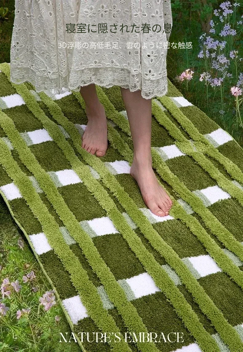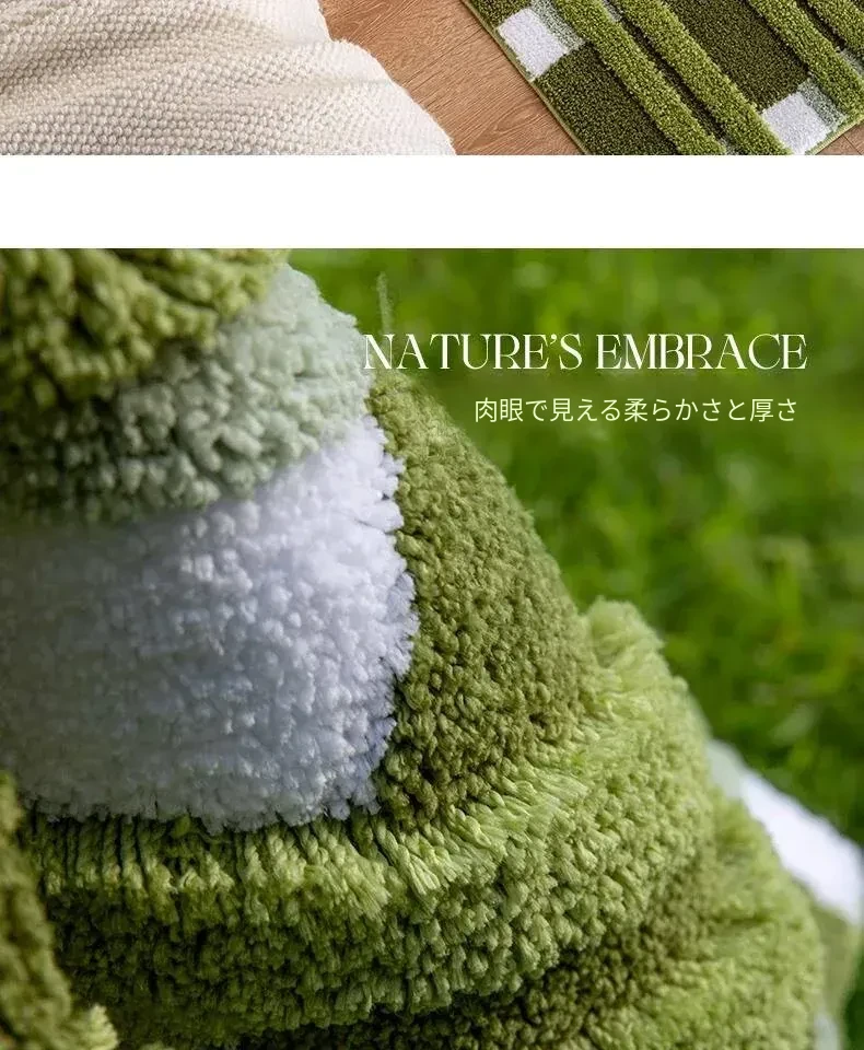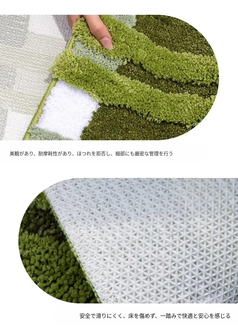 森の風を感じるリビングカーペット|田舎風デザインの緑色異形マット|ベッドサイドやソファにぴったり|高級感あふれるクッションマット|窓辺のくつろぎ空間を演出!