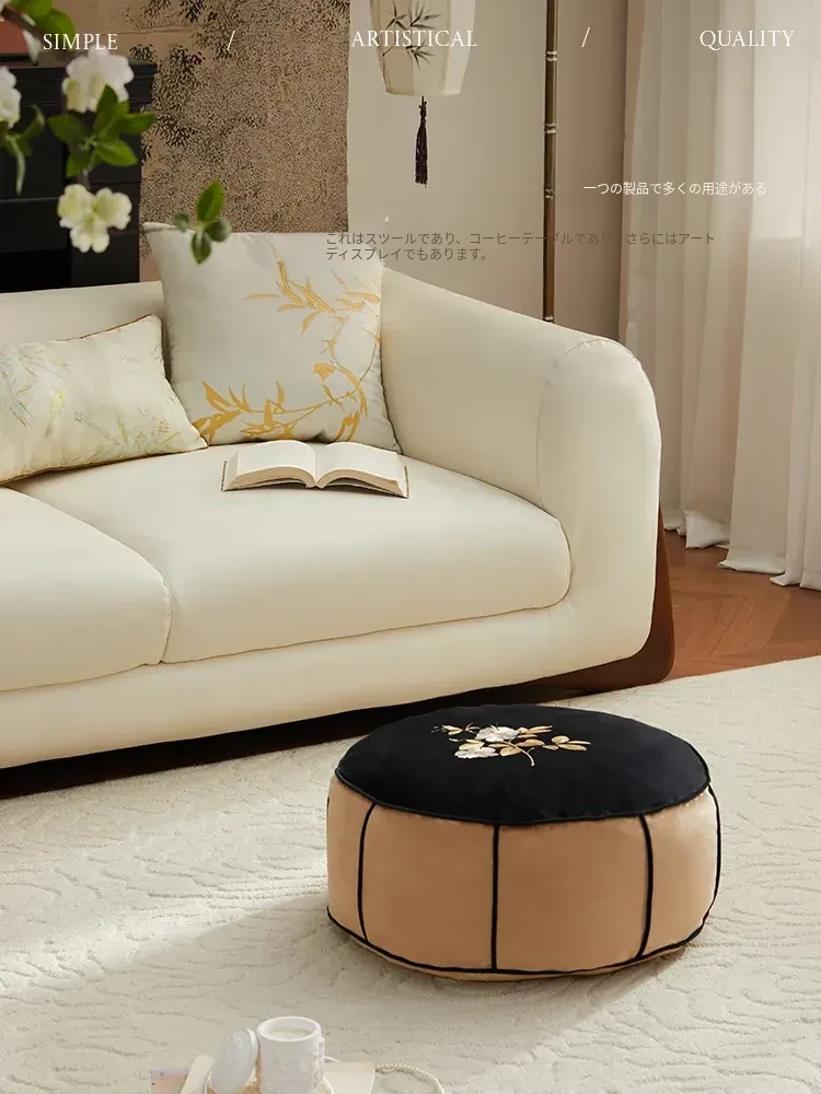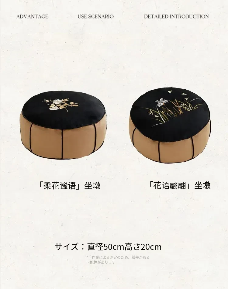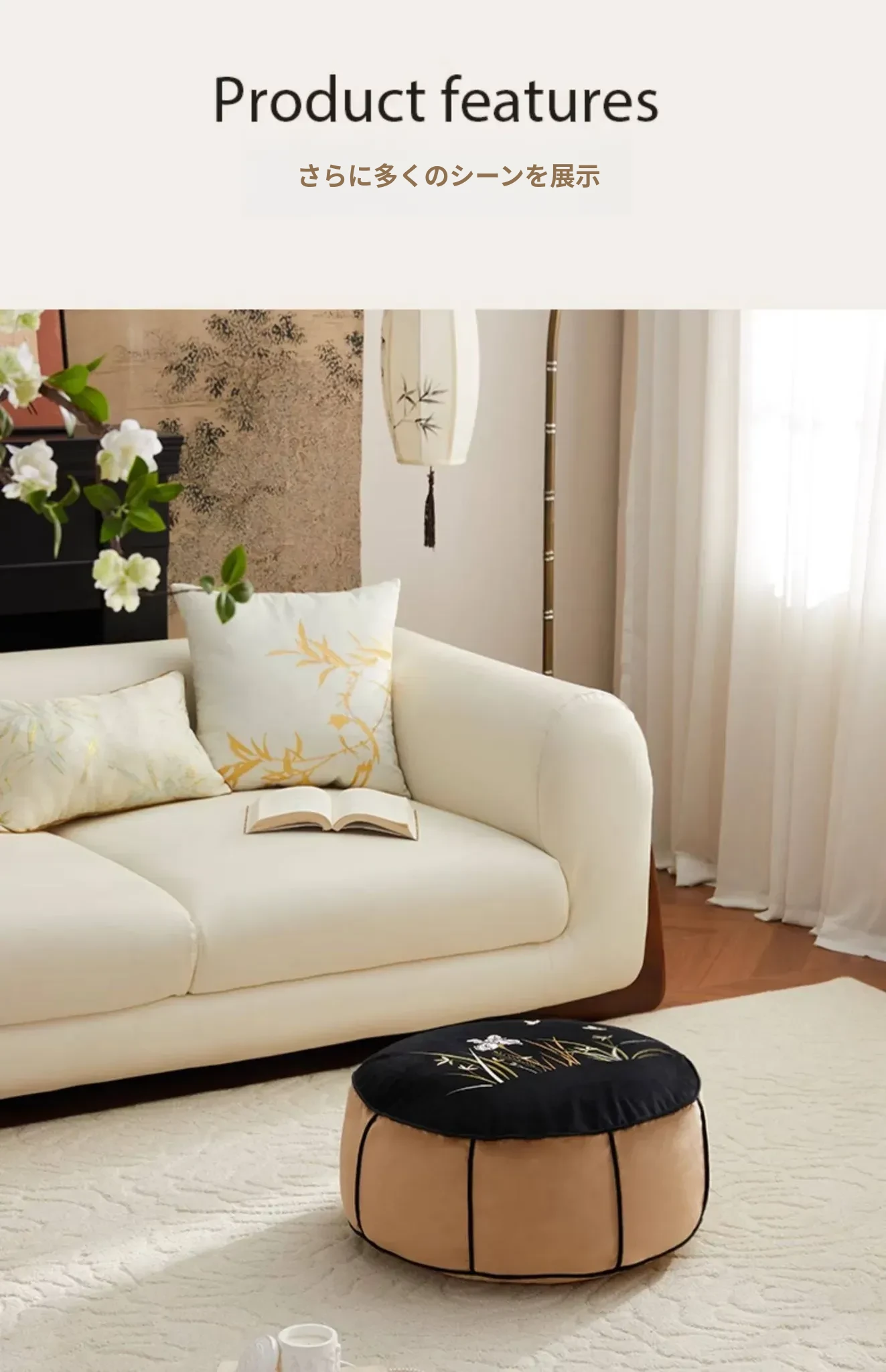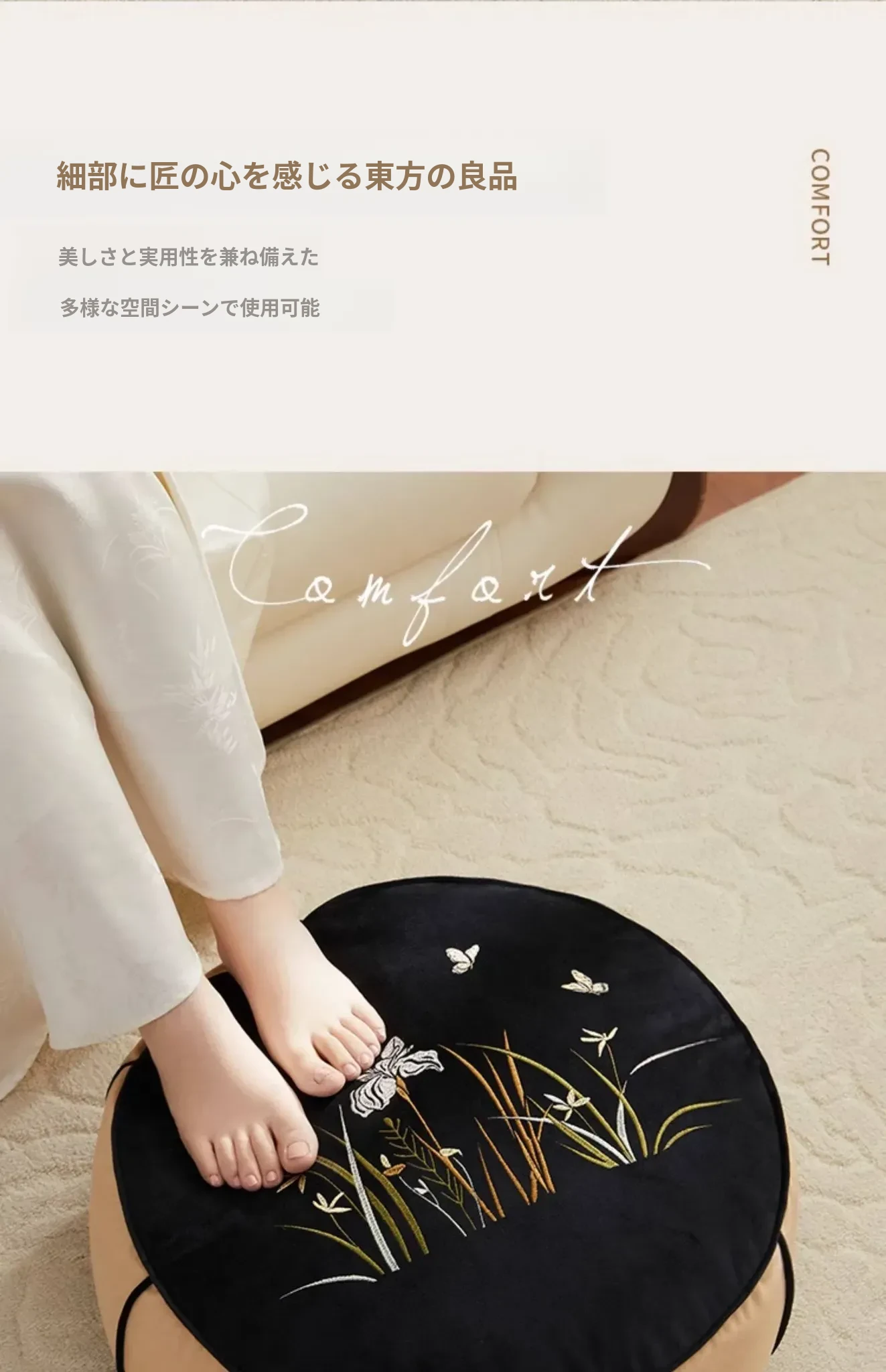 新中式デザインのラグにぴったり!おしゃれで厚みのあるアンティーク風の丸型座布団。高品質の足置き、和室や窓際のリラックススペースに最適!