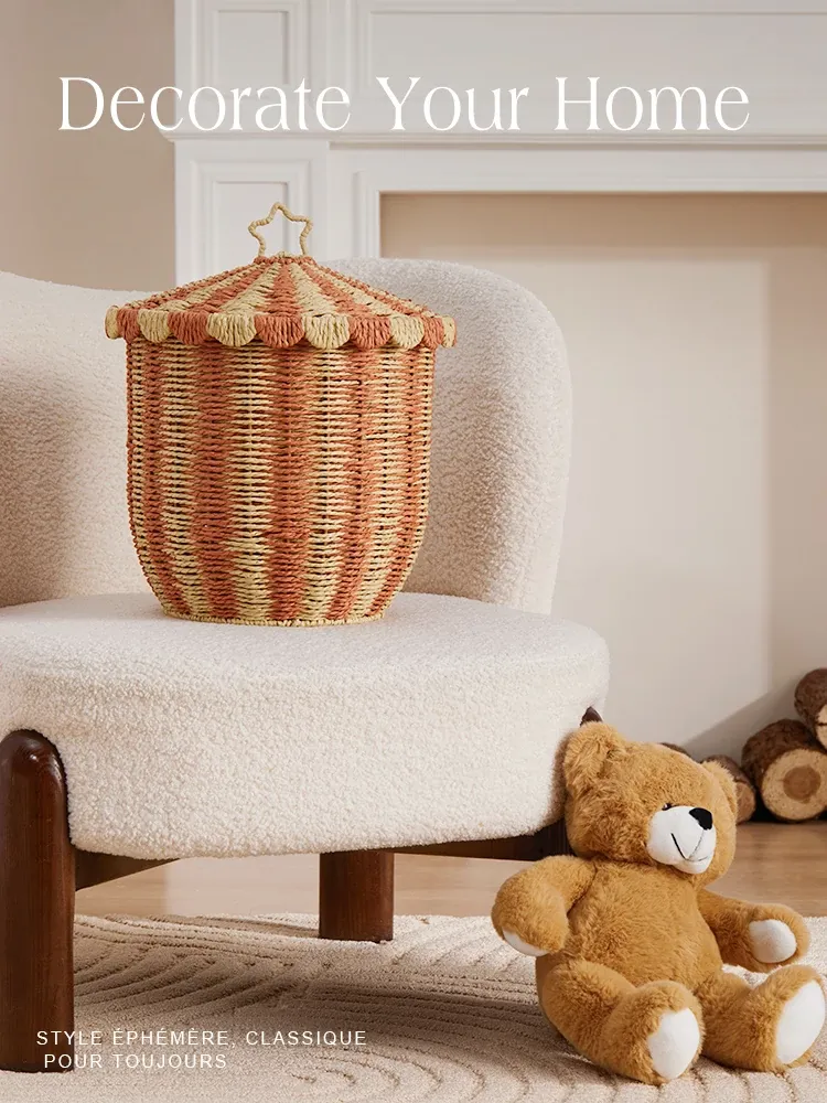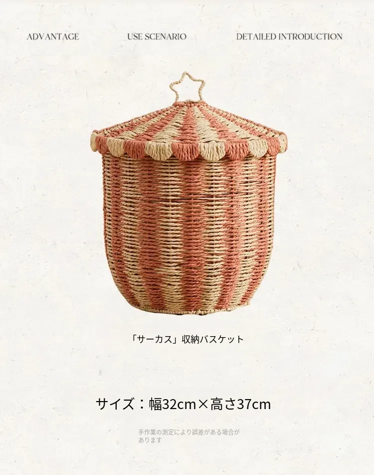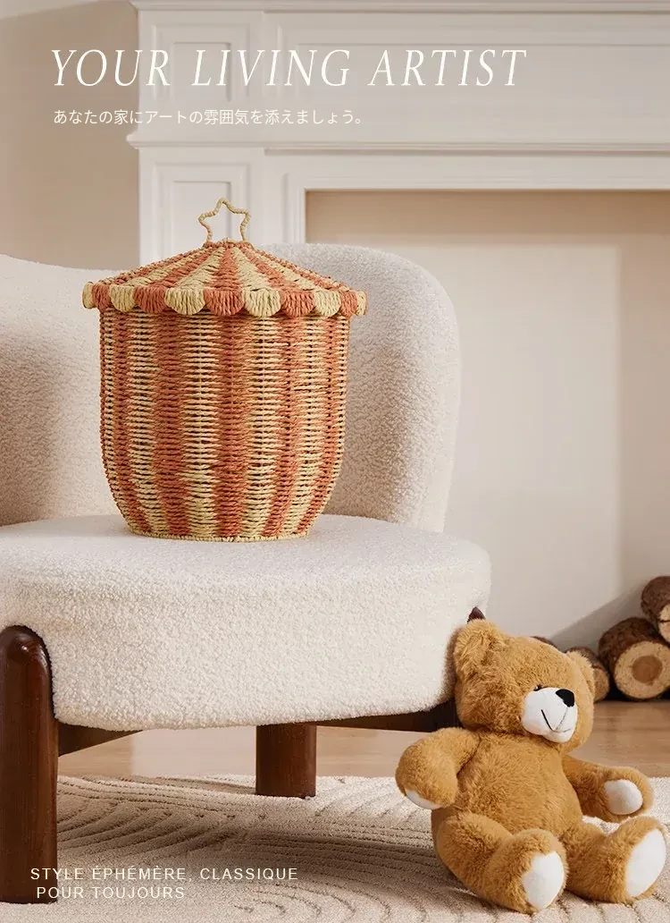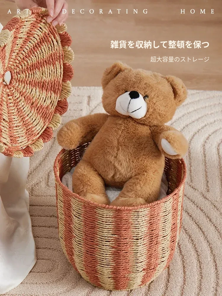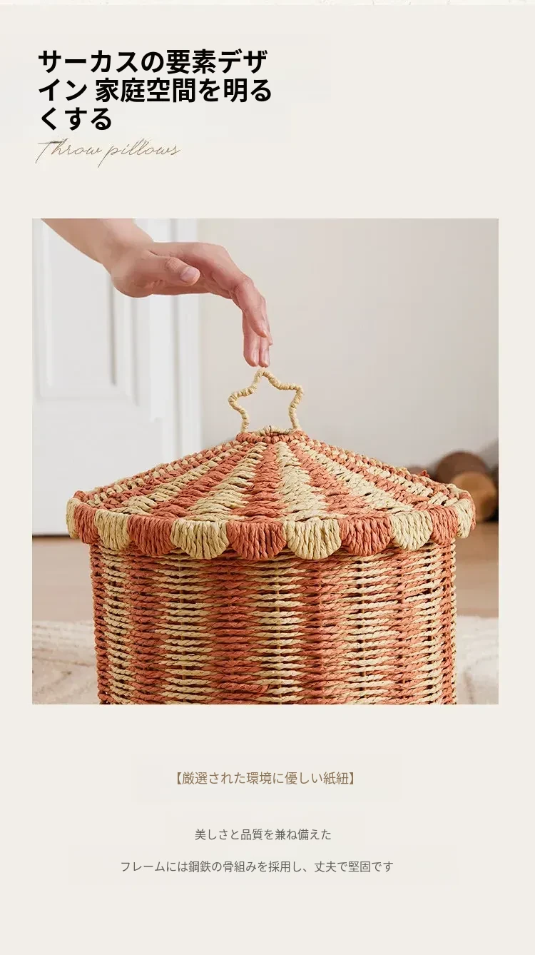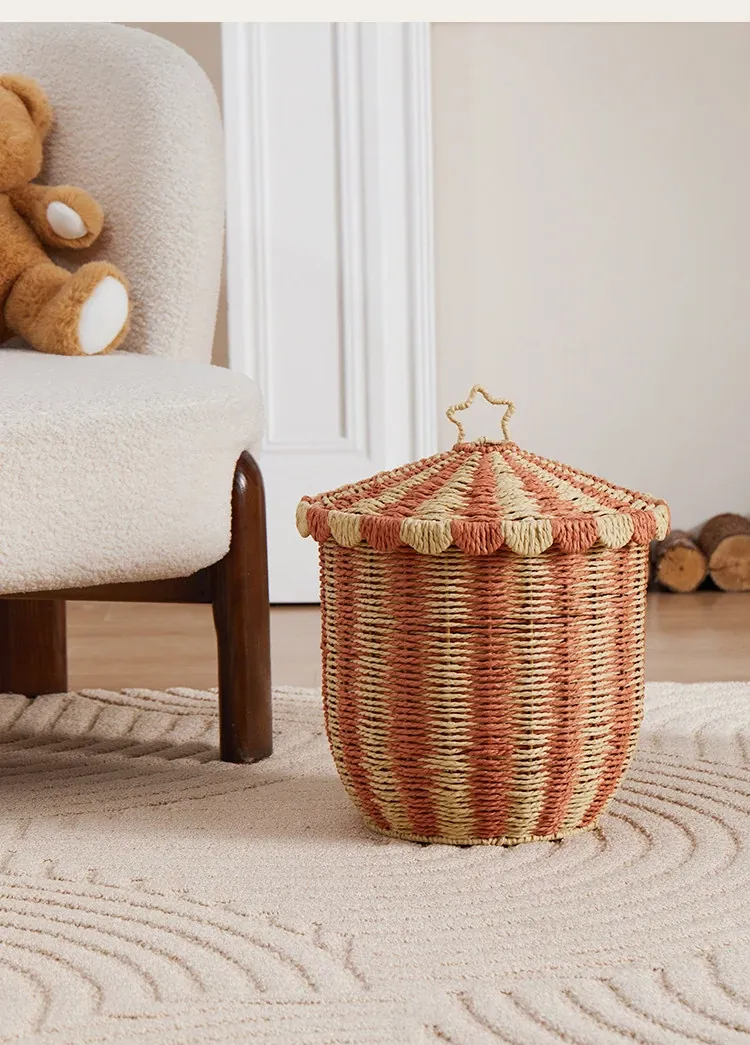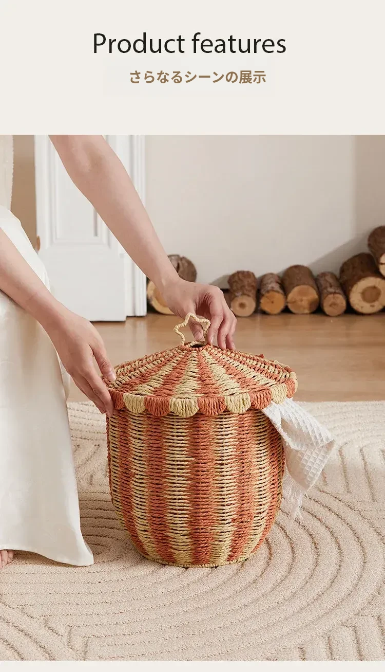 手作のラタン編み収納バスケット - 蓋付きでおしゃれ!子供部屋や寝室にぴったりの雑貨入れ、洗濯物やおもちゃもスッキリ整理。楽しいデザインで、お部屋を明るく彩ります!