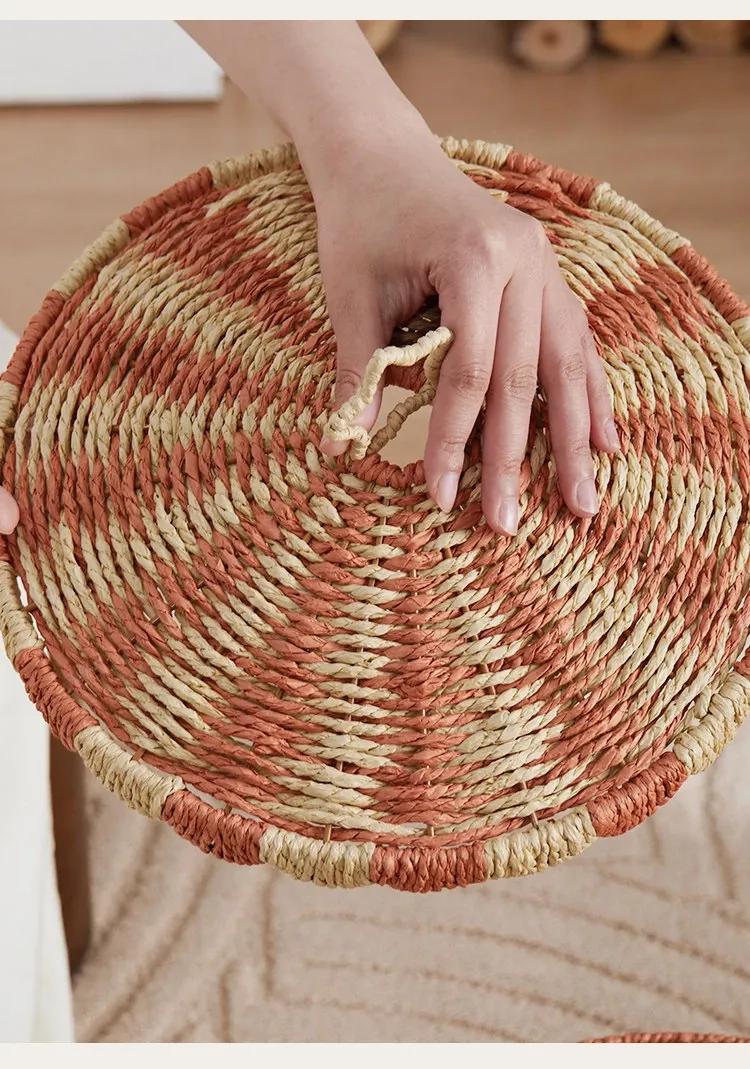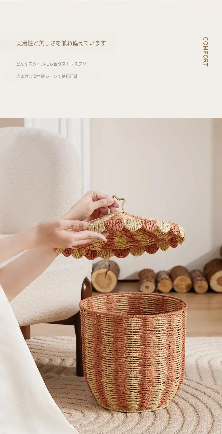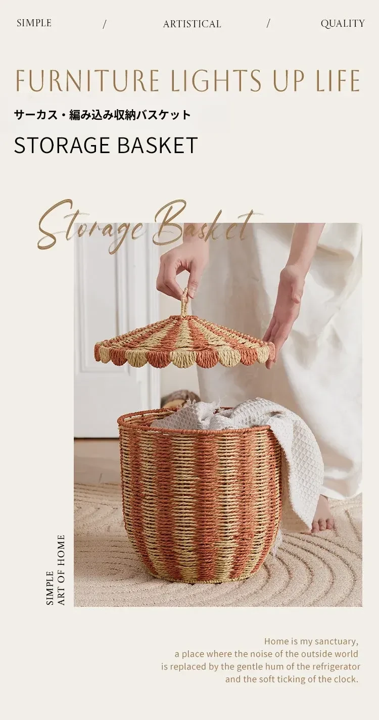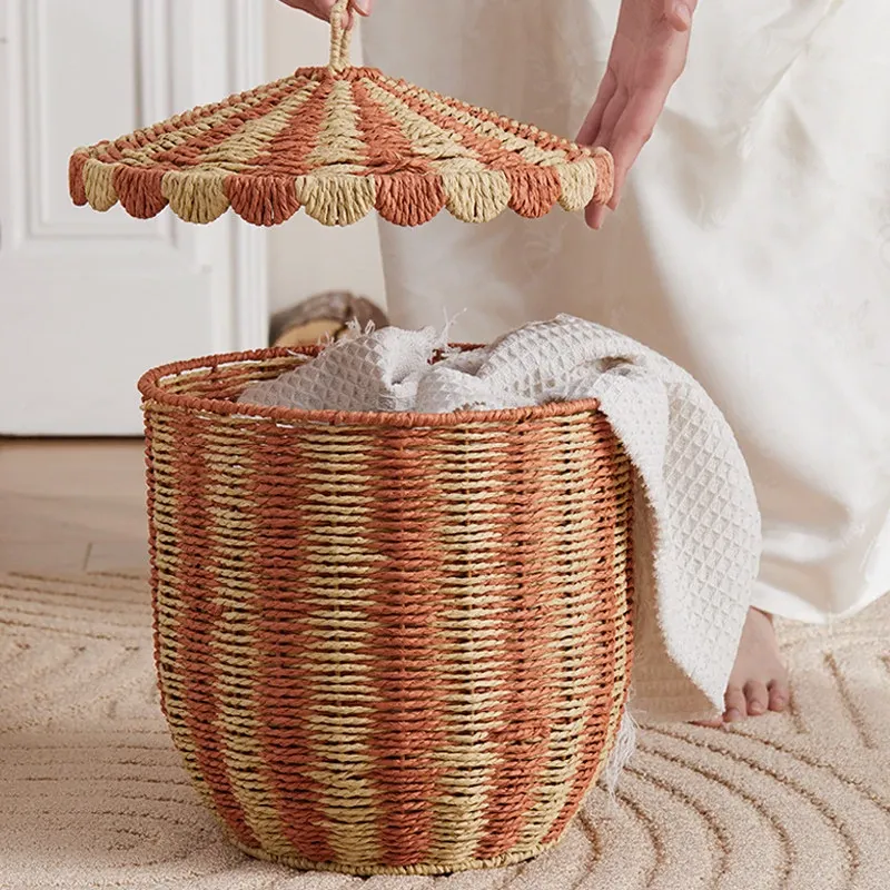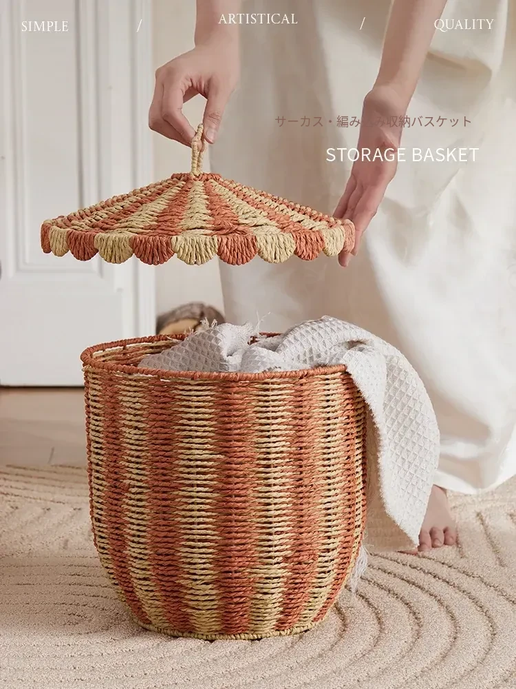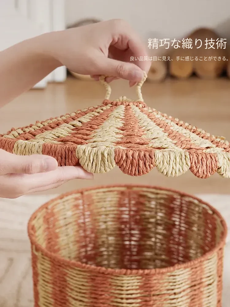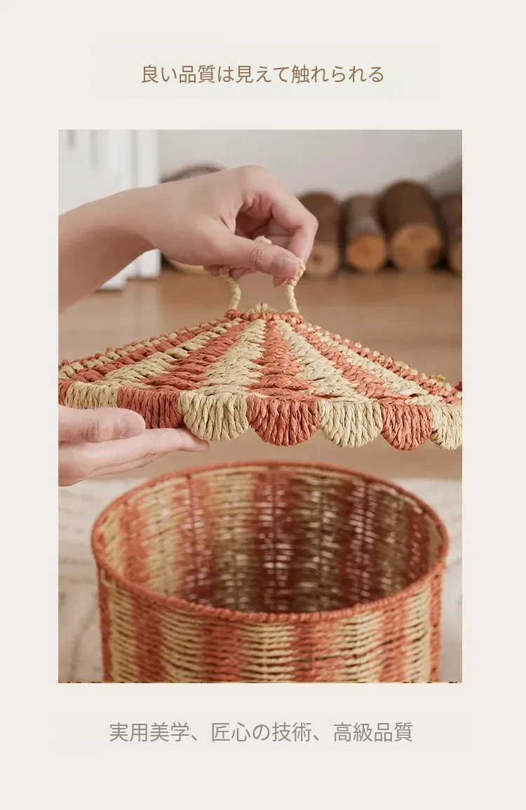 手作のラタン編み収納バスケット - 蓋付きでおしゃれ!子供部屋や寝室にぴったりの雑貨入れ、洗濯物やおもちゃもスッキリ整理。楽しいデザインで、お部屋を明るく彩ります!