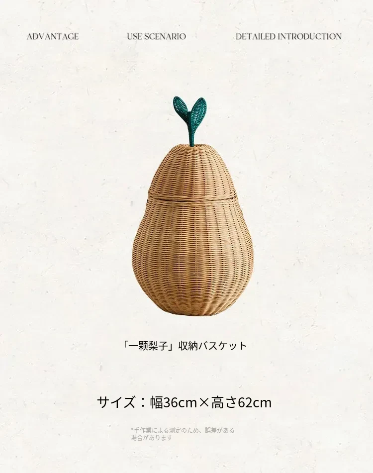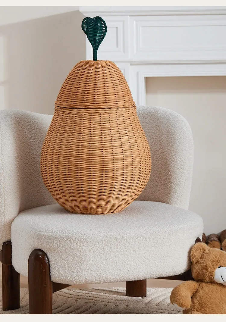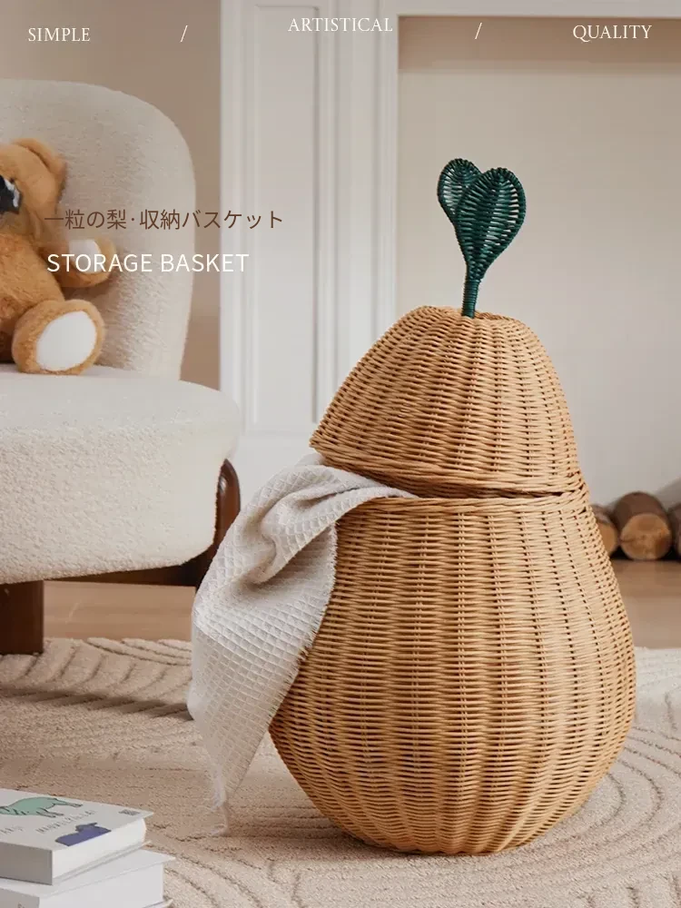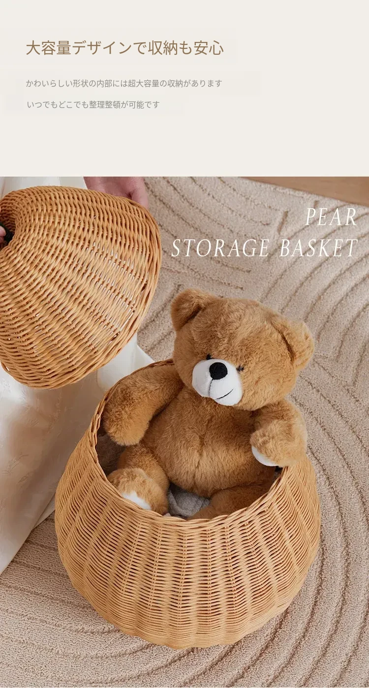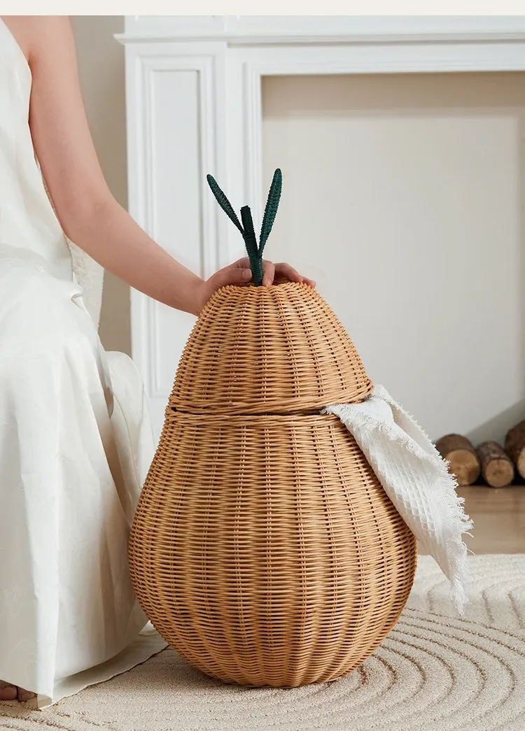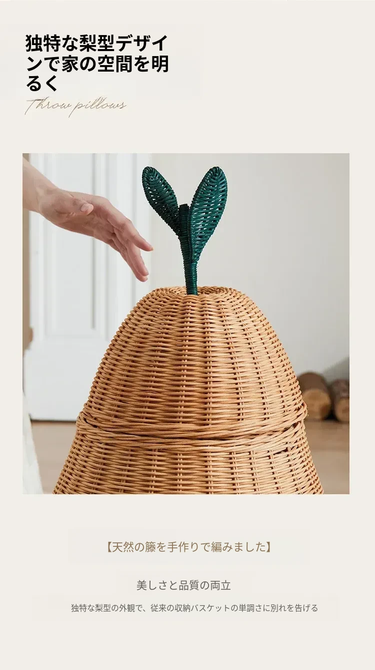 手作藤編みの梨型ランドリーバスケット - お部屋の整理整頓に最適!おもちゃやお菓子なども収納できる、可愛いデザインでリビングや寝室にぴったり。おしゃれで機能的なアイテムをぜひお試しください!