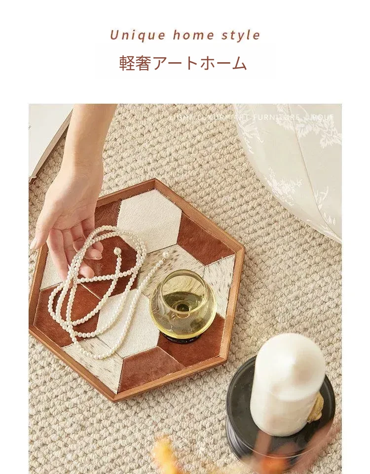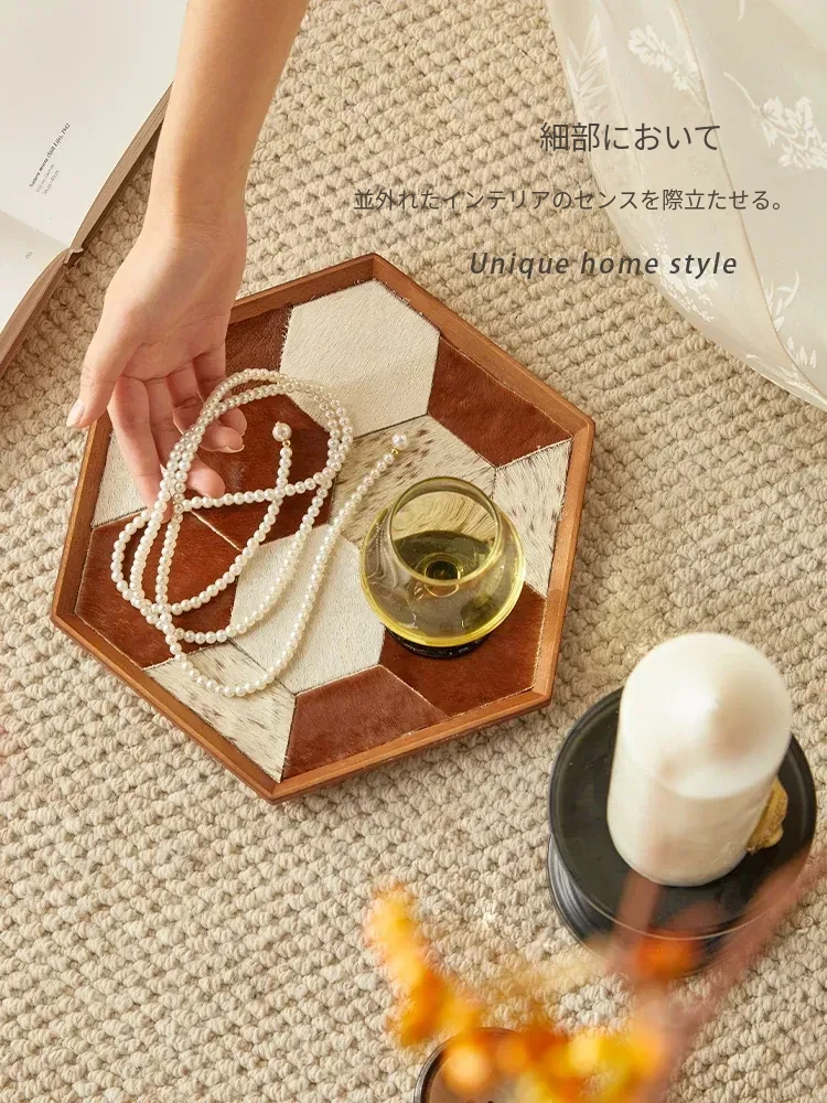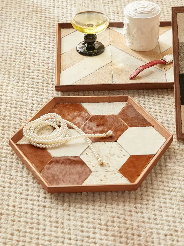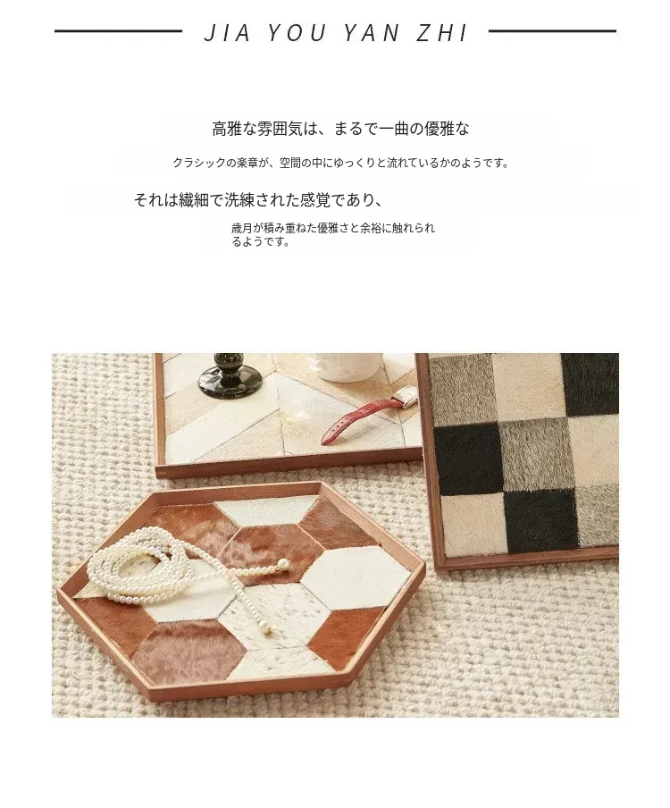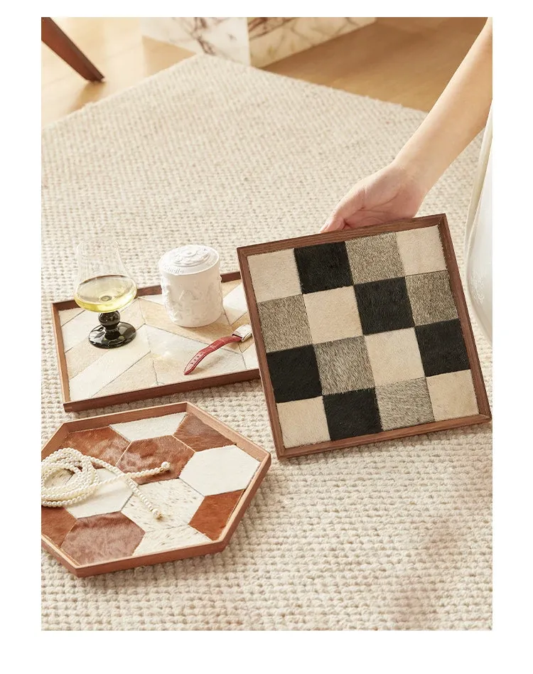 高級感あふれる牛革のブラック&ホワイトチェック香水トレイ、馬毛の玄関テーブル用キー&キャンドル&ジュエリー収納トレイ。洗練されたデザインで、あなたの空間をおしゃれに演出します。