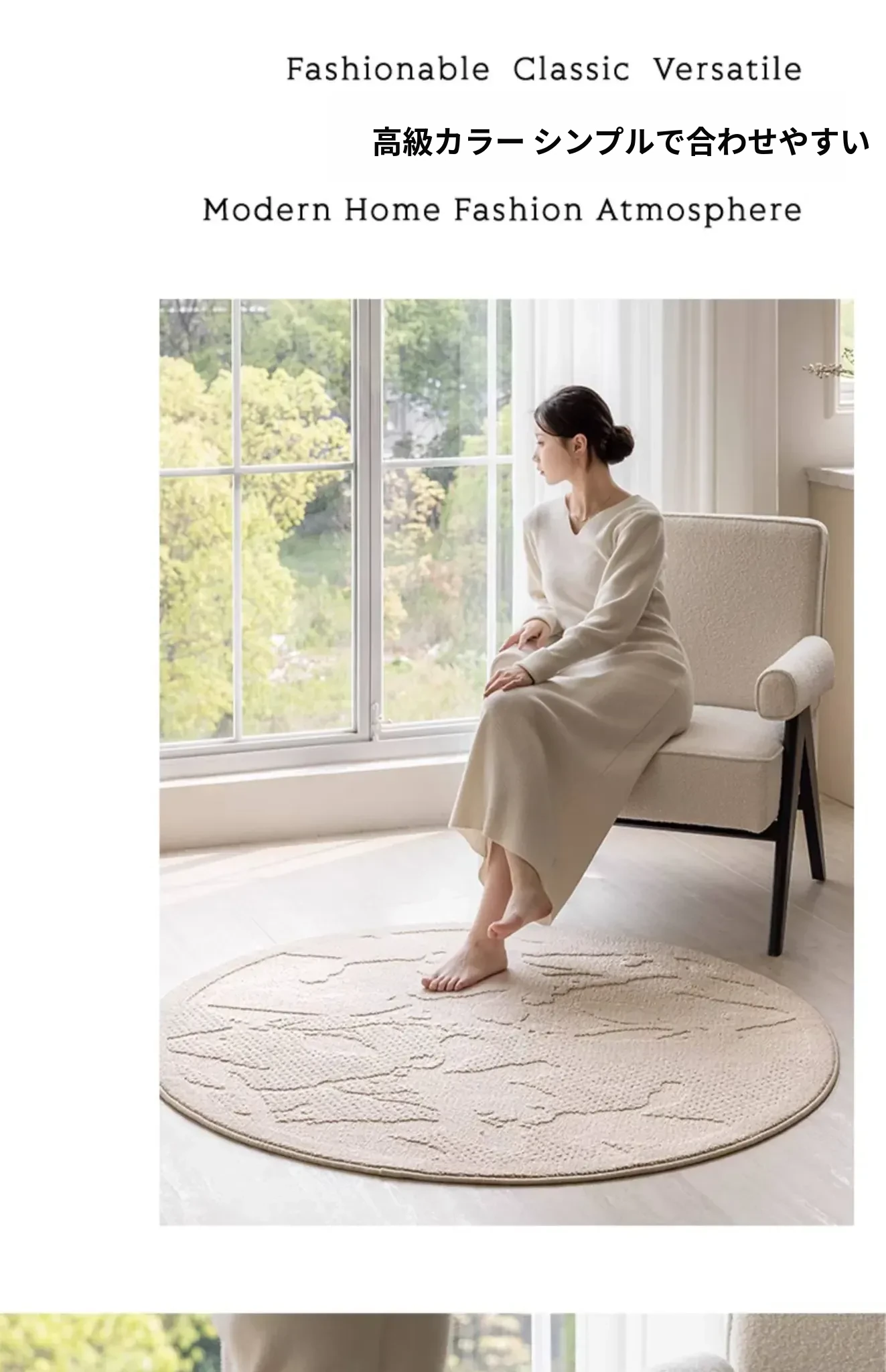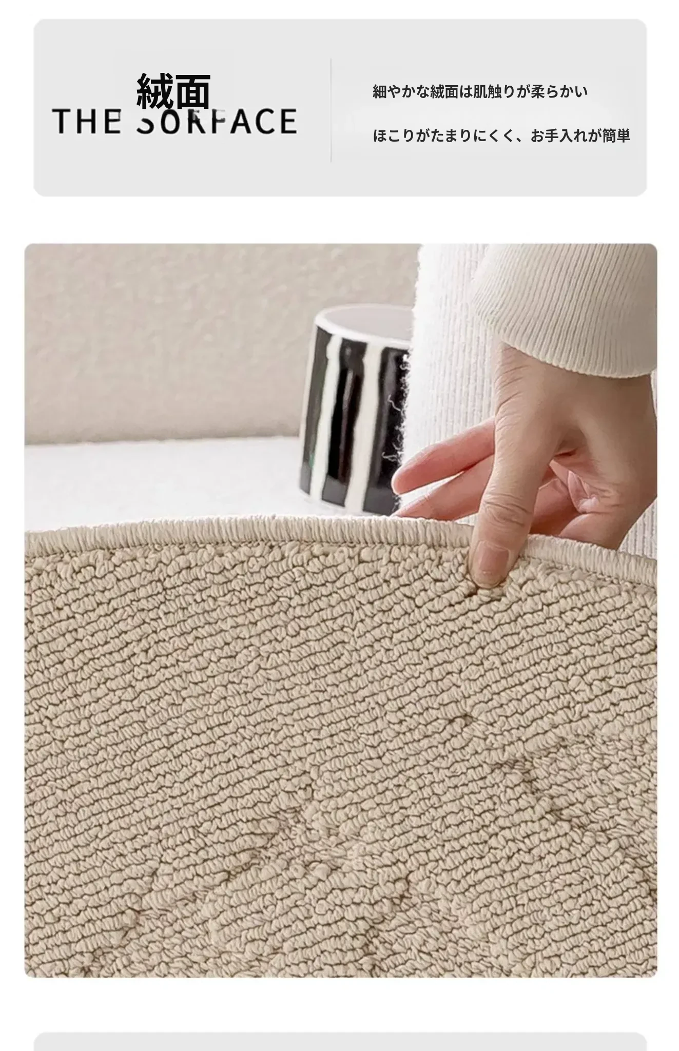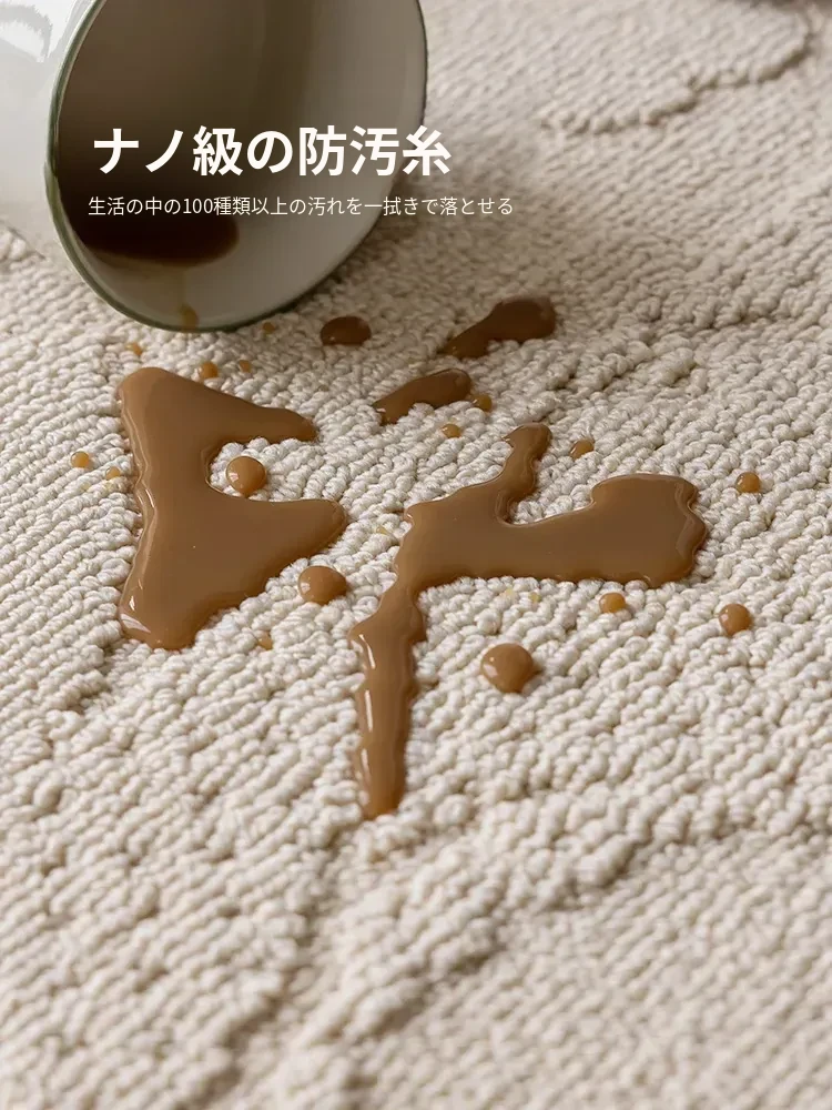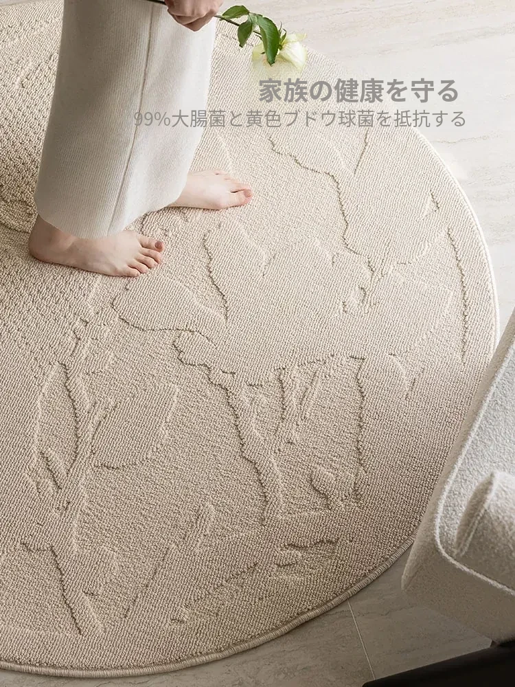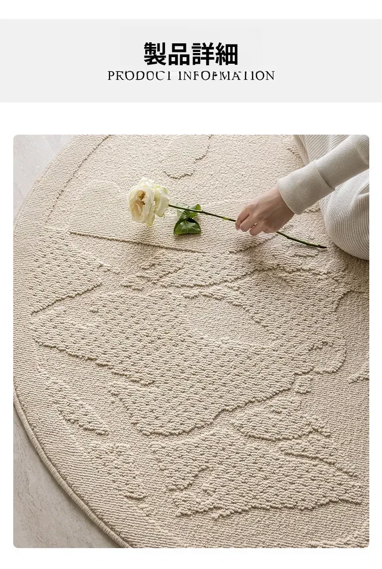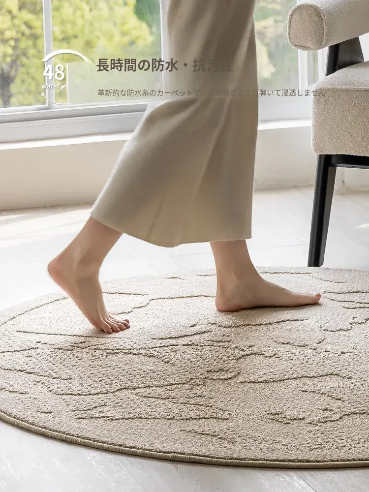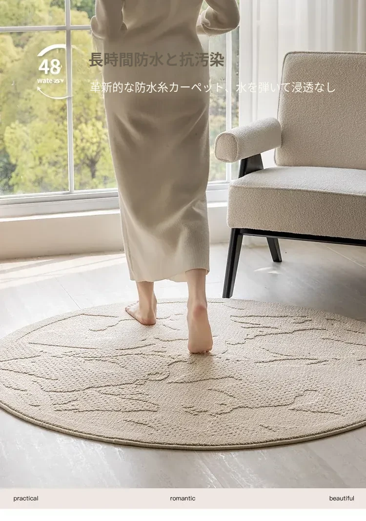 完全防水・防汚のラウンドカーペット!高級感あふれるクリーム風デザインで、リビング・クローゼット・ベッドサイド・ソファにぴったり。優雅な空間を演出し、毎日を特別に!