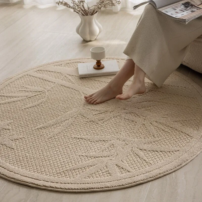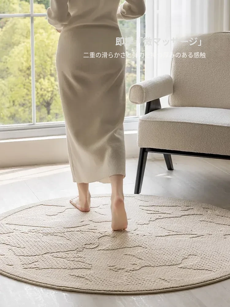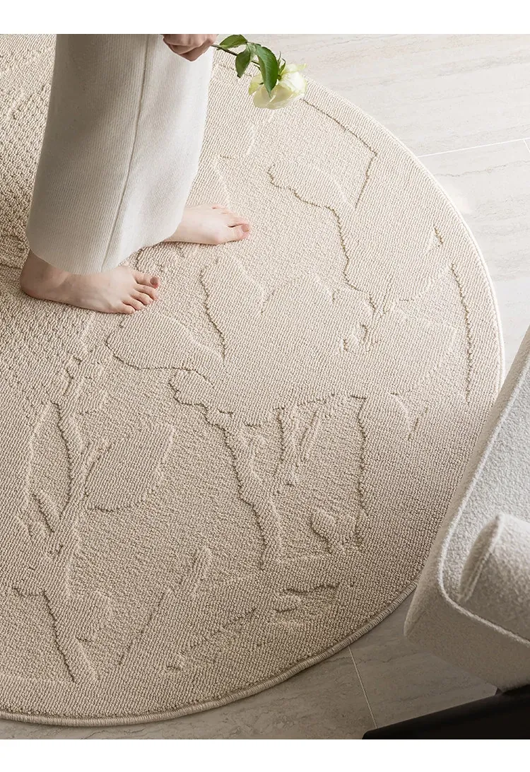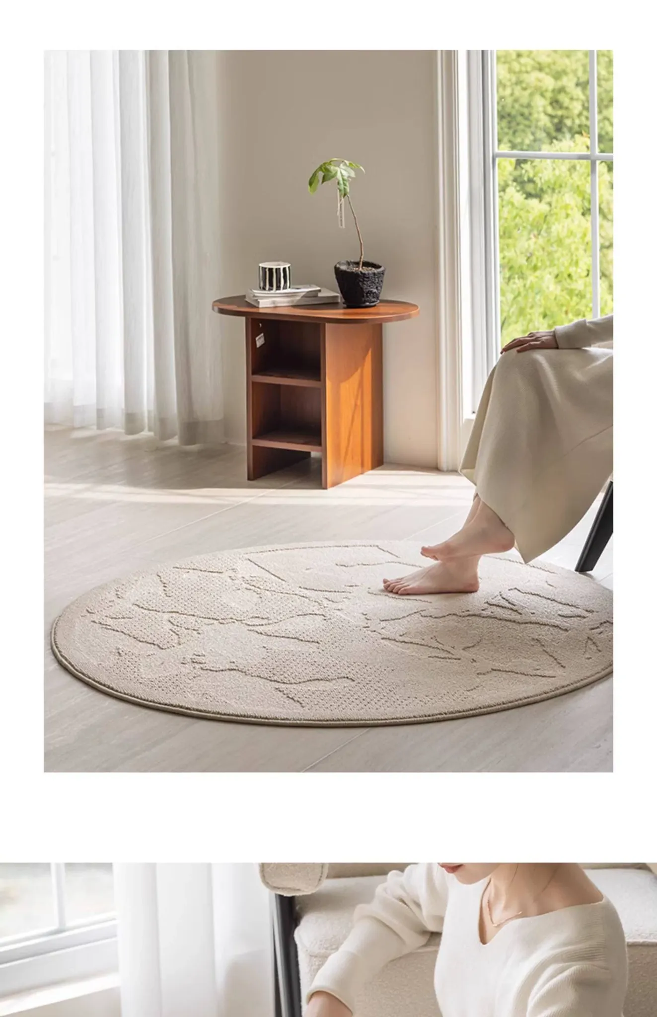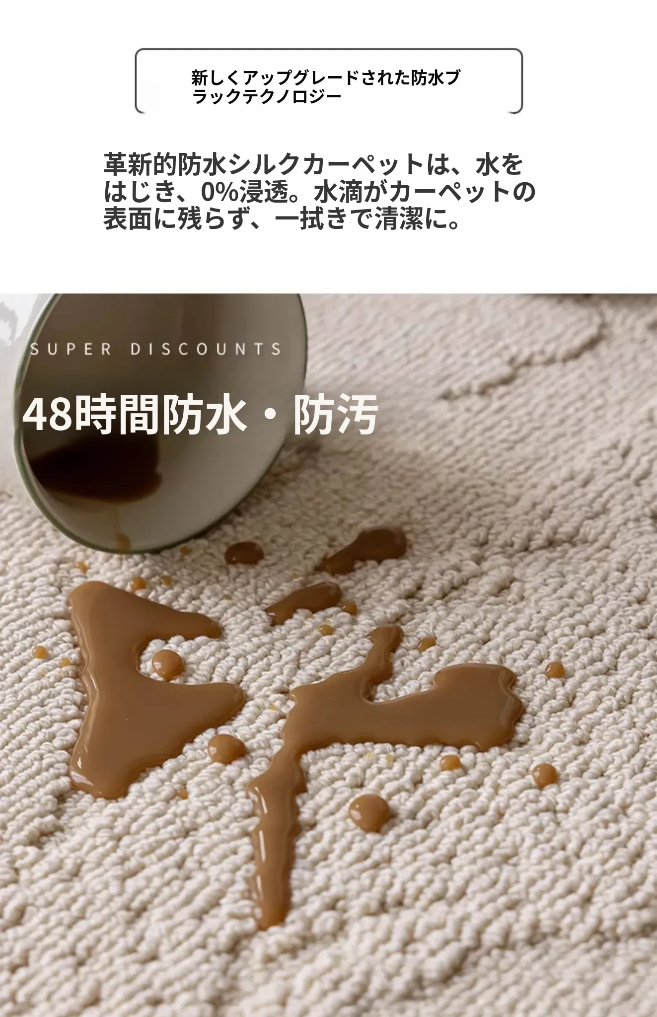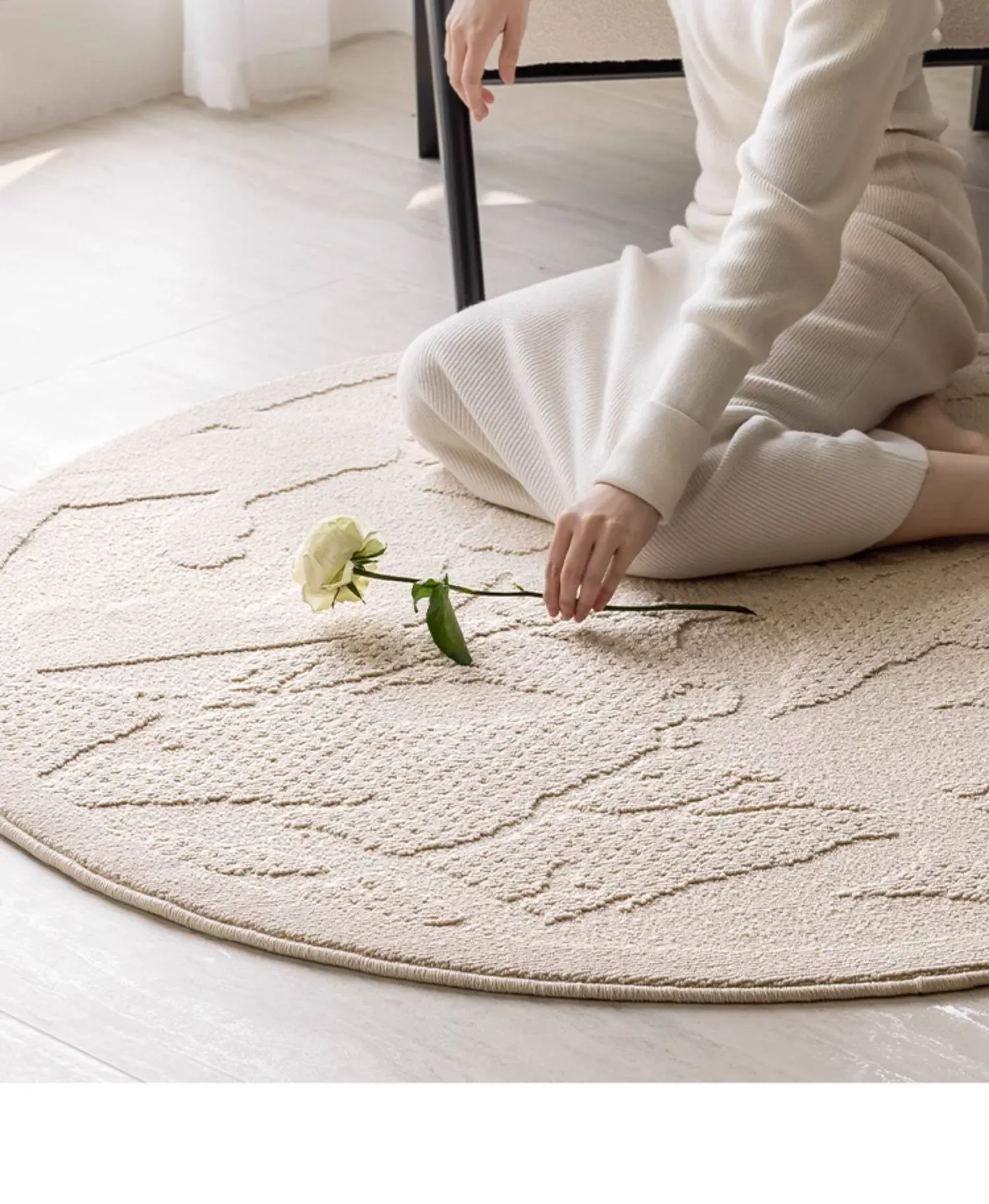 完全防水・防汚のラウンドカーペット!高級感あふれるクリーム風デザインで、リビング・クローゼット・ベッドサイド・ソファにぴったり。優雅な空間を演出し、毎日を特別に!