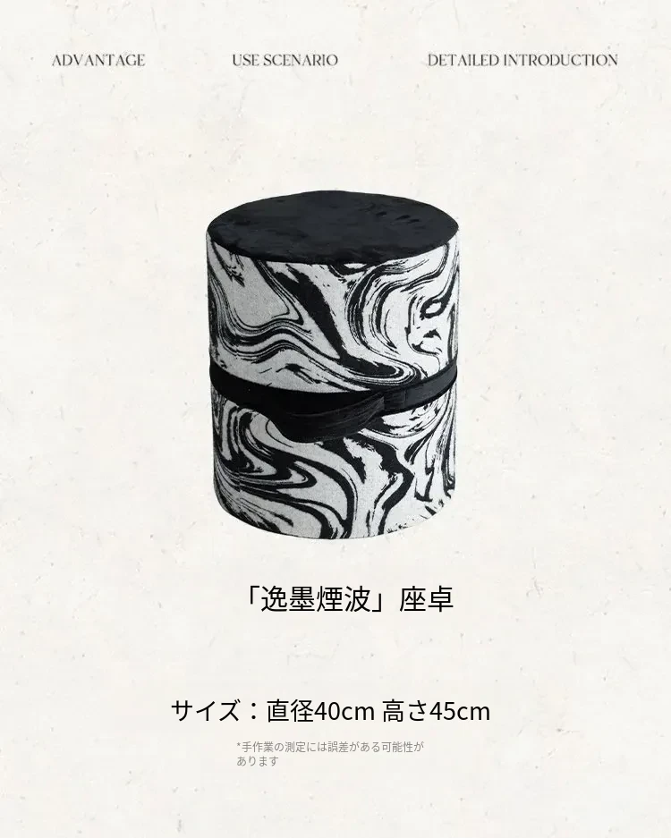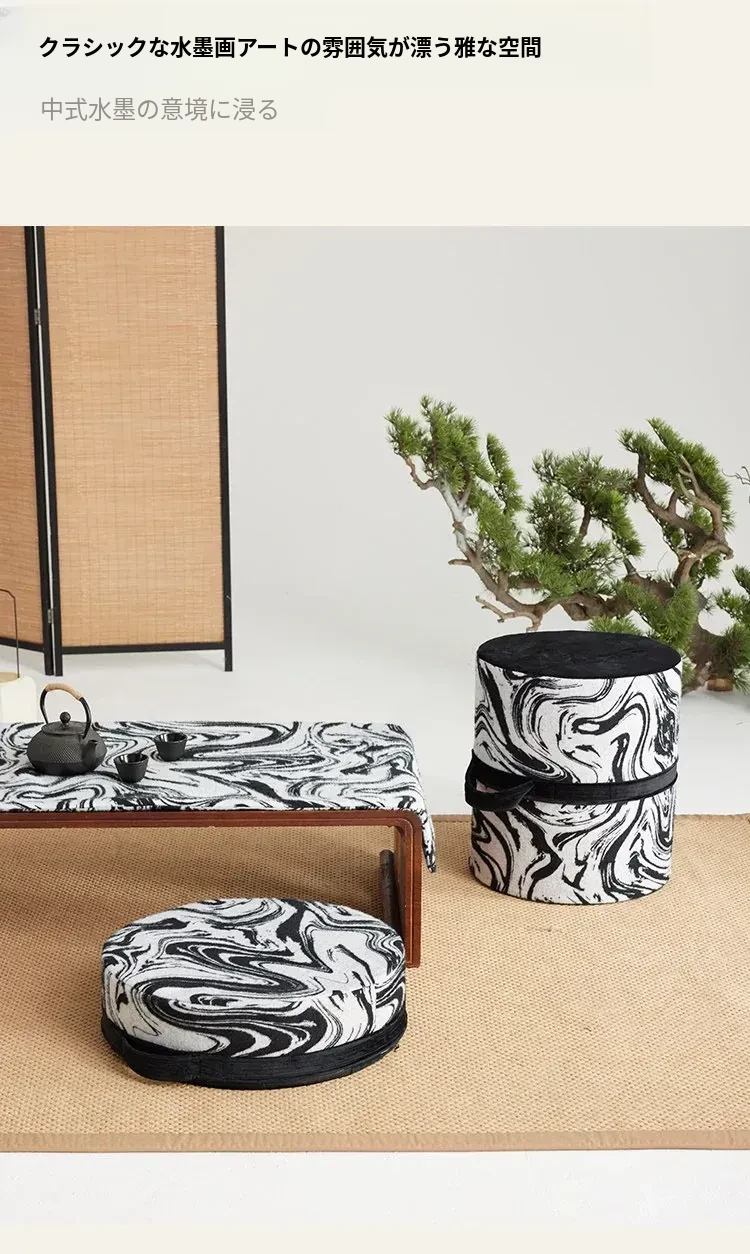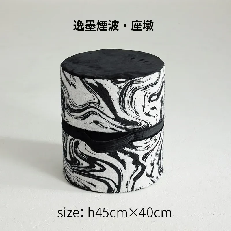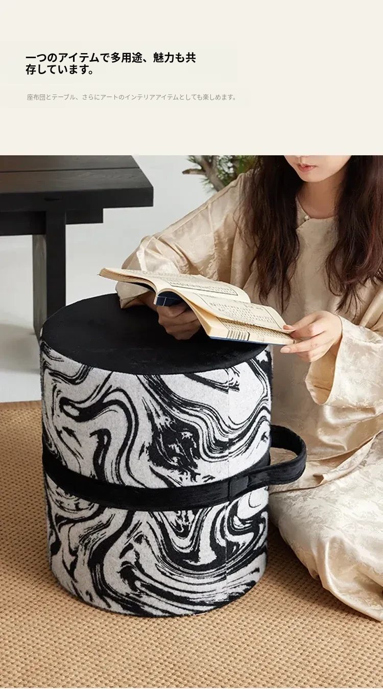 新中式スタイルの洗えるクッションスツール - リビングや寝室、バルコニーに最適な軽量デザインの黒白カラーロンブー。おしゃれで便利な靴脱ぎ用円形スツールで、居心地の良い空間を演出します!