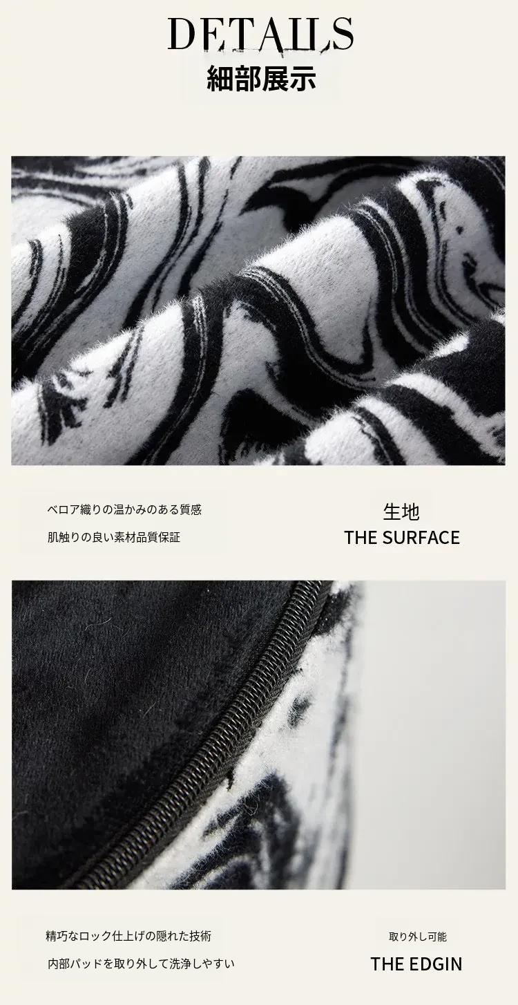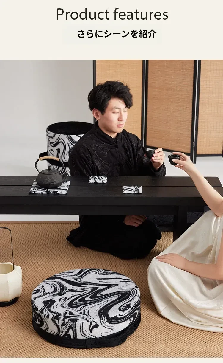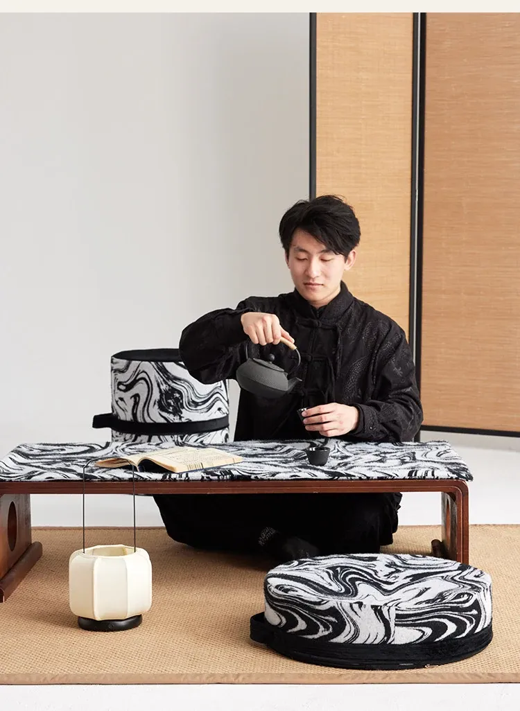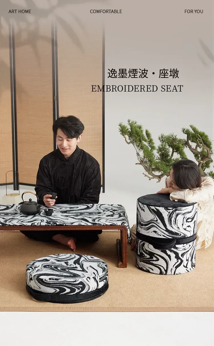 新中式スタイルの洗えるクッションスツール - リビングや寝室、バルコニーに最適な軽量デザインの黒白カラーロンブー。おしゃれで便利な靴脱ぎ用円形スツールで、居心地の良い空間を演出します!