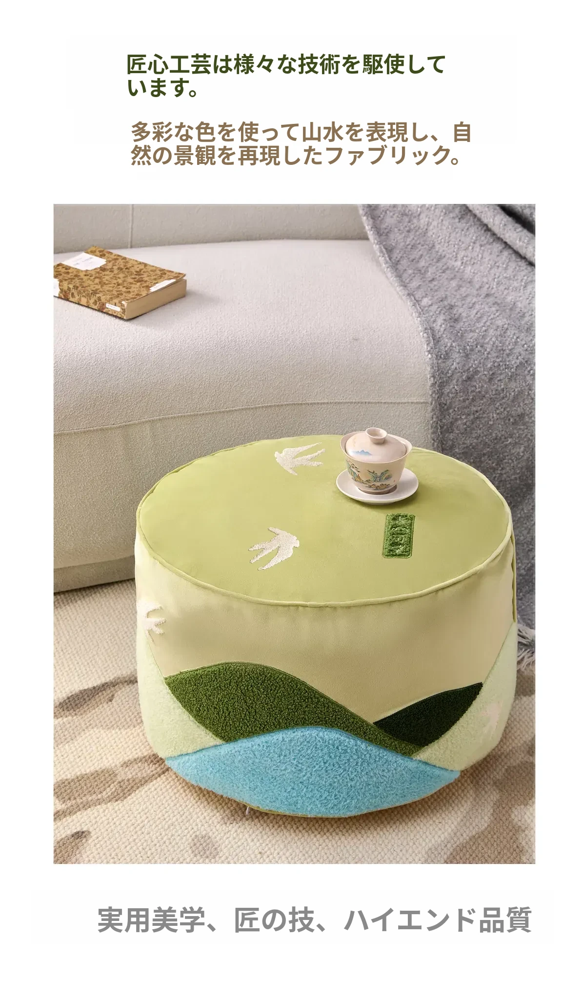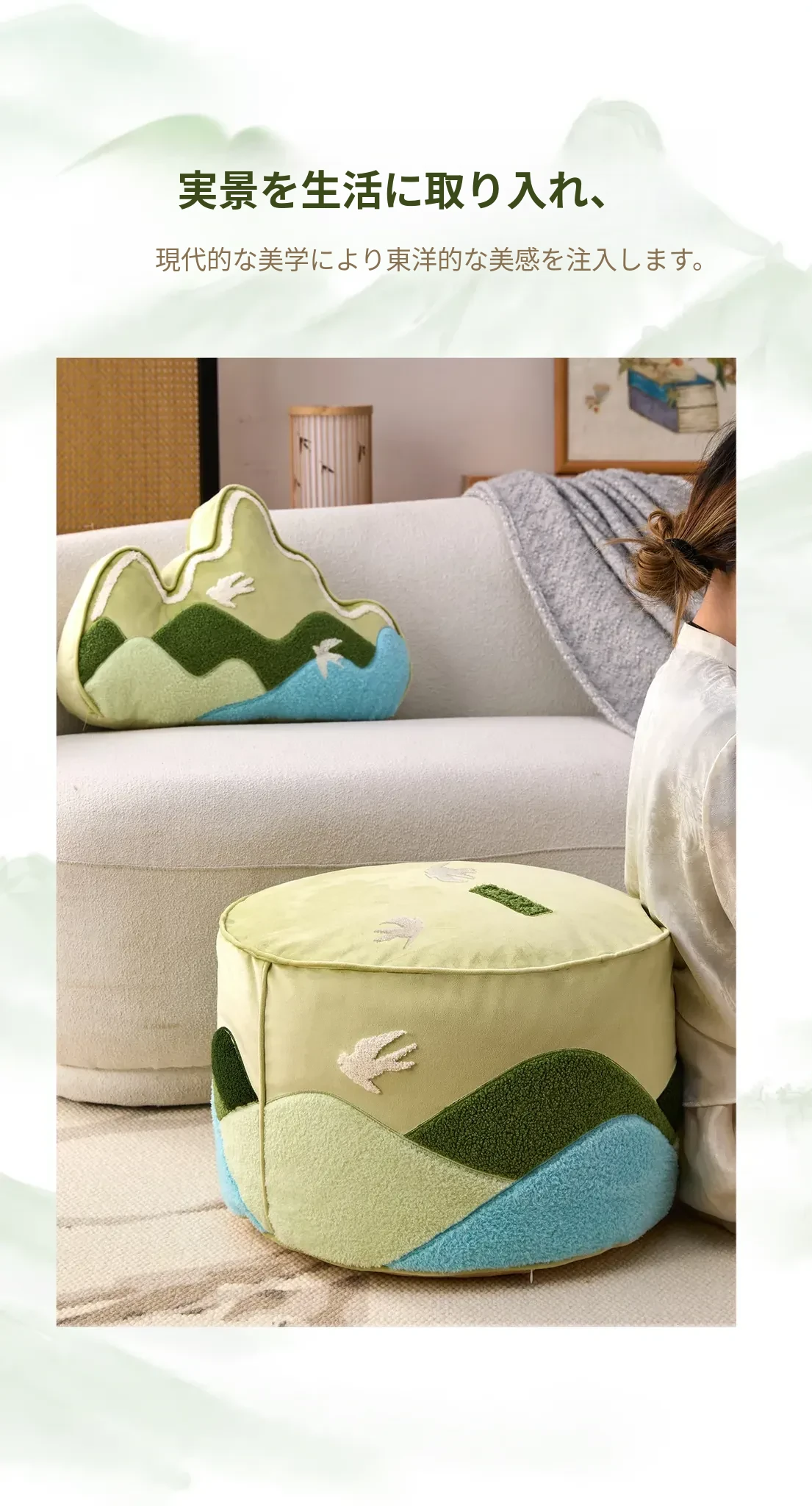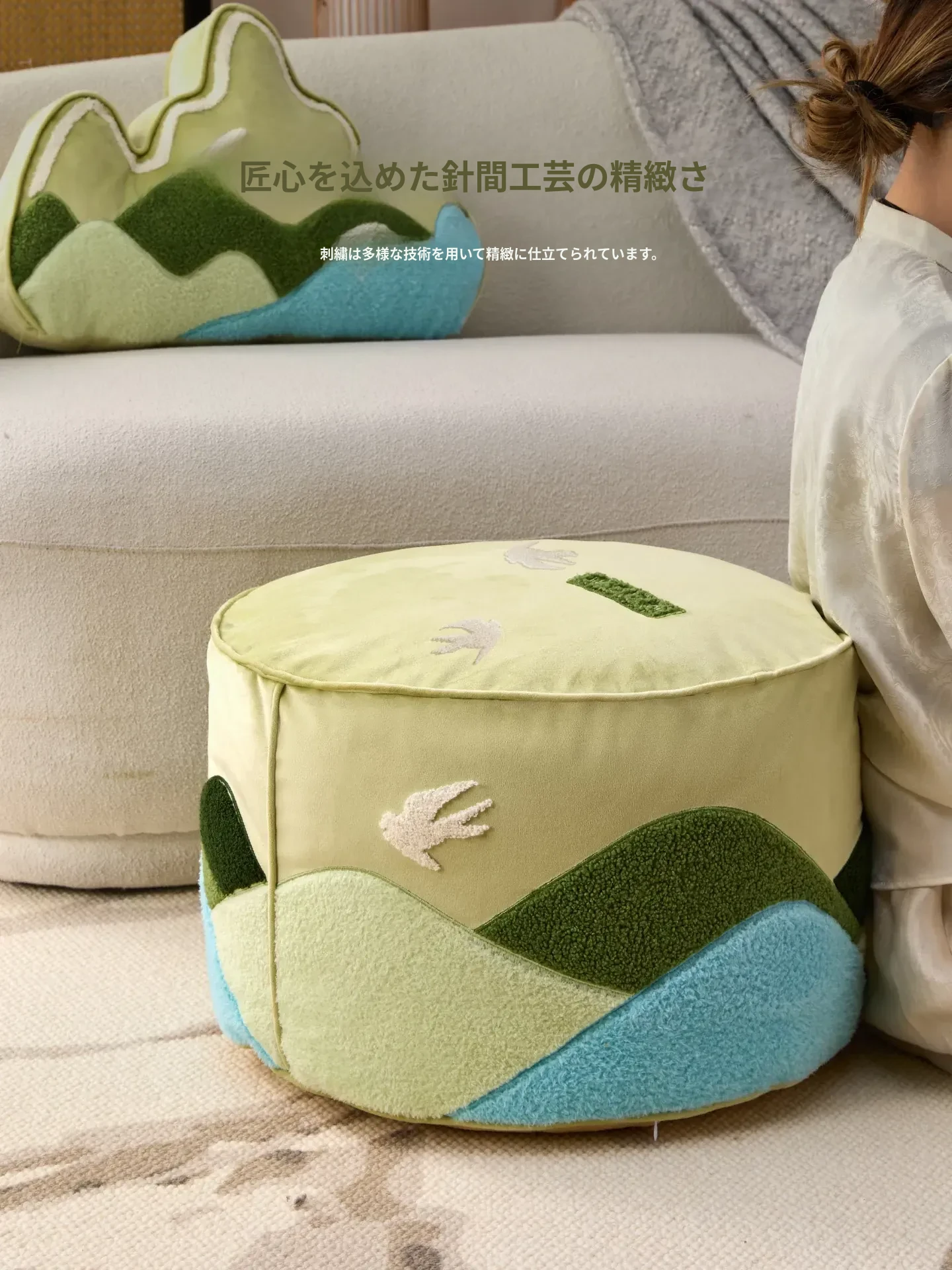 高級文創デザインのクッションセット|リビングやソファにぴったり!楽な姿勢でくつろげる蒲団型、タタミにも最適。取り外して洗える刺繍クッションで、清潔感とおしゃれを両立。