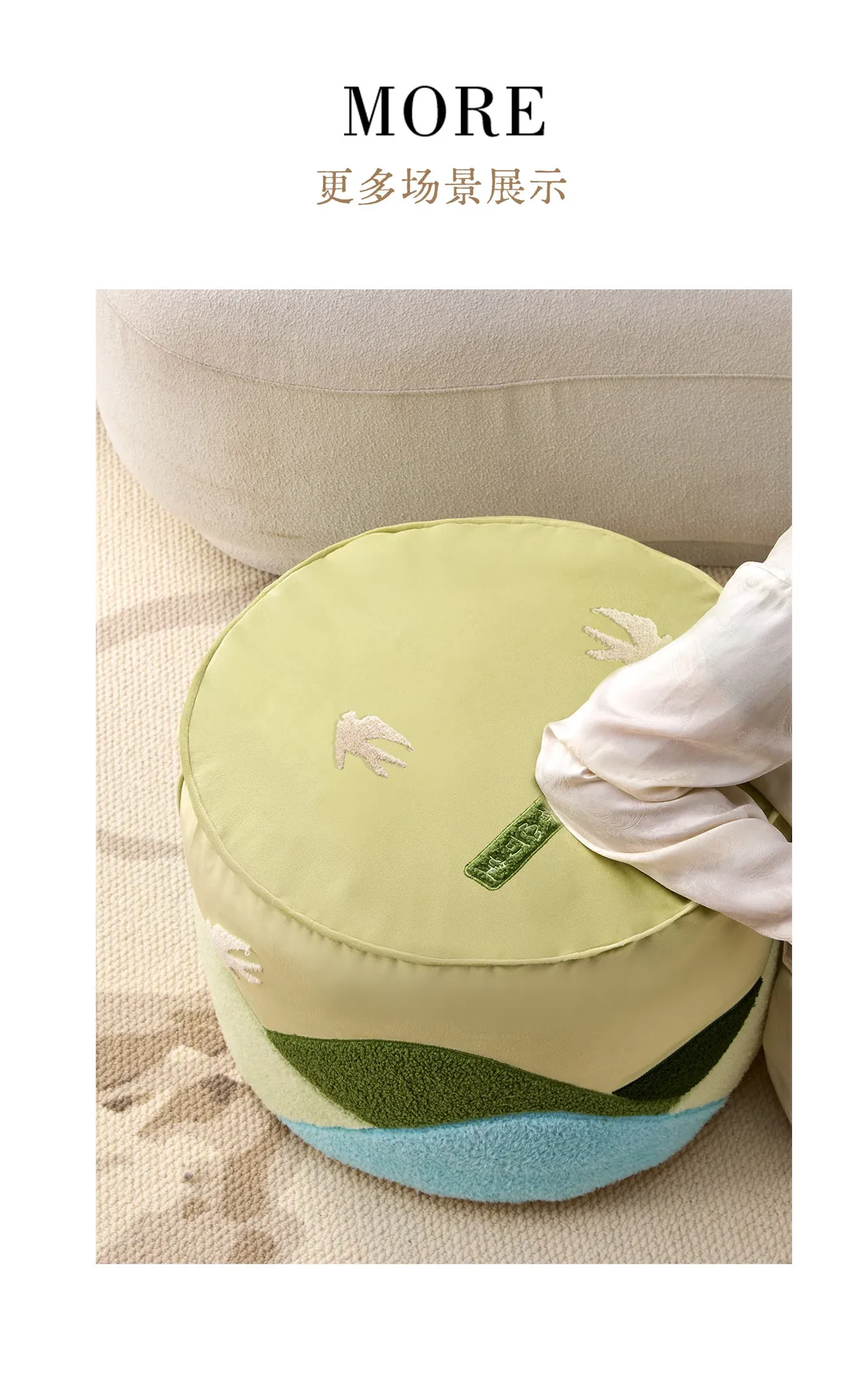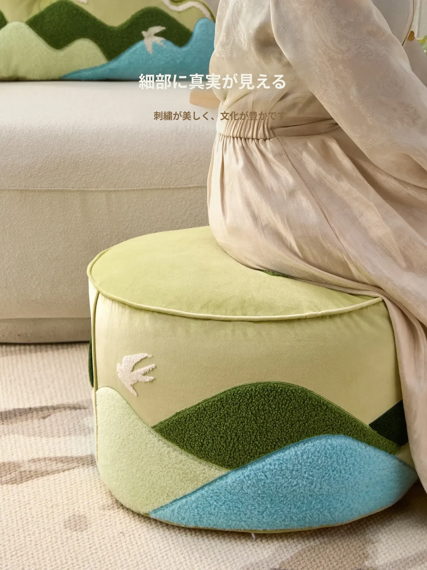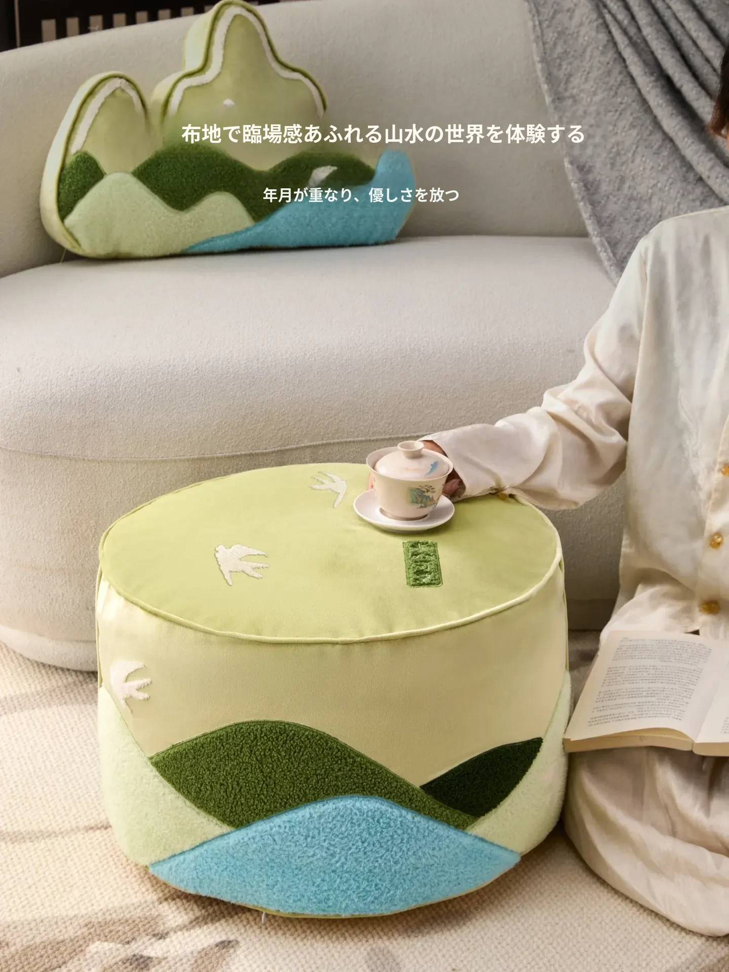 高級文創デザインのクッションセット|リビングやソファにぴったり!楽な姿勢でくつろげる蒲団型、タタミにも最適。取り外して洗える刺繍クッションで、清潔感とおしゃれを両立。