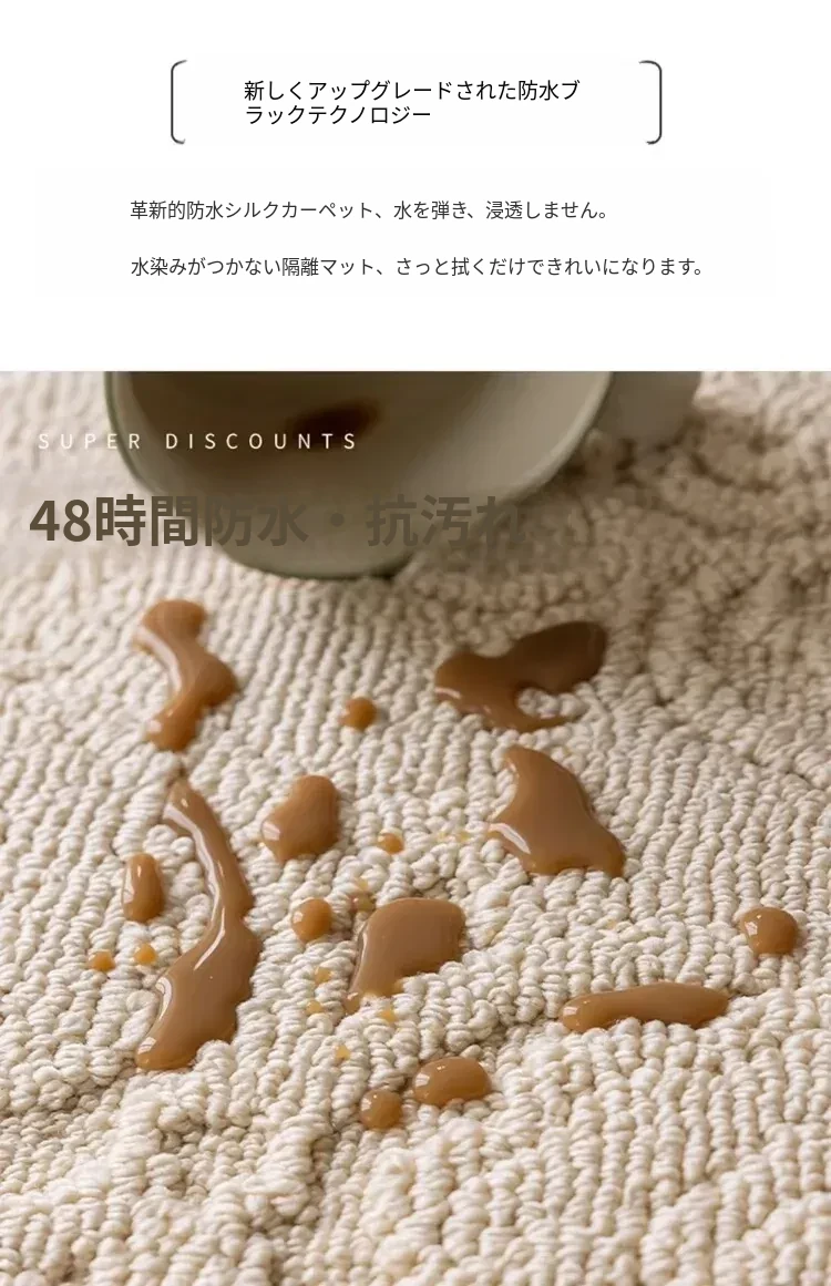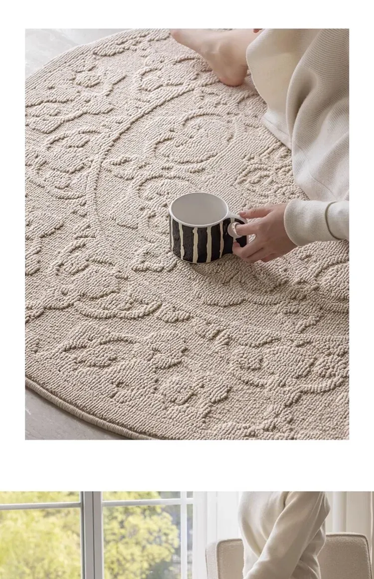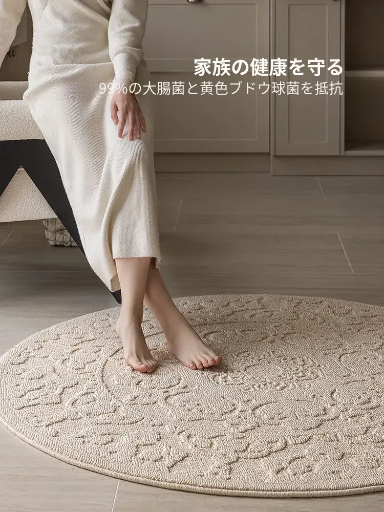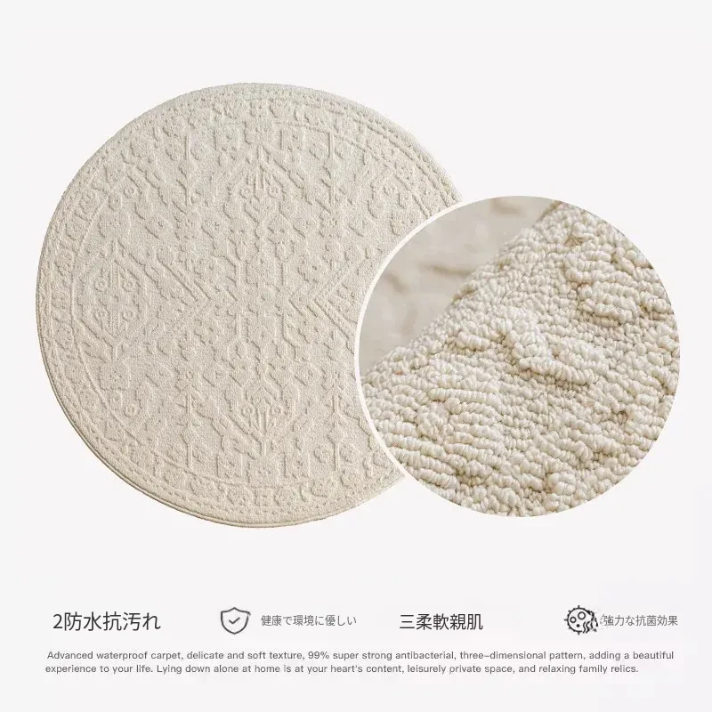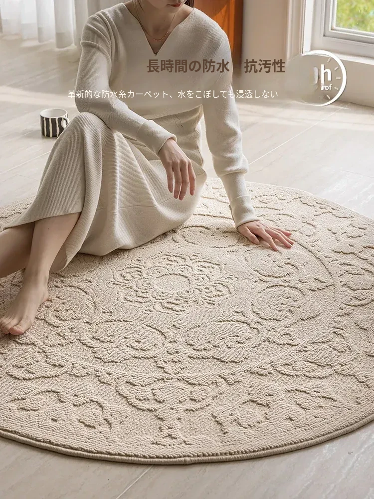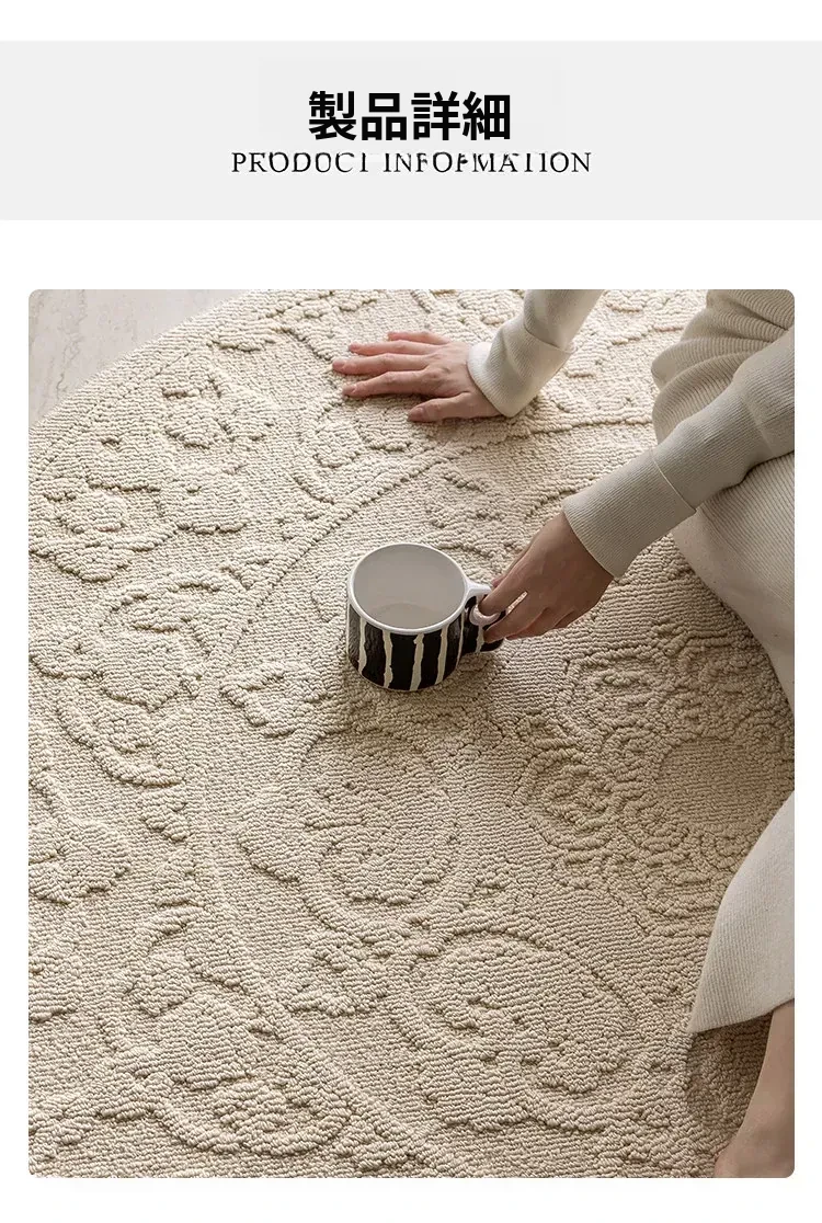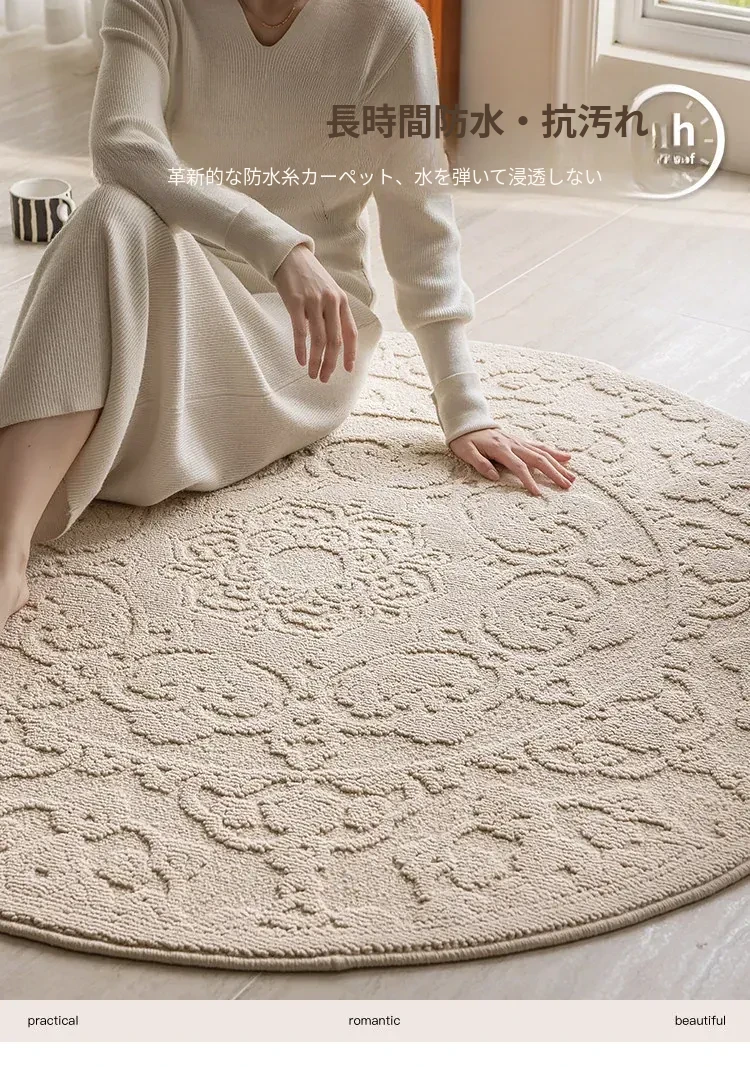 和の美しさを感じる侘寂インス風ラウンドカーペット - 防水・防汚機能付きで、リビングや寝室にぴったり!高級感漂う軽やかなデザインで、ソファやテーブルの下に最適。あなたの空間を一層素敵に演出します。