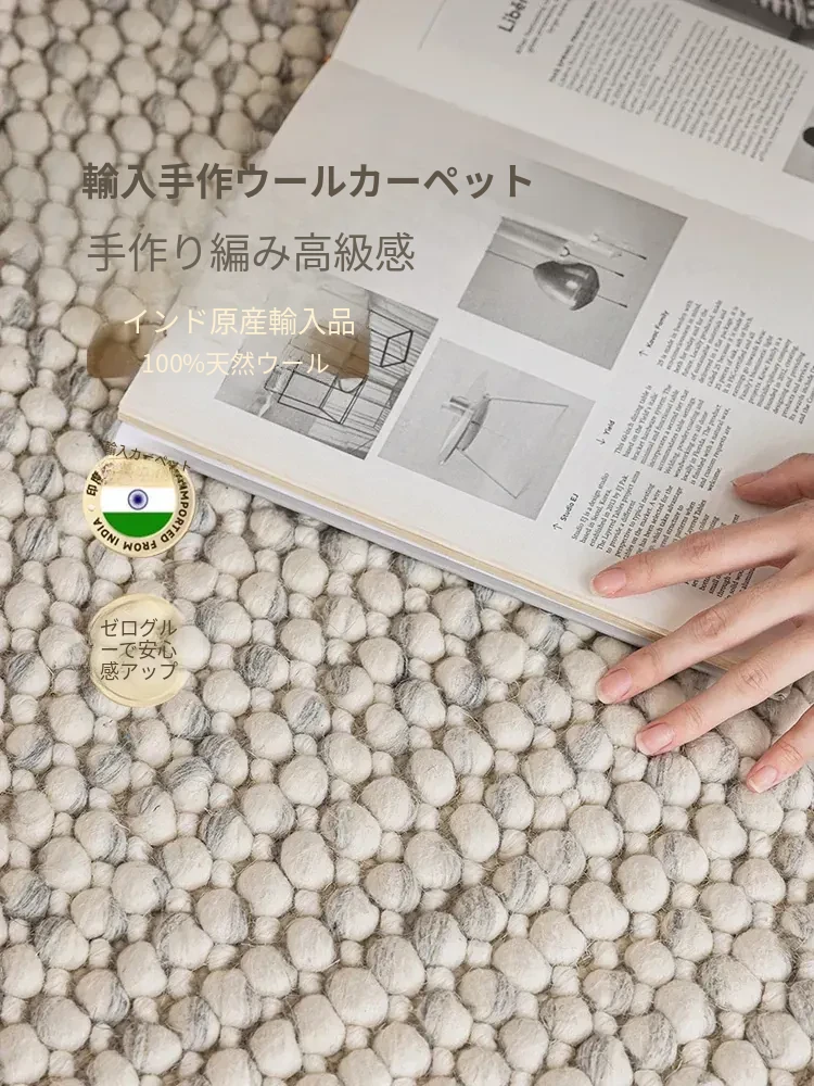 【インド直輸入】手作りウール織りカーペット 高級クリーム色の侘び寂び風 リビング・寝室に最適な無接着剤ラグ