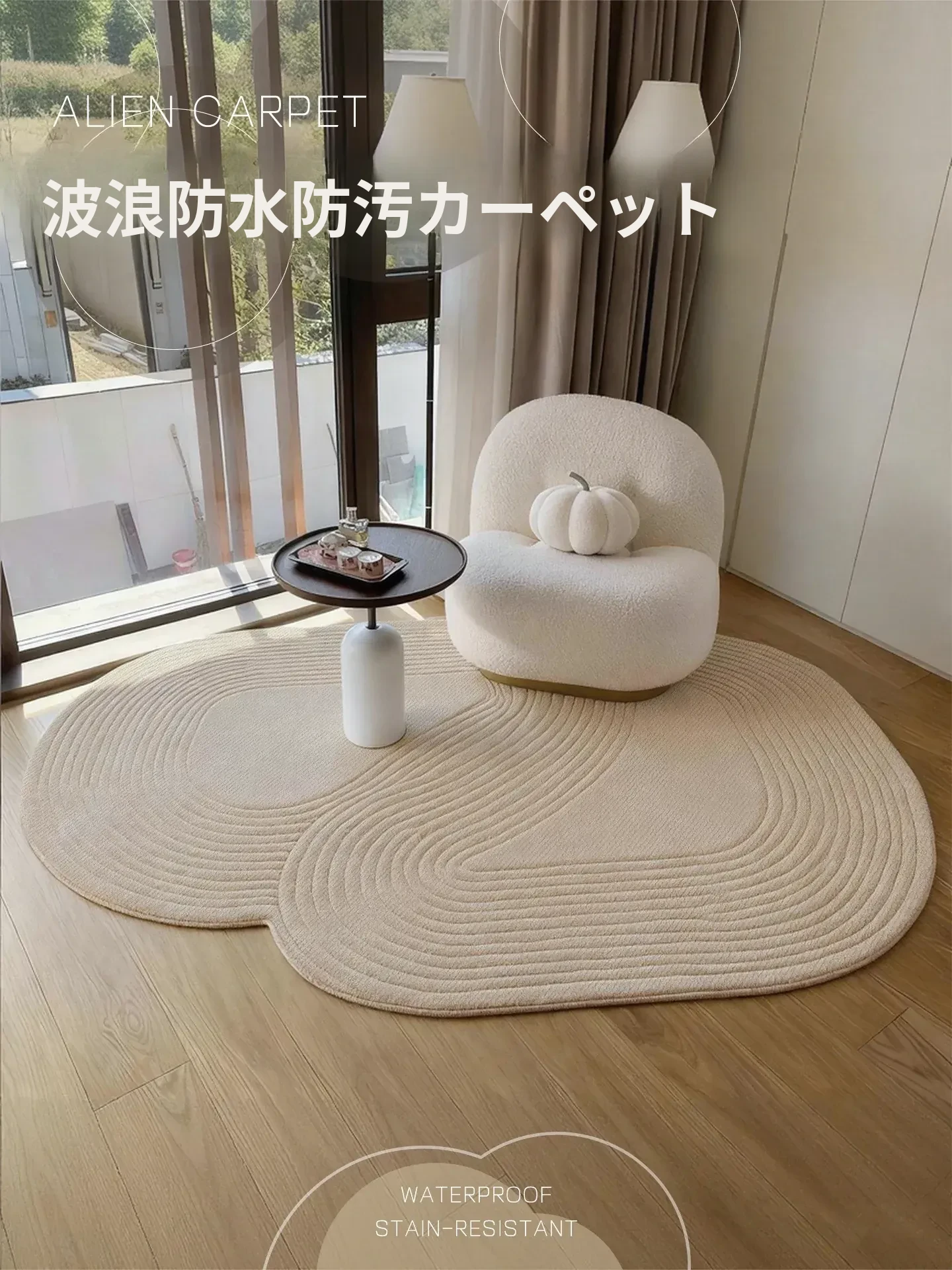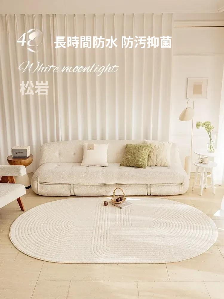 フランス風防水防汚リビングルームラグ・エレガントなクリームカラー・不規則なオーバルデザイン・ソファやテーブルに最適・音を吸収するベッドサイドマットで、快適な空間を演出!