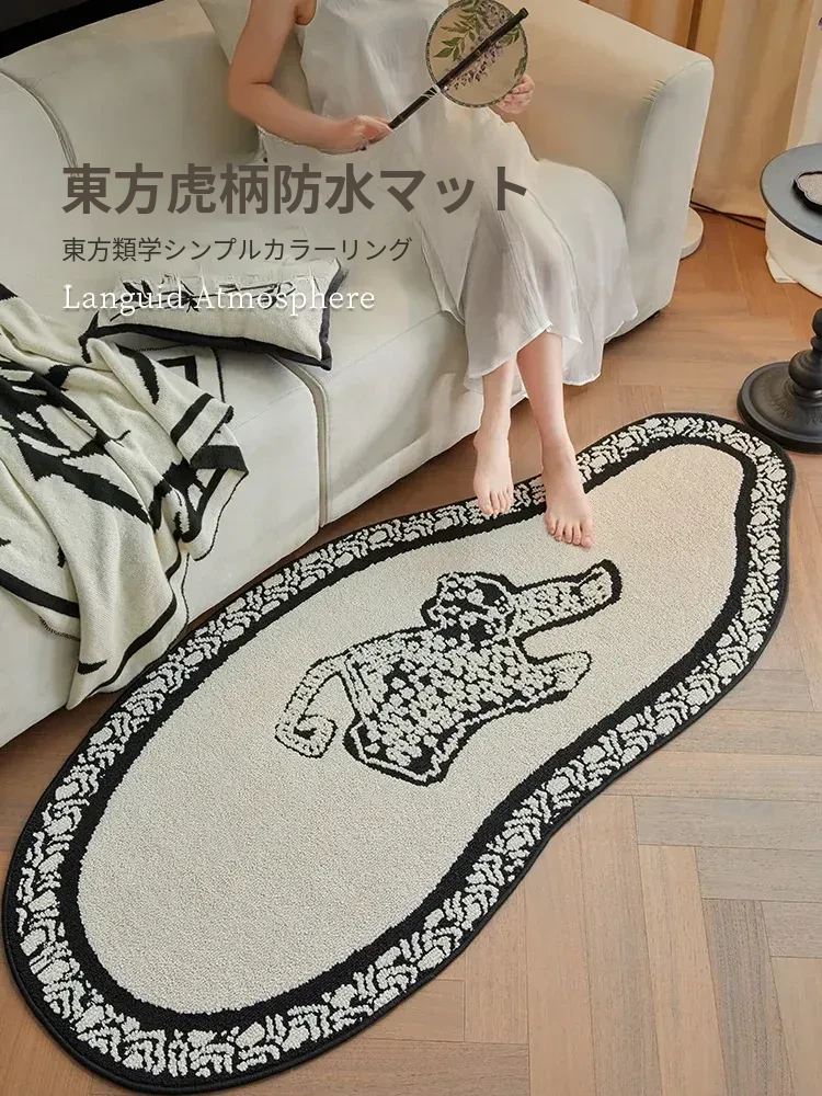 フレンチアンティーク風のブラック&ホワイト不規則形状の防水&防汚ベッドサイドマット!おしゃれで実用的、寝室やリビングにぴったりのソファやベッドのアクセントに最適です。