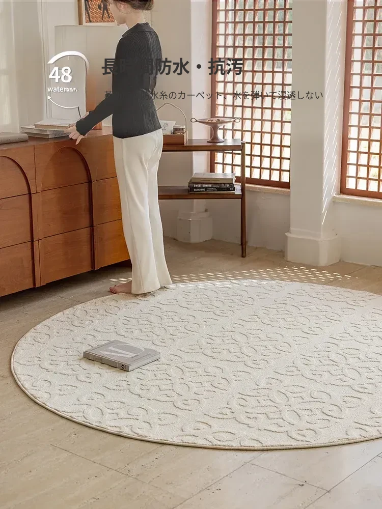 フレンチクリーム風ラウンドカーペット - お手入れ簡単で耐汚れ!高級感あふれるリビングの必需品、ソファやテーブルの下にぴったりな軽やかなラグ。優雅な空間を演出します!