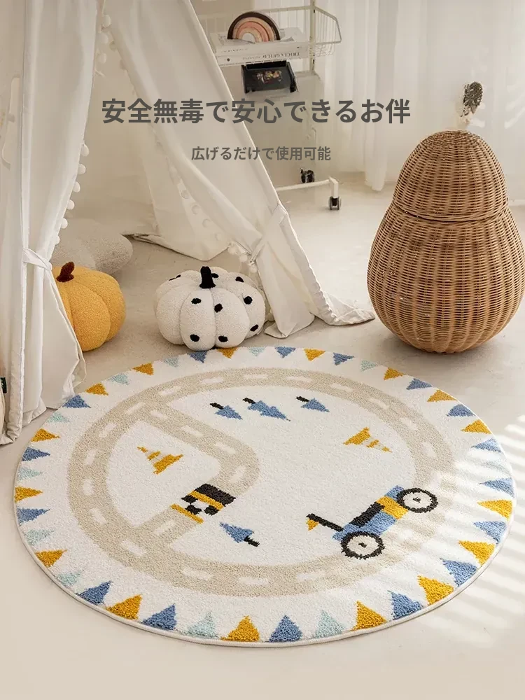 子供部屋にぴったり!かわいいカートゥーンデザインの丸型ラグ。リビングや寝室、読書スペース、ゲームエリアに最適な厚手のクッションマット。快適なクローリングスペースを提供し、遊び心満載の空間を演出します。