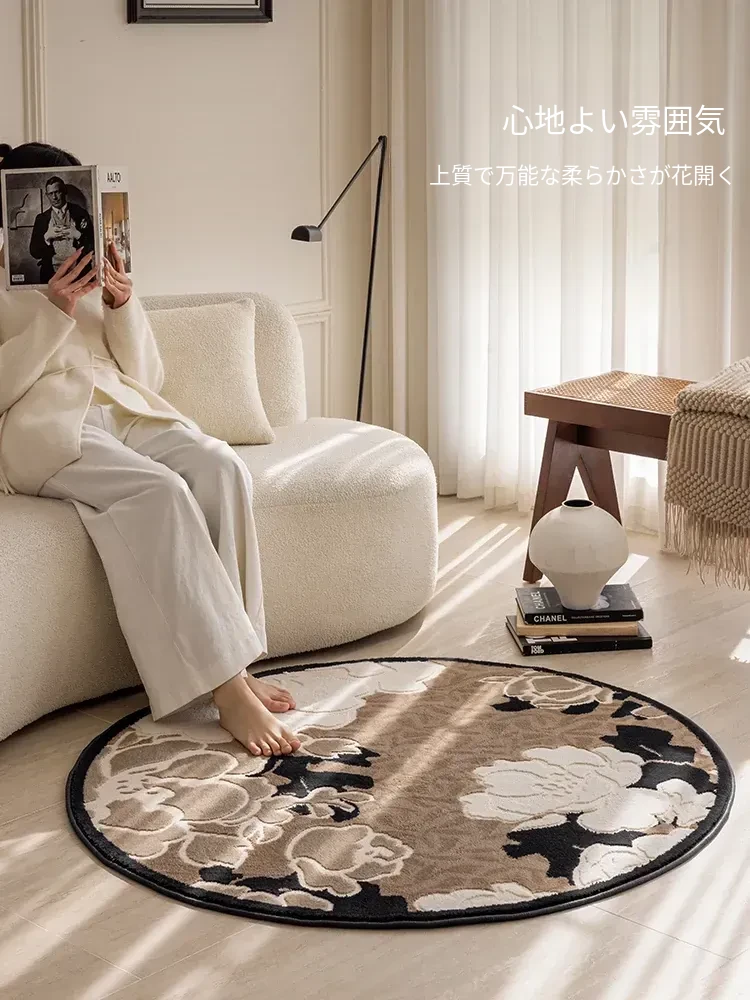 フレンチクリーム風トレンチコートデザインのラウンドカーペット - 寝室やメイクアップチェアにぴったり!リビングルームに優雅さをプラスするラグで、贅沢な高級感を演出するフットマット。